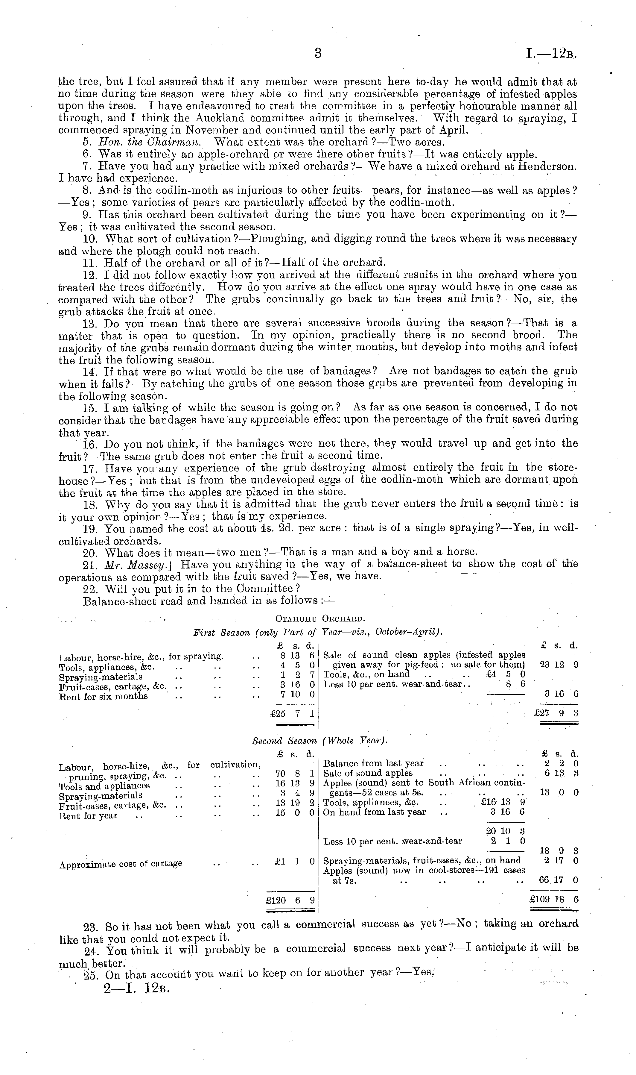 the tree, but I feel assured that if any member were present here to-day he would admit that at no time during the season were they able to find any considerable percentage of infested apples upon the trees. I have endeavoured to treat the committee in a perfectly honourable manner all through, and I think the Auckland committee admit it themselves. With regard to spraying, I commenced spraying in November and continued until the early part of April. 5. Hon. the Chairman.] What extent was the orchard ?—Two acres. 6. Was it entirely an apple-orchard or were there other fruits?—lt was entirely apple. 7. Have you had any practice with mixed orchards ? —We have a mixed orchard at Henderson. I have had experience. 8. And is the codlin-moth as injurious to other fruits—pears, for instance—as well as apples? —Yes ; some varieties of pears are particularly affected by the codlin-moth. 9. Has this orchard been cultivated during the time you have been experimenting on it ?— Yes ; it was cultivated the second season. 10. What sort of cultivation ?—Ploughing, and digging round the trees where it was necessary and where the plough could not reach. 11. Half of the orchard or all of it?— Half of the orchard. 12. I did not follow exactly how you arrived at the different results in the orchard where you treated the trees differently. How do you arrive at the effect one spray would have in one case as compared with the other? The grubs continually go back to the trees and fruit ? —No, sir, the grub attacks the fruit at once. 13. Do you mean that there are several successive broods during the season? —That is a matter that is open to question. In my opinion, practically there is no second brood. The majority of the grubs remain dormant during the winter months, but develop into moths and infect the fruit the following season. 14. If that were so what would be the use of bandages? Are not bandages to catch the grub when it falls ? —By catching the grubs of one season those grubs are prevented from developing in the following season. 15. I am talking of while the season is going on? —As far as one season is concerned, I do not consider that the bandages have any appreciable effect upon the percentage of the fruit saved during that year. 16. Do you not think, if the bandages were not there, they would travel up and get into the f ru it ? —The same grub does not enter the fruit a second time. 17. Have you any experience of the grub destroying almost entirely the fruit in the storehouse?— Yes ; "but that is from the undeveloped eggs of the codlin-moth which are dormant upon the fruit at the time the apples are placed in the store. 18. Why do you say that it is admitted that the grub never enters the fruit a second time : is it your own opinion ?—Yes ; that is my experience. 19. You named the cost at about 4s. 2d. per acre : that is of a single spraying?— Yes, in wellcultivated orchards. 20. What does it mean—two men?— That is a man and a boy and a horse. 21. Mr. Massey.] Have you anything in the way of a balance-sheet to show the cost of the operations as compared with the fruit saved ?—Yes, we have. 22. Will you put it in to the Committee? Balance-sheet read and handed in as follows :— ...' Otahuhu Obchard. First Season (only Part of Tear — viz., October-April). £ s. d. £ s. d. Labour horse-hire, &c, for spraying. .. 8 13 6 Sale of sound clean apples (infested apples Tools appliances, &c. .. .. ■ • 45 0 given away for pig-feed :no sale for them) 23 12 9 Spraying-materials .. •• •• 12 7 Tools, &c, on hand .. ..£450 Fruit-cases, cartage, &c. .. .. .. 316 0 Less 10 per cent, wear-and-tear.. 8 6 Rent for six months .. . • • • 7 10 0 3 16 6 £25 7 1 £27 9 3 Second Season (Whole Year). £ s. d. £ s. d. Labour horse-hire, &c, for cultivation, Balance from last year .. .. .. 22 0 nruning spraying, &c. .. .. • • 70 8 1 Sale of sound apples .. .. .. 613 3 Tools and appliances 16 13 9 Apples (sound) sent to South African contin-Spraying-materials .. .. ■• 3 4 9 gen.ts-52 oases at ss. .. •• •• 13 ° ° Fruit-cases, cartage, &o 13 19 2 Tools, appliances, &o. .. £16 13 9 Rent for year .. •. ■ • .. 15 0 0 On hand from last year .. 316 6 20 10 3 Less 10 per cent, wear-and-tear 2 10 18 9 3 Approximate cost of cartage .. •• £110 Spraying-materials, fruit-cases, &c, on hand 217 0 "" Apples (sound) now m cool-stores —191 cases at 7s. .. .. .. .. 66 17 0 £120 6 9 £109 18 6 23. So it has not been what you call a commercial success as yet ?—No ; taking an orchard like that you could not expect it. „-■__.. .„ , 24. You think it will probably be a commercial success next year !— l anticipate it will be much better. , 25. On that account you want to keep on for another year /—Yes.