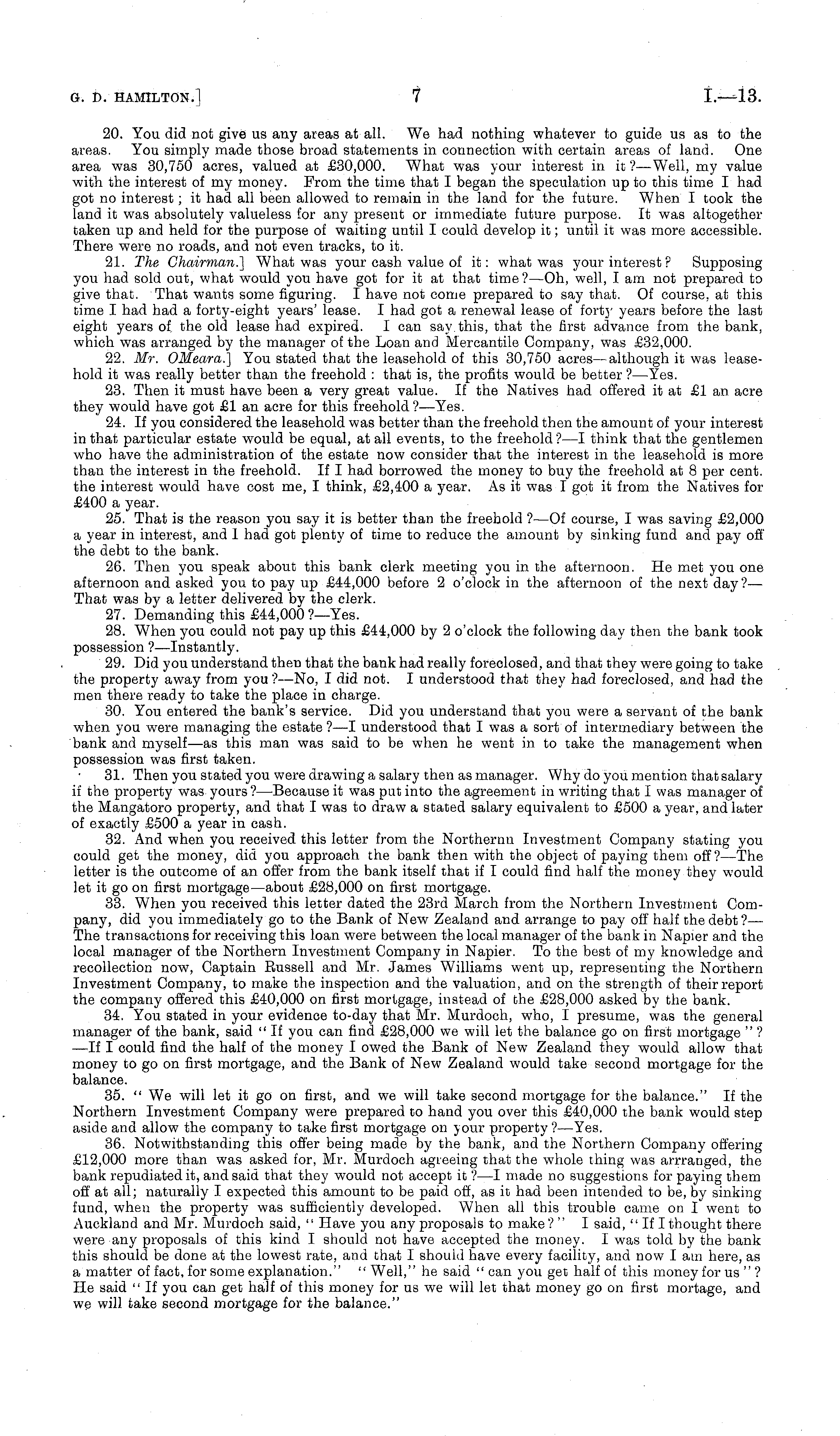 20. You did not give us any areas at all. We had nothing whatever to guide us as to the areas. You simply made those broad statements in connection with certain areas of land. One area was 30,750 acres, valued at £30,000. What was your interest in it ?—Well, my value with the interest of my money. Prom the time that I began the speculation up to this time I had got no interest; it had all been allowed to remain in the land for the future. When I took the land it was absolutely valueless for any present or immediate future purpose. It was altogether taken up and held for the purpose of waiting until I could develop it; until it was more accessible. There were no roads, and not even tracks, to it. 21. The Chairman.'] What was your cash value of it: what was your interest ? Supposing you had sold out, what would you have got for it at that time?—Oh, well, I am not prepared to give that. That wants some figuring. I have not come prepared to say that. Of course, at this time I had had a forty-eight years' lease. I had got a renewal lease of fort] , years before the last eight years of the old lease had expired. I can say. this, that the first advance from the bank, which was arranged by the manager of the Loan and Mercantile Company, was £32,000. 22. Mr. OMeara.] You stated that the leasehold of this 30,750 acres—although it was leasehold it was really better than the freehold : that is, the profits would be better ?—Yes. 23. Then it must have been a very great value. If the Natives had offered it at £1 an acre they would have got £1 an acre for this freehold ?—Yes. 24. If you considered the leasehold was better than the freehold then the amount of your interest in that particular estate would be equal, at all events, to the freehold?—l think that the gentlemen who have the administration of the estate now consider that the interest in the leasehold is more than the interest in the freehold. If I had borrowed the money to buy the freehold at 8 per cent, the interest would have cost me, I think, £2,400 a year. As it was I got it from the Natives for £400 a year. 25. That is the reason you say it is better than the freehold ? —Of course, I was saving £2,000 a year in interest, and 1 had got plenty of time to reduce the amount by sinking fund and pay off the debt to the bank. 26. Then you speak about this bank clerk meeting you in the afternoon. He met you one afternoon and asked you to pay up £44,000 before 2 o'clock in the afternoon of the next day?— That was by a letter delivered by the clerk. 27. Demanding this £44,000 ?—Yes. 28. When you could not pay up this £44,000 by 2 o'clock the following day then the bank took possession ? —lnstantly. 29. Did you understand then that the bank had really foreclosed, and that they were going to take the property away from you? —No, I did not. I understood that they had foreclosed, and had the men there ready to take the place in charge. 30. You entered the bank's service. Did you understand that you were a servant of the bank when you were managing the estate ?—I understood that I was a sort of intermediary between the bank and myself—as this man was said to be when he went in to take the management when possession was first taken. 31. Then you stated you were drawing a salary then as manager. Why do you mention that salary if the property was yours?— Because it was put into the agreement in writing that I was manager of the Mangatoro property, and that I was to draw a stated salary equivalent to £500 a year, and later of exactly £500 a year in cash. 32. And when you received this letter from the Northernn Investment Company stating you could get the money, did you approach the bank then with the object of paying them off?— The letter is the outcome of an offer from the bank itself that if I could find half the money they would let it go on first mortgage —about £28,000 on first mortgage. 33. When you received this letter dated the 23rd March from the Northern Investment Company, did you immediately go to the Bank of New Zealand and arrange to pay off half the debt ?— The transactions for receiving this loan were between the local manager of the bank in Napier and the local manager of the Northern Investment Company in Napier. To the best of my knowledge and recollection now, Captain Russell and Mr. James Williams went up, representing the Northern Investment Company, to make the inspection and the valuation, and on the strength of their report the company offered this £40,000 on first mortgage, instead of the £28,000 asked by the bank. 34. You stated in your evidence to-day that Mr. Murdoch, who, I presume, was the general manager of the bank, said " If you can find £28,000 we will let the balance go on first mortgage " ? —If I could find the half of the money I owed the Bank of New Zealand they would allow that money to go on first mortgage, and the Bank of New Zealand would take second mortgage for the balance. 35. "We will let it go on first, and we will take second mortgage for the balance." If the Northern Investment Company were prepared to hand you over this £40,000 the bank would step aside and allow the company to take first mortgage on your property ?—Yes. 36. Notwithstanding this offer being made by the bank, and the Northern Company offering £12,000 more than was asked for, Mr. Murdoch agreeing that the whole thing was arrranged, the bank repudiated it, and said that they would not accept it ?—I made no suggestions for paying them off at all; naturally I expected this amount to be paid off, as it had been intended to be, by sinking fund, when the property was sufficiently developed. When all this trouble came on I went to Auckland and Mr. Murdoch said, " Have you any proposals to make ? " I said, "If I thought there were any proposals of this kind I should not have accepted the money. I was told by the bank this should be done at the lowest rate, and that I should have every facility