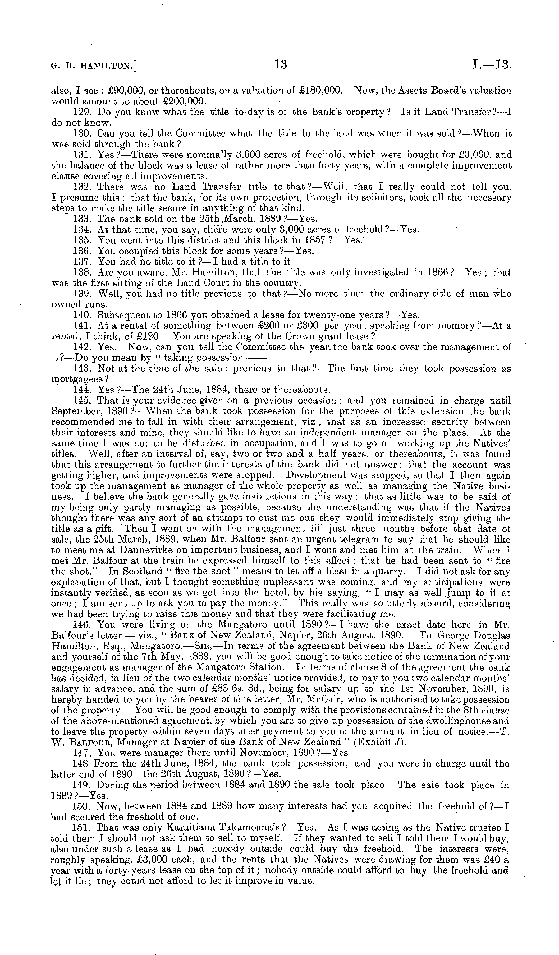also, I see : £90,000, or thereabouts, on a valuation of £180,000. Now, the Assets Board's valuation would amount to about £200,000. 129. Do you know what the title to-day is of the bank's property ? Is it Land Transfer ? —I do not know. 130. Can you tell the Committee what the title to the land was when it was sold ?—When it was sold through the bank ? 131. Yes? —There were nominally 3,000 acres of freehold, which were bought for £3,000, and the balance of the block was a lease of rather more than forty years, with a complete improvement clause covering all improvements. 132. There was no Land Transfer title to that ?—Well, that I really could not tell you. I presume this : that the bank, for its own protection, through its solicitors, took all the necessary steps to make the title secure in anything of that kind. 133. The bank sold on the 25th March, 1889?— Yes. 134. At that time, you say, there were only 3,000 acres of freehold?— Yes. 135. You went into this district and this block in 1857 ?— Yes. 136. You occupied this block for some years ?—Yes. 137. You had no title to it ? —I had a title to it. 138. Are you aware, Mr. Hamilton, that the title was only investigated in 1866?— Yes ; that was the first sitting of the Land Court in the country. 139. Well, you had no title previous to that ? —No more than the ordinary title of men who owned runs. 140. Subsequent to 1866 you obtained a lease for twenty-one years ? —Yes. 141. At a rental of something between £200 or £300 per year, speaking from memory?—At a rental, I think, of £120. You are speaking of the Crown grant lease ? 142. Yes. Now, can you tell the Committee the year, the bank took over the management of it? —Do you mean by " taking possession 143. Not at the time of the sale : previous to that ?—The first time they took possession as mortgagees ? 144. Yes ?—The 24th June, 1884, there or thereabouts. 145. That is your evidence given on a previous occasion ; and you remained in charge until September, 1890?— When the bank took possession for the purposes of this extension the bank recommended me to fall in with their arrangement, viz,, that as an increased security between their interests and mine, they should like to have an independent manager on the place. At the same time I was not to be disturbed in occupation, and I was to go on working up the Natives' titles. Well, after an interval of, say, two or two and a half years, or thereabouts, it was found that this arrangement to further the interests of the bank did not answer; that the account was getting higher, and improvements were stopped. Development was stopped, so that I then again took up the management as manager of the whole property as well as managing the Native business. I believe the bank generally gave instructions in this way : that as little was to be said of my being only partly managing as possible, because the understanding was that if the Natives 'thought there was any sort of an attempt to oust me out they would immediately stop giving the title as a gift. Then I went on with the management till just three months before that date of sale, the 25th March, 1889, when Mr. Balfour sent an urgent telegram to say that he should like to meet me at Dannevirke on important business, and I went and met him at the train. When I met Mr. Balfour at the train he expressed himself to this effect: that he had been sent to " fire the shot." In Scotland " fire the shot " means to let off a blast in a quarry. I did not ask for any explanation of that, but I thought something unpleasant was coming, and my anticipations were instantly verified, as soon as we got into the hotel, by his saying, " I may as well jump to it at once ; lam sent up to ask you to pay the money." This really was so utterly absurd, considering we had been trying to raise this money and that they were facilitating me. 146. You were living on the Mangatoro until 1890 ?—I have the exact date here in Mr. Balfour's letter — viz., "Bank of New Zealand, Napier, 26th August, 1890. — To George Douglas Hamilton, Esq., Mangatoro.—Sik,—ln terms of the agreement between the Bank of New Zealand and yourself of the 7th May, 1889, you will be good enough to take notice of the termination of your engagement as manager of the Mangatoro Station. In terms of clause Bof the agreement the bank has decided, in lieu of the two calendar months' notice provided, to pay to you two calendar months' salary in advance, and the sum of £83 6s. Bd., being for salary up to the Ist November, 1890, is hereby handed to you by the bearer of this letter, Mr. McCair, who is authorised to take possession of the property. You will be good enough to comply with the provisions contained in the Bth clause of the above-mentioned agreement, by which you are to give up possession of the dwellinghouse and to leave the property within seven days after payment to you of the amount in lieu of notice.—T. W. Balfoub, Manager at Napier of the Bank of New Zealand " (Exhibit J). 147. You were manager there until November, 1890?— Yes. 148 From the 24th June, 1884, the bank took possession, and you were in charge until the latter end of 1890—the 26th August, 1890?— Yes. 149. During the period between 1884 and 1890 the sale took place. The sale took place in 1889 ?—Yes. 150. Now, between 1884 and 1889 how many interests had you acquired the freehold of ?—I had secured the freehold of one. 151. That was only Karaitiana Takamoana's?—Yes. As I was acting as the Native trustee I told them I should not ask them to sell to myself. If they wanted to sell I told them I would buy, also under such a lease as I had nobody outside could buy the freehold. The interests were, roughly speaking, £3,000 each, and the rents that the Natives were drawing for them was £40 a year with a forty-years lease on the top of it; nobody outside could afford to buy the freehold and let it lie; they could not afford to let it i