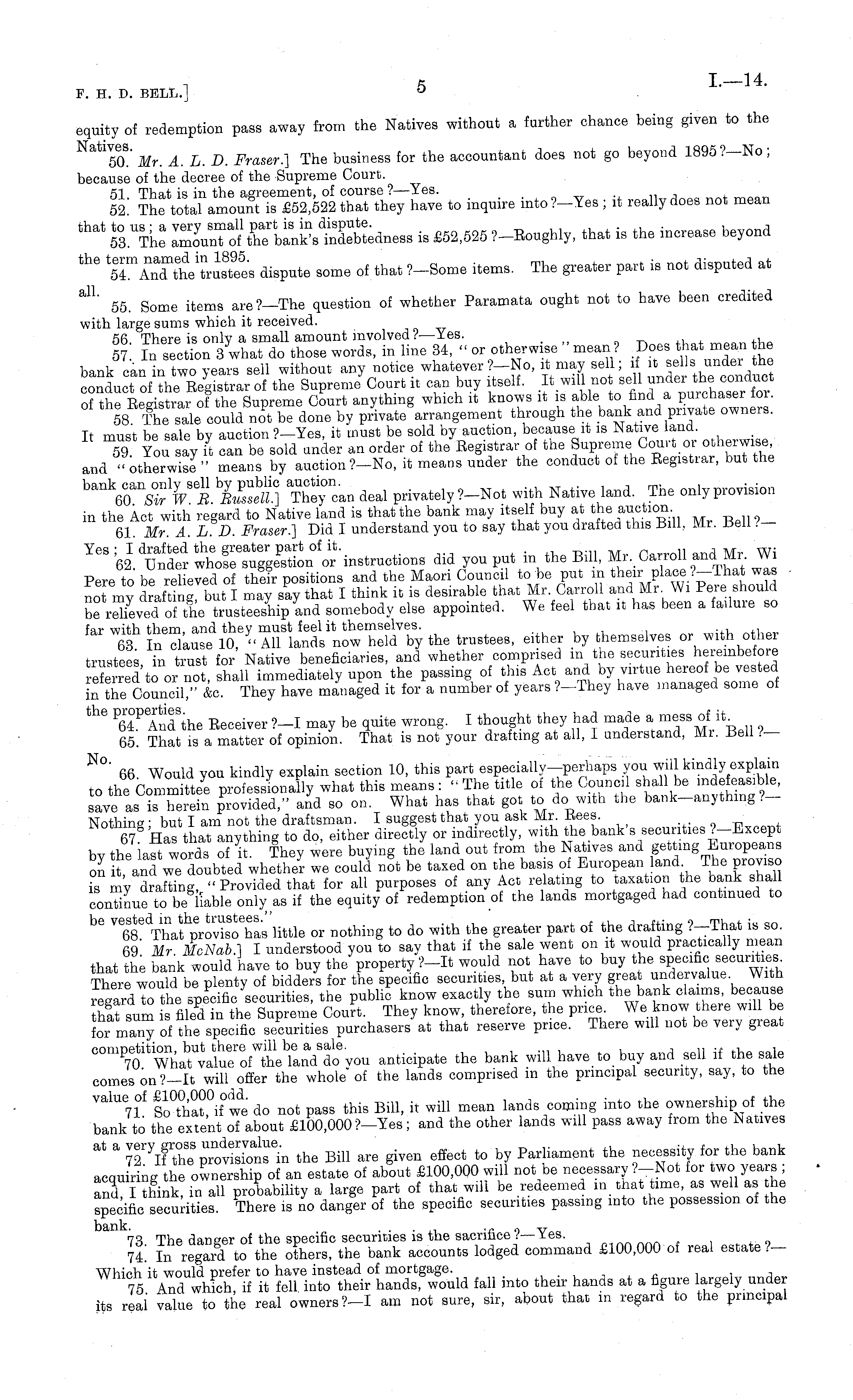 equity of redemption pass away from the Natives without a further chance being given to the Natl 50 S ' Mr. A. L. D. Fraser.] The business for the accountant does not go beyond 1895 ?—No; because of the decree of the Supreme Court. ll' thTtW Se to inquire into ?-Yes ; it really does not mean that 5°3 U The a ILVnTSrtlU'sSStedness is £52,525 ?-Bou g hly, that is the increase beyond the I"tt tuTes dispute some of that ?-Some items. The greater part is not disputed at aIL 55. Some items are?-The question of whether Paramata ought not to have been credited with large sums which it received. 56 There is onlv a small amount involved ?—Yes. - 57' In section 3what do those words, in line 34, «' or otherwise mean? Does that mean he bank can in two years sell without any notice whatever ?-No, it may sell; if it sells under the Suet of the Be'gistrar of the SuprenJcourt it can buy itself. .^^.^f^X of the Registrar of the Supreme Court anything which it knows it is able to find a purchaser tor. 58 The sale could not be done by private arrangement through the bank and private owners. Tt must be sale bv auction ?—Yes, it must be sold by auction, because it is JNative land. 59 You say it s sold under an order of the Registrar of the Supreme Court or otherwise, and << otherwise " means by auction ?-No, it means under the conduct of the Registrar, but the bank 60 an^V e i l IS They "can deal privately ?-Not with Native land. The only provision in the Act with regard to Native land is that the bank may itself buy at the auction 61 Mr A L D Fraser.] Did I understand you to say that you drafted this Bill, Mr. Bell !— Y6S 62 d L a nd e er Itfe^stlon'or'instructions did you put in the Bill, Mr, Carroll and Mr Wi Pere to be relieved of their positions and the Maori Council to be put m their place ?-That was not my drafting but I may say that I think it is desirable that Mr. Carroll and Mr Wi Pere should be rSve"l of the trusteeship and somebody else appointed. We feel that it has been a failure so far with them, and they must feel it themselves. 63 In clause 10, " All lands now held by the trustees, either by themselves or with other trustees in trust for Native beneficiaries, and whether comprised in the securities hereinbefore referred to or not, shall immediately upon the passing of this Act and by virtue hereof be vested in the Council," &c. They have managed it for a number of years ?-They have managed some of the Pf°P^ t Receiver 7 _ l be ite wrong T ht th ey had made a mess of it 65. That is a matter of opinion. That is not your drafting at all, I understand, Mr. Bell ?- N °' 66 Would you kindly explain section 10, this part especially-perhaps you will kindly explain to the Committee professionally what this means: "The title of the Council shall be indefeasible, save as is herein provided," and so on. What has that got to do with the bank-anything ?- Nothing; but lam not the draftsman. I suggest that you ask Mr. Kees. ***„,«. 67 Has that anything to do, either directly or indirectly, with the bank s securities ?-Excep bv the last words of it. They were buying the land out from the Natives and getting Europeans on t and we doubted whether we could not be taxed on the basis of European land The proviso is mv drafting, " Provided that for all purposes of any Act relating to taxation the bank shall continue to be iiable only as if the equity of redemption of the lands mortgaged had continued to b6 V S e UVt h p e roris S o e hashttle or nothing to do with the greater part of the drafting ?-That is so. 69' Mr McNab.] I understood you to say that if the sale went on it would practically mean that the bank would have to buy the property ?-It would not have to buy the specific There would be plenty of bidders for the specific securities, but at a very great undervalue. With regard To the pelific securities, the public know exactly the sum which the bank claims, because St sum is filed in the Supreme Court. They know, therefore, the price We know there will be for many of the specific securities purchasers at that reserve price. There will not be very great anticipate the bank will have. to. buy and sell if the sale comes on?—lt will offer the whole of the lands comprised in the principal security, say, to the ValU< 7l of toTai o if°we do not pass this Bill, it will mean lands coming into the ownership of the bank to the extent of about £100,000 ?-Yes; and the other lands will pass away from the Natives at ' m the Bill are given effect to by Parliament the necessity for the bank acquiring the ownership of an estate of about £100,000 will not be necessary ?-Not for two years ; and I think, in all probability a large part of that will be redeemed m. that time, as well as he specific securities. There is no danger of the specific securities passing into the possession of the 73 The danger of the specific securities is the sacrifice ?—Yes. 74! In regard to the others, the bank accounts lodged command £100,000 of real estate ?- Which it would prefer to have instead of mortgage. , ~ . i c , , A 75 AM which, if it fell into their hands, would fall into their hands at a figure largely under its real value to the real owners?-! am not sure, sir, about that in regard to the principal