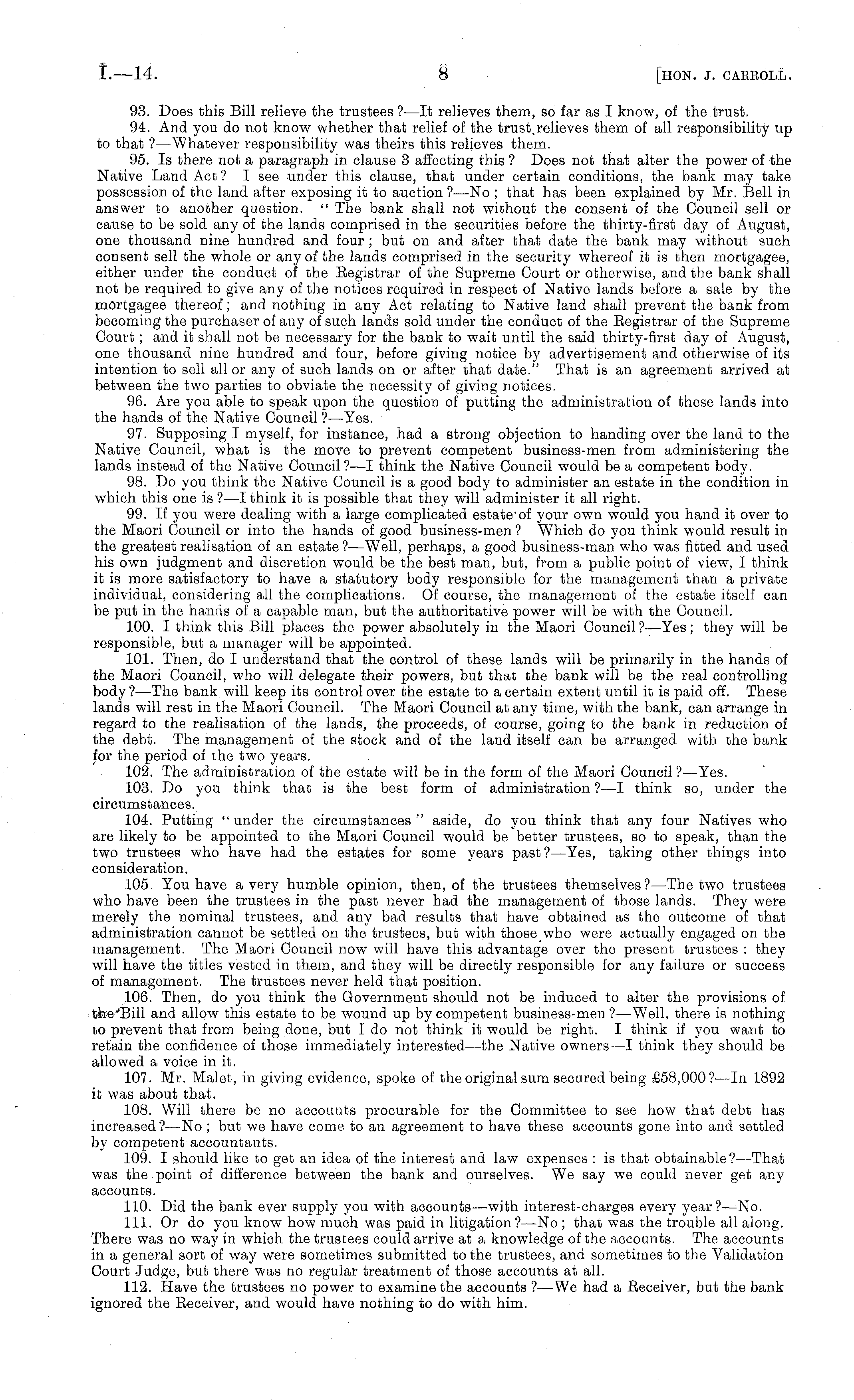 93. Does this Bill relieve the trustees ?—lt relieves them, so far as I know, of the trust. 94. And you do not know whether that relief of the trust,relieves them of all responsibility up to that ? —Whatever responsibility was theirs this relieves them. 95. Is there not a paragraph in clause 3 affecting this ? Does not that alter the power of the Native Land Act ? I see under this clause, that under certain conditions, the bank may take possession of the land after exposing it to auction ?—No ; that has been explained by Mr. Bell in answer to another question. " The bank shall not without the consent of the Council sell or cause to be sold any of the lands comprised in the securities before the thirty-first day of August, one thousand nine hundred and four ; but on and after that date the bank may without such consent sell the whole or any of the lands comprised in the security whereof it is then mortgagee, either under the conduct of the Registrar of the Supreme Court or otherwise, and the bank shall not be required to give any of the notices required in respect of Native lands before a sale by the mortgagee thereof; and nothing in any Act relating to Native land shall prevent the bank from becoming the purchaser of any of such lands sold under the conduct of the Registrar of the Supreme Court; and it shall not be necessary for the bank to wait until the said thirty-first day of August, one thousand nine hundred and four, before giving notice by advertisement and otherwise of its intention to sell all or any of such lands on or after that date." That is an agreement arrived at between the two parties to obviate the necessity of giving notices. 96. Are you able to speak upon the question of putting the administration of these lands into the hands of the Native Council ?—Yes. 97. Supposing I myself, for instance, had a strong objection to handing over the land to the Native Council, what is the move to prevent competent business-men from administering the lands instead of the Native Council ? —I think the Native Council would be a competent body. 98. Do you think the Native Council is a good body to administer an estate in the condition in which this one is ?—I think it is possible that they will administer it all right. 99. If you were dealing with a large complicated estate'of your own would you hand it over to the Maori Council or into the hands of good business-men ? Which do you think would result in the greatest realisation of an estate ?—Well, perhaps, a good business-man who was fitted and used his own judgment and discretion would be the best man, but, from a public point of view, I think it is more satisfactory to have a statutory body responsible for the management than a private individual, considering all the complications. Of course, the management of the estate itself can be put in the hands of a capable man, but the authoritative power will be with the Council. 100. I think this Bill places the power absolutely in the Maori Council ?—Yes; they will be responsible, but a manager will be appointed. 101. Then, do I understand that the control of these lands will be primarily in the hands of the Maori Council, who will delegate their powers, but that the bank will be the real controlling body ?—The bank will keep its control over the estate to a certain extent until it is paid off. These lands will rest in the Maori Council. The Maori Council at any time, with the bank, can arrange in regard to the realisation of the lands, the proceeds, of course, going to the bank in reduction of the debt. The management of the stock and of the land itself can be arranged with the bank for the period of the two years. 102. The administration of the estate will be in the form of the Maori Council?—Yes. 103. Do you think that is the best form of administration ?—I think so, under the circumstances. 104. Putting "under the circumstances" aside, do you think that any four Natives who are likely to be appointed to the Maori Council would be better trustees, so to speak, than the two trustees who have had the estates for some years past ?—Yes, taking other things into consideration. 105 You have a very humble opinion, then, of the trustees themselves? —The two trustees who have been the trustees in the past never had the management of those lands. They were merely the nominal trustees, and any bad results that have obtained as the outcome of that administration cannot be settled on the trustees, but with those who were actually engaged on the management. The Maori Council now will have this advantage over the present trustees : they will have the titles vested in them, and they will be directly responsible for any failure or success of management. The trustees never held that position. 106. Then, do you think the Government should not be induced to alter the provisions of the Bill and allow this estate to be wound up by competent business-men? —Well, there is nothing to prevent that from being done, but Ido not think it would be right. I think if you want to retain the confidence of those immediately interested —the Native owners—l think they should be allowed a voice in it. 107. Mr. Malet, in giving evidence, spoke of the original sum secured being £58,000? —In 1892 it was about that. 108. Will there be no accounts procurable for the Committee to see how that debt has increased? —No ; but we have come to an agreement to have these accounts gone into and settled by competent accountants. 109. I should like to get an idea of the interest and law expenses : is that obtainable?—That was the point of difference between the bank and ourselves. We say we could never get any accounts. 110. Did the bank ever supply you with accounts—with interest-charges every year?—No. 111. Or do you know how much was paid in litigation?—No; that was the trouble all along. There was no way in which the trustees could arrive at a knowledge of the accounts. The accounts in a gen
