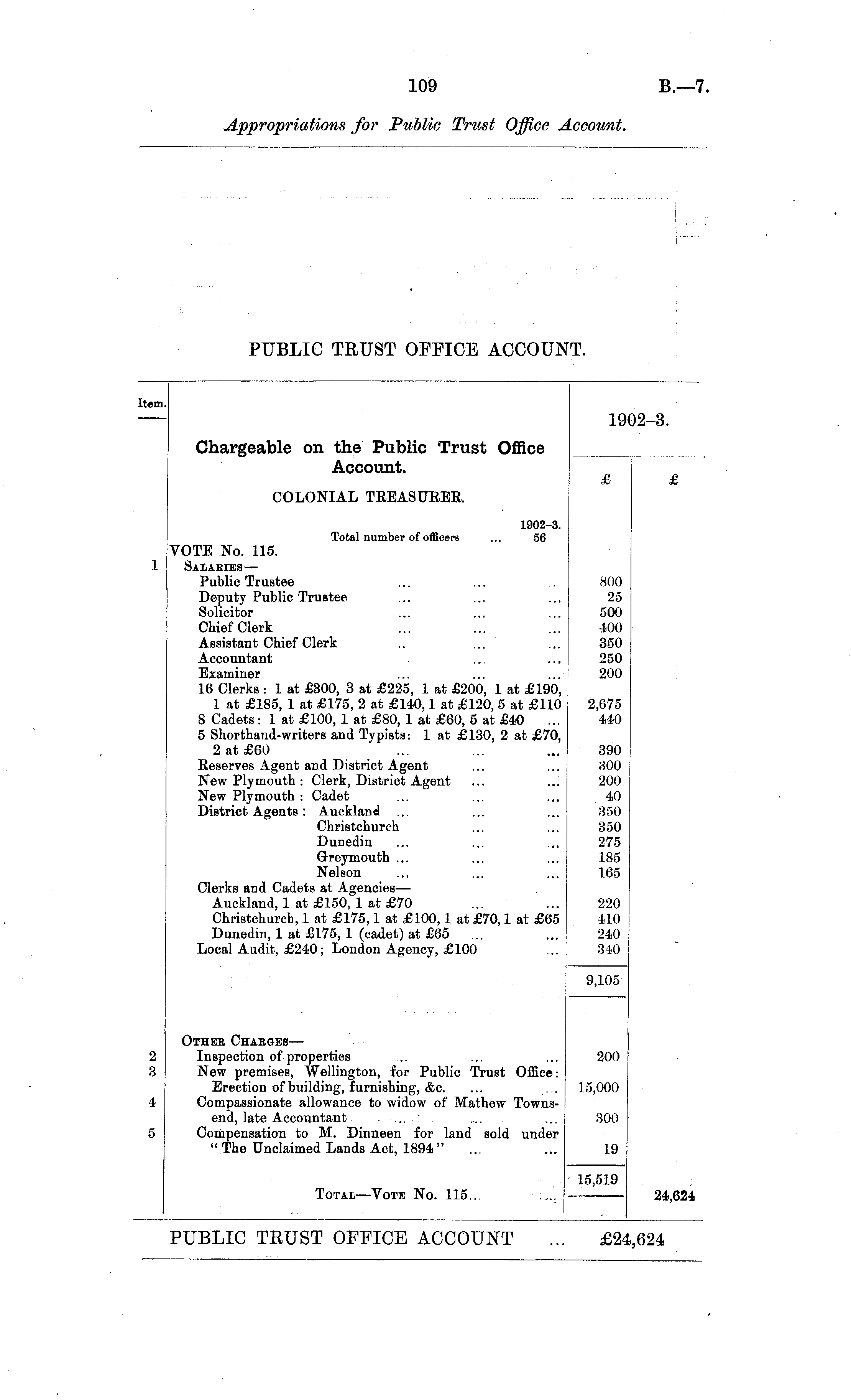 Item. 19 2-3. Chargeable on the Public Trust Office Account. £ £ COLONIAL TREASURER. 1902-3. Total number of officers ... 56 VOTE No. 115. Salaries— Public Trustee Deputy Public Trustee Solicitor Chief Clerk Assistant Chief Clerk Accountant Examiner 16 Clerks : 1 at £300, 3 at £225, 1 at £200, 1 at £190, 1 at £185, 1 at £175, 2 at £140,1 at £120, 5 at £110 8 Cadets -. 1 at £100, 1 at £80, 1 at £60, 5 at £40 5 Shorthand-writers and Typists: 1 at £130, 2 at £70, 2 at £60 Reserves Agent and District Agent New Plymouth : Clerk, District Agent New Plymouth : Cadet District Agents : Auckland Christchurch Dunedin Greymouth ... Nelson Clerks and Cadets at Agencies — Auckland, 1 at £150, 1 at £70 Christchurch, 1 at £175,1 at £100,1 at £70,1 at £65 Dunedin, 1 at £175, 1 (cadet) at £65 Local Audit, £240; London Agency, £100 800 25 500 400 350 250 200 2,675 440 390 300 200 40 350 350 275 185 165 220 410 240 340 9,105 2 3 4 Other Charges— Inspection of properties ... ... ... New premises, Wellington, for Public Trust Office: Erection of building, furnishing, &c. Compassionate allowance to widow of Mathew Townsend, late Accountant ... Compensation to M. Dinneen for land sold under " The Unclaimed Lands Act, 1894 " 200 15,000 5 300 19 15,519 24,624 Total—Vote No. 115... .... PUBLIC TBUST OFFICE ACCOUNT £2 .,624