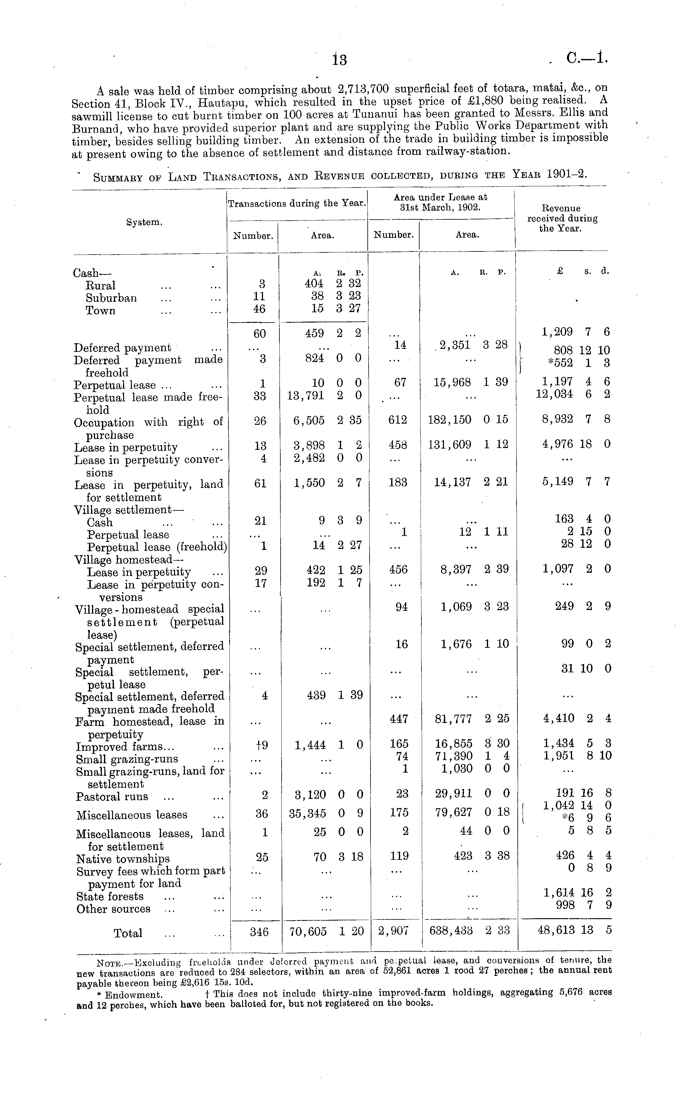 Transactions during the Year. Area under Lease at 31st March, 1902. Revenue received during the Year. System, Number. Number. Area. Area. CashRural Suburban Town 3 11 46 404 38 15 B. P. 2 32 3 23 3 27 A. R. P. £ s. d. Deferred payment Deferred payment made freehold Perpetual lease ... Perpetual lease made freehold 60 459 2 2 .2,351 3 28 1,209 7 6 3 824 0 0 14 I 808 12 10 *552 1 3 1 33 10 0 0 13,791 2 0 67 15,968 1 39 1,197 4 6 12,034 6 2 Occupation with right of purchase Lease in perpetuity Lease in perpetuity conversions Lease in perpetuity, land for settlement Village settlement — Gash Perpetual lease Perpetual lease (freehold) Village homestead — Lease in perpetuity Lease in perpetuity conversions Village - homestead special settlement (perpetual lease) Special settlement, deferred payment Special settlement, perpetul lease Special settlement, deferred payment made freehold Farm homestead, lease in perpetuity Improved farms... Small grazing-runs Small grazing-runs, land for settlement Pastoral runs 26 6,505 2 35 612 182,150 0 15 8,932 7 8 13 4 3,898 1 2 2,482 0 0 458 131,609 1 12 4,976 18 0 61 1,550 2 7 183 14,137 2 21 5,149 7 7 21 9 3 9 12" 1 11 163 4 0 2 15 0 28 12 0 1 1 li" 2 27 29 17 422 1 25 192 1 7 456 8,397 2 39 1,097 2 0 94 1,069 3 23 249 2 9 16 1,676 1 10 99 0 2 31 10 0 4 439 1 39 447 81,777 2 25 4,410 2 4 •1-9 1,444 1 0 165 74 1 16,855 3 30 71,390 1 4 1,030 0 0 1,434 5 3 1,951 8 10 2 3,120 0 0 23 29,911 0 0 ( 1 191 16 8 1,042 14 0 *6 9 6 5 8 5 Miscellaneous leases 36 35,345 0 9 175 79,627 0 18 Miscellaneous leases, land for settlement Native townships Survey fees which form part payment for land State forests Other sources 1 25 0 0 2 44 0 0 25 70 3 18 119 423 3 38 426 4 4 0 8 9 1,614 16 2 998 7 9 Total 346 70,605 1 20 2,907 638,433 2 33 48,613 13 5 Note.—Excluding freeholds new transactions are reduced to payable thereon being £2,616 15s, * Endowment. t Thii and 12 perches, which have been under do! !84 selector 10d. does not i )alloted for, orrc-d payment an ■s, within an area id perpetual lease, and conversions of tenure, the of 52,861 acres 1 rood 27 perches; the annual rent include thirty-nine , but not registered ) improved-farm holdings, aggregating 5,676 acres on the books.