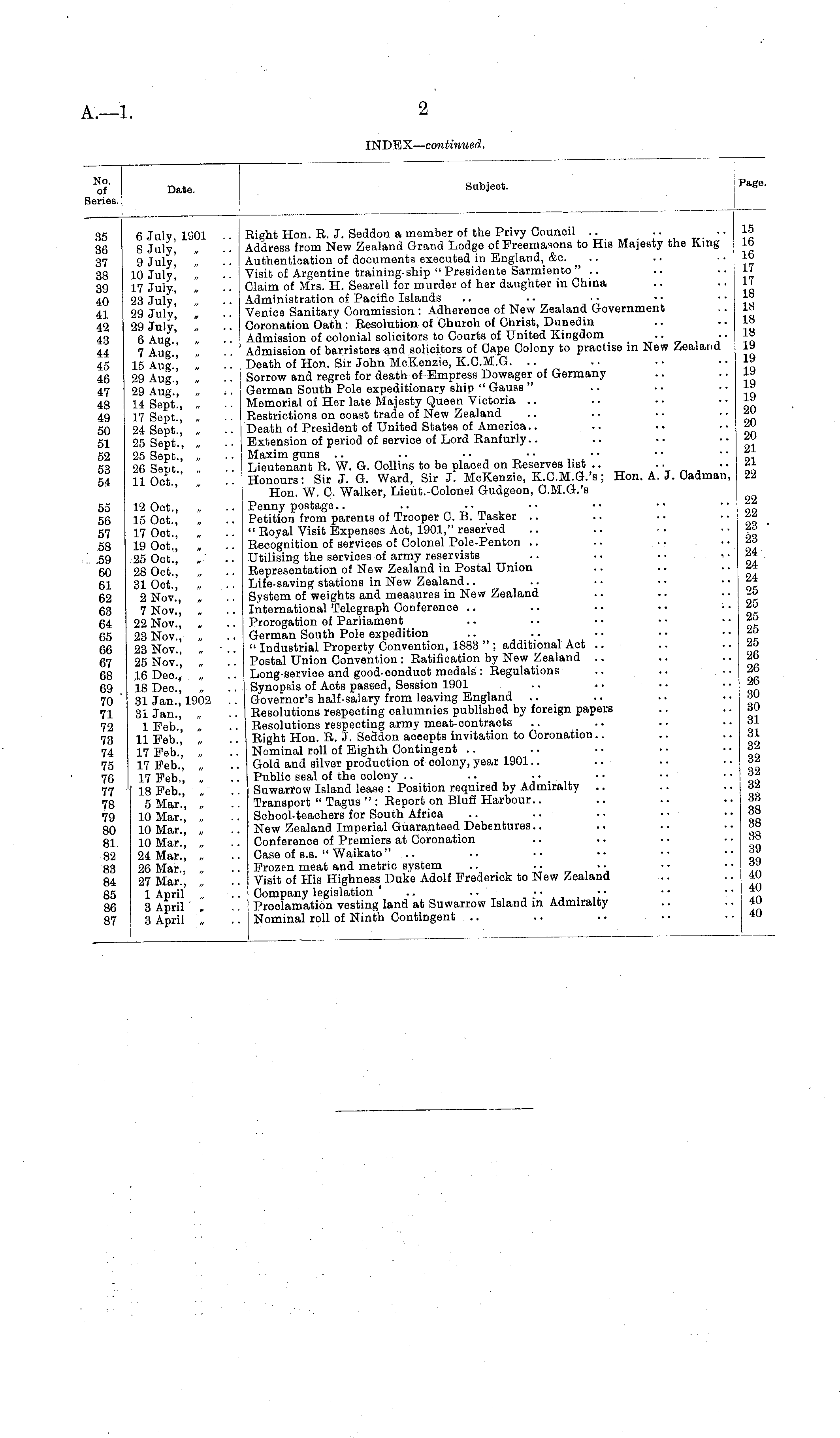 No. of Series. Date. Subject. Page. 35 36 37 38 39 40 41 42 43 44 45 46 47 48 49 50 51 52 53 54 6 July, 1901 8 July, , 9 July, „ 10 July, „ 17 July, „ 23 July, „ 29 July, , 29 July, „ 6 Aug., „ 7 Aug., „ 15 Aug., „ 29 Aug., . 29 Aug., „ 14 Sept., „ 17 Sept., „ 24 Sept., „ 25 Sept., „ 25 Sept., „ 26 Sept., „ 11 Oct., . Right Hon. R. J. Seddon a member of the Privy Council .. .. „.."• Address from New Zealand Grand Lodge of Freemasons to His Majesty the King Authentication of documents executed in England, &c. .. Visit of Argentine training-ship " Presidente Sarmiento " .. Claim of Mrs. H. Searell for murder of her daughter in China Administration of Pacific Islands Venice Sanitary Commission : Adherence of New Zealand Government Coronation Oath: Resolution of Church of Christ, Dunedin Admission of colonial solicitors to Courts of United Kingdom Admission of barristers and solicitors of Cape Colony to practise in New Zealand Death of Hon. Sir John McKenzie, K.C.M.G. Sorrow and regret for death of Empress Dowager of Germany German South Pole expeditionary Bhip " Gauss " Memorial of Her late Majesty Queen Victoria Restrictions on coast trade of New Zealand Death of President of United States of America.. Extension of period of service of Lord Ranfurly.. Maxim guns Lieutenant R. W. G. Collins to be placed on Reserves list Honours: Sir J. G. Ward, Sir J. McKenzie, K.C.M.G.'s; Hon. A. J. Cadman, Hon. W. 0. Walker, Lieut.-Colonel Gudgeon, C.M.G.'s Penny postage Petition from parents of Trooper G. B. Tasker "Royal Visit Expenses Act, 1901," reserved Recognition of services of Colonel Pole-Penton Utilising the services of army reservists Representation of New Zealand in Postal Union Life-saving stations in New Zealand.. System of weights and measures in New Zealand International Telegraph Conference Prorogation of Parliament German South Pole expedition " Industrial Property Convention, 1883 " ; additional Act Postal Union Convention : Ratification by New Zealand Long-service and good-conduct medals : Regulations Synopsis of Acts passed, Session 1901 Governor's half-salary from leaving England Resolutions respecting calumnies published by foreign papers Resolutions respecting army meat-contracts Right Hon. R. J. Seddon accepts invitation to Coronation.. Nominal roll of Eighth Contingent .. .. Gold and silver production of colony, year 1901 Public seal of the colony Suwarrow Island lease : Position required by Admiralty Transport " Tagus ": Report on Bluff Harbour.. School-teachers for South Afrioa New Zealand Imperial Guaranteed Debentures.. Conference of Premiers at Coronation Case of s.s. " Waikato" .. Frozen meat and metric system Visit of His Highness Duke Adolf Frederick to New Zealand Company legislation ' .. .. •• Proclamation vesting land at Suwarrow Island in Admiralty Nominal roll of Ninth Contingent 15 16 16 17 17 18 18 18 18 19 19 19 19 19 20 20 20 21 21 22 55 56 57 58 .59 60 61 62 63 64 65 66 67 68 69 70 71 72 73 74 75 76 77 78 79 80 81 82 83 84 85 86 87 12 Oot., , 15 Oct., „ 17 Oct., „ 19 Oct., . 25 Oct., ,-' 28 Oct., „ 31 Oct., „ 2 Nov., » 7 Nov., „ 22 Nov., , 23 Nov., „ 23 Nov., „ 25 Nov., „ 16 Dec, „ 18 Dec, „ 31 Jan., 1902 31 Jan., „ 1 Feb., „ 11 Feb., „ 17 Feb., „ 17 Feb., „ 17 Feb., , 18 Feb., „ 5 Mar., „ 10 Mar., „ 10 Mar., „ 10 Mar., „ 24 Mar., „ 26 Mar., „ 27 Mar., „ 1 April 3 April , 3 April „ 22 22 23 ■ 23 24 24 24 25 25 25 25 25 26 26 26 30 30 31 31 32 32 32 32 33 38 38 38 39 39 40 40 40 40