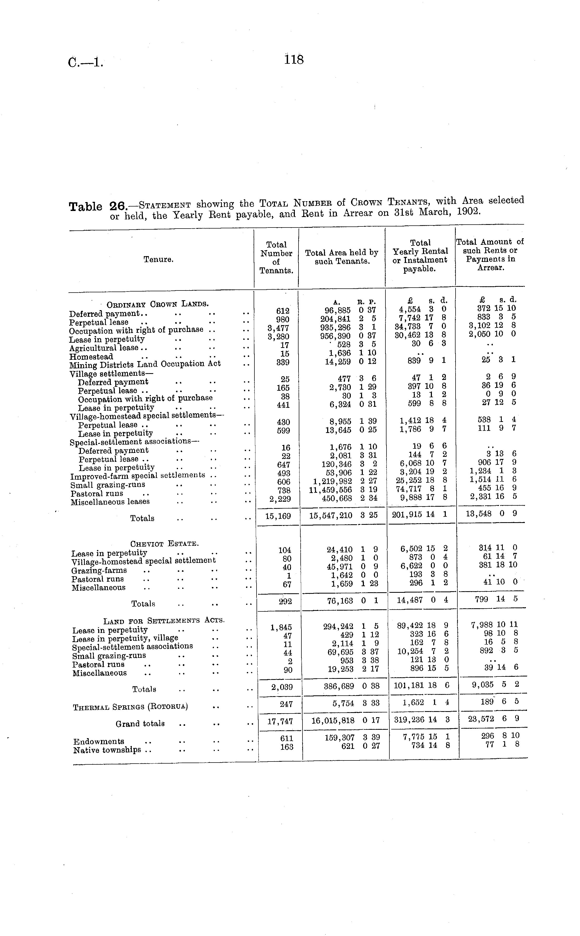 Tenure. Total Number of Tenants. Total Area held by such Tenants. Total Yearly Rental or Instalment payable. Total Amount oi such Rents or Payments in Arrear. Ordinary. Crown Lands. Deferred payment Perpetual lease Occupation with right of purchase .. Lease in perpetuity Agricultural lease Homestead Mining Districts Land Occupation Act Village settlements — Deferred payment Perpetual lease Occupation with right of purchase Lease in perpetuity Village-homestead special settlements — Perpetual lease Lease in perpetuity Special-settlement associations — Deferred payment Perpetual lease Lease in perpetuity Improved-farm special settlements .. Small grazing-runs Pastoral runs Miscellaneous leases 612 980 3,477 3,280 17 15 339 A. R. P. 96,885 0 37 204,841 2 5 935,286 3 1 956,390 0 37 ■ 528 3 5 1,636 1 10 14,259 0 12 £ s. a. 4,554 3 0 7,742 17 8 34,733 7 0 30,462 13 8 30 6 3 £ s. d. 372 15 10 833 3 5 3,102 12 8 2,050 10 0 839' 9 1 25 - 3 1 25 165 38 441 477 3 6 2,730 1 29 30 1 3 6,324 0 31 47 1 2 397 10 8 13 1 2 599 8 8 2 6 9 36 19 6 0 9 0 27 12 5 430 599 8,955 1 39 13,645 0 25 1,412 18 4 1,786 9 7 538 1 4 111 9 7 16 22 647 493 606 738 2,229 1,676 1 10 2,081 3 31 120,346 3 2 53,906 1 22 1,219,982 2 27 11,459,556 3 19 450,668 2 34 19 6 6 144 7 2 6,068 10 7 3,204 19 2 25,252 18 8 74,717 8 1 9,888 17 8 3 13 6 906 17 9 1,234 1 3 1,514 11 6 455 16 9 2,331 16 5 Totals 15,169 15,547,210 3 25 201,915 14 1 13,548 0 9 Cheviot Estate. Lease in perpetuity Village-homestead special settlement Grazing-farms Pastoral runs Miscellaneous 104 80 40 1 67 24,410 1 9 2,480 1 0 45,971 0 9 1,642 0 0 1,659 1 23 6,502 15 2 873 0 4 6,622 0 0 193 3 8 296 1 2 314 11 0 61 14 7 381 18 10 41 10 0 Totals 292 76,163 0 1 14,487 0 4 799 14 5 Land for Settlements Acts. Lease in perpetuity Lease in perpetuity, village Special-settlement associations Small grazing-runs Pastoral runs Miscellaneous 1,845 47 11 44 2 90 294,242 1 5 429 1 12 2,114 1 9 69,695 3 37 953 3 38 19,253 2 17 89,422 18 9 323 16 6 162 7 8 10,254 7 2 121 13 0 896 15 5 7,988 10 11 98 10 8 16 5 8 892 3 5 39 14 6 Totals 2,039 386,689 0 38 101,181 18 6 9,035 5 2 Thermal Springs (Rotorua) 247 5,754 3 33 1,652 1 i 189 6 5 Grand totals 17,747 16,015,818 0 17 319,236 14 3 23,572 6 9 Endowments Native townships 611 163 159,307 3 39 621 0 27 7,775 15 1 734 14 8 296 8 10 77 1 8