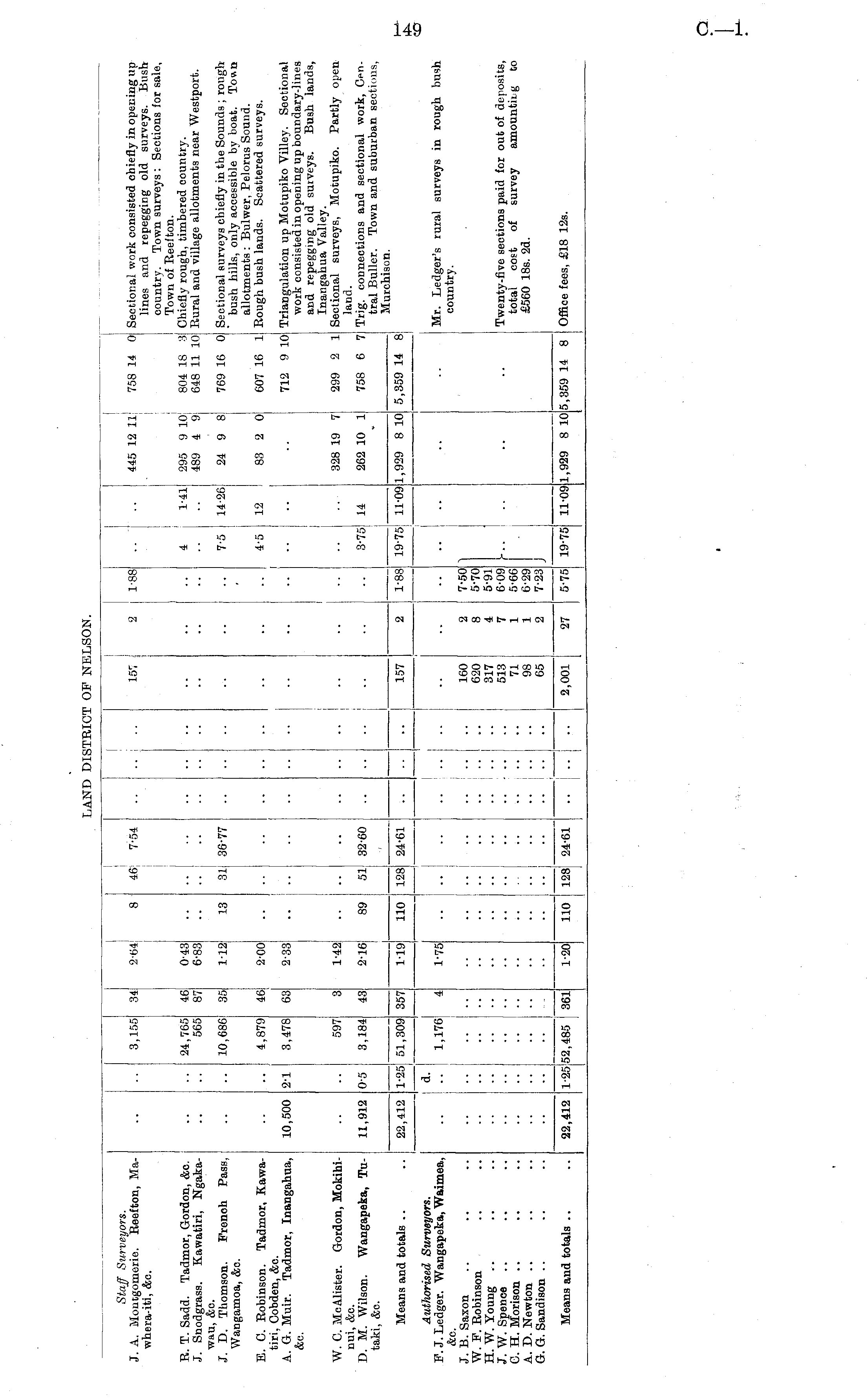 Stojf Surveyors. J. A. Moncgoinerie. Reefton, Ma-whera-iti, &o. I 46 7-54 2 1-88 Sectional work consisted chiefly in opening up lines and repegging old surveys. Bush country. Town surveys: Sections for sale, Town of Reefton. Chiefly rough, timbered oountry. Rural and village allotments near Westport. 3,155 34 2-64 157 445 12 11 758 14 0 . R. T. Sadd. Tadmor, Gordon, &c. J. Snodgrass. Kawatiri, Ngakawau, &c. J. D. Thomson. French Pass, Wangamoa, &o. ! •• 24,765 565 46 87 0-43 6-83 4 1.-41 295 9 10: 489 i 9 804 18 3 648 11 10 10,686 35 112 13 31 36-77 7-5 1426 24 9 8 83 2 0 769 16 0 607 16 1 712 9 10 Sectional surveys chiefly in the Sounds ; rough bush hills, only accessible by boat. Town allotments : Bulwer, Pelorus Sound. Rough bush lands. Scattered surveys. E. C. Robinson. Tadmor, Kawatiri, Cobden, &o. A. G. Muir. Tadmor, Inangahua, &e. 4,879 46; 2-00 1 4-5 12 10,500 2-1 3,478 63 2-33 Triangulation up Mofcupiko Villey. Sectional work consisted in opening up boundary-lines and repegging old surveys. Bush lands, Inangahua Valley. Sectional surveys, Motupiko. Partly open land. Trig, connections and sectional work, Ontral Buller. Town and suburban sections, Murchison. W. C. MoAlister. Gordon, Mokihinui, &o. D. M. Wilson. Wangapeka, Tutaki, &o. 1-42 328 19 7 299 2 lj •• 597 3 •• 1 •• 11,912 05 3,184 43 2-16 89 51 32-60 __ 3-75 r 262 10 ll 758 6 7 22,412 I 1-25 357 119 110 24-61 I 157 ! 2 1-88 19-75 11-09 ' 1,929 8 10 5,359 14 8 Means and totals 51,309 128 '" 1 157 Authorised Surveyors. F. J. Ledger. Wangapeka, Waimea, &c. J. B. Saxon W. F. Robinson , H. W. Young ... J. W. Spence G. H. Morison .. A. D. Newton .. G. G. Sandison a. 1 I 1 I 1 j ; 1 J j I I i Mr. Ledger's rural surveys in rough bush country. •• ! 1,176 4 1-75 I ! •• •• .. I .. ! • • I •■ I I 1 160 620 317 513 71 98 65 2,001 2 8 4 7 1 1 2 7-50 5-70 5-91 6-09 5-66 6-29 7-23 r , ■ Twenty-five sections paid for out of deposits, total coft of survey amounting to £560 18s. 2d. " I i ■r- •• I 4i3 , tfcJ_Z 1-25! ■52,485 J j 361 1-20 110 128 24-61 5-75 J 19-75 Office fees, £18 12s. Means and totals 27 11-09 1,929 8 10 5,359 14 8