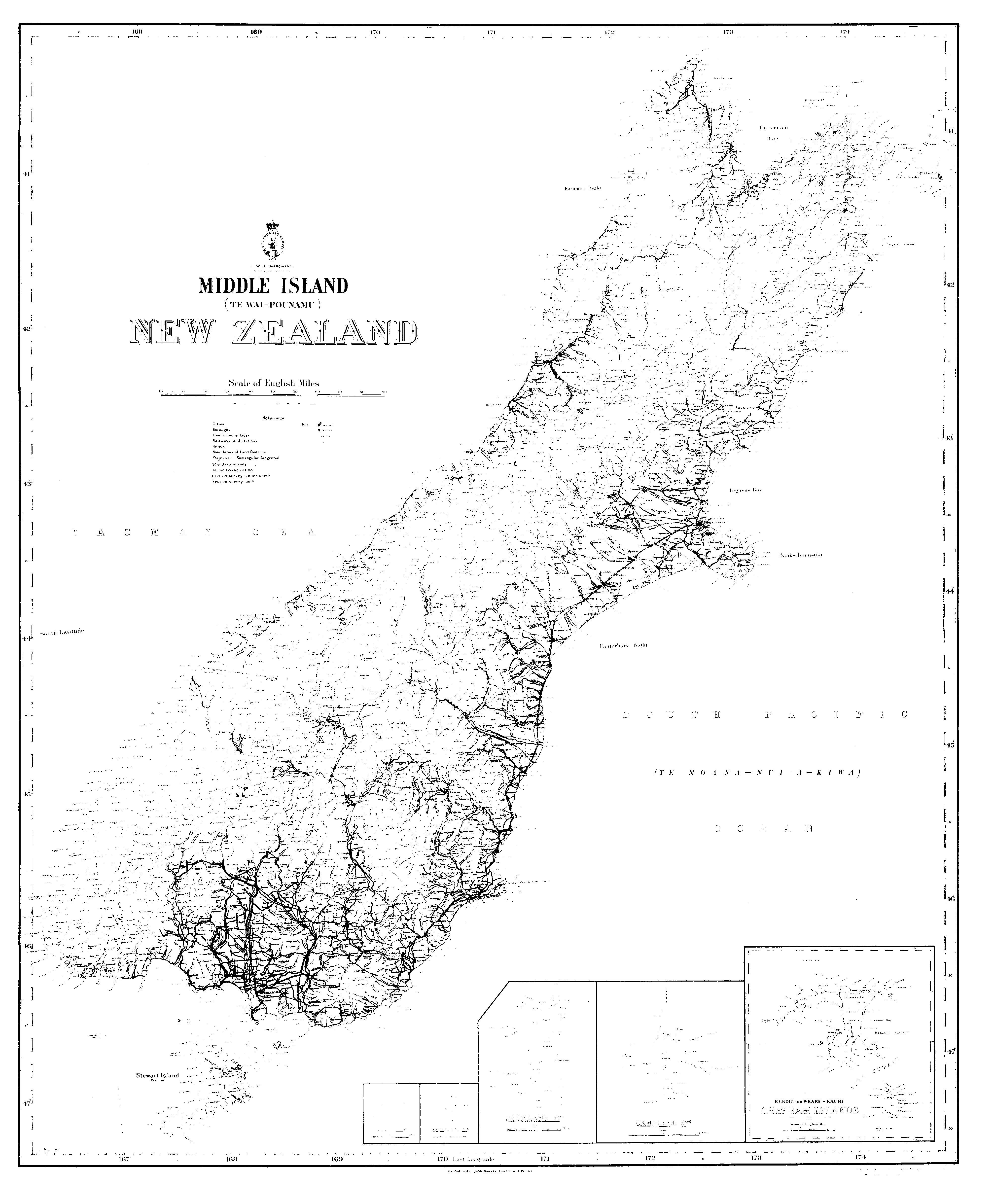 MIDDLE ISLAND (TE WAI-POUNAMU) NEW ZEALAND SHOWN STATE OF THE PUBLIC SURVEYS, 1902. Scale of English Miles