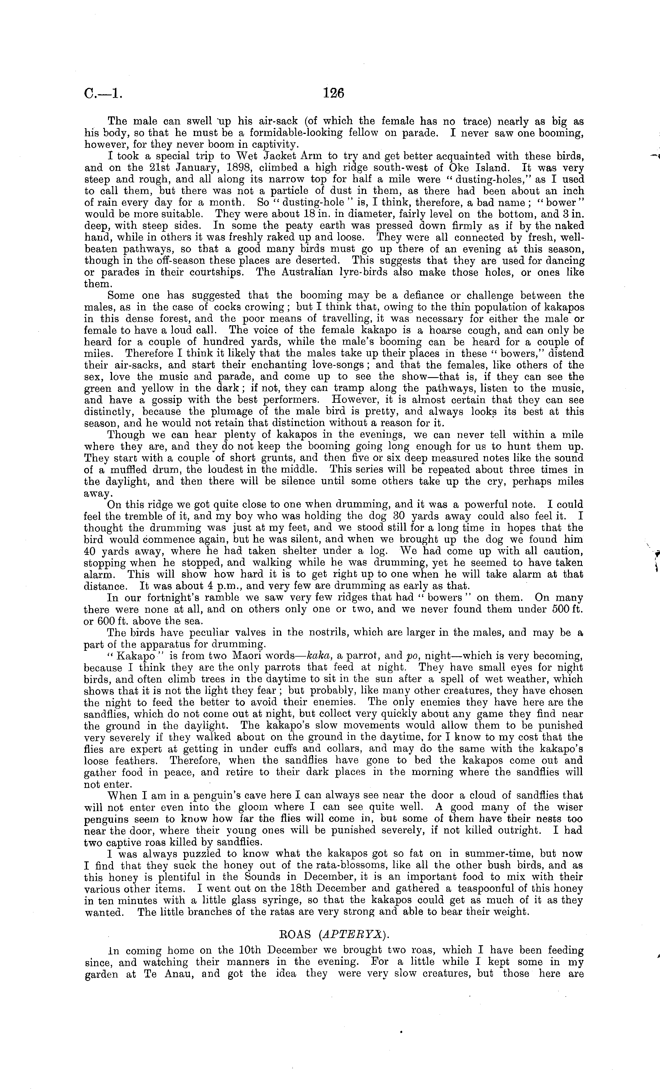 The male can swell up his air-sack (of which the female has no trace) nearly as big as his body, so that he must be a formidable-looking fellow on parade. I never saw one booming, however, for they never boom in captivity. I took a special trip to Wet Jacket Arm to try and get better acquainted with these birds, and on the 21st January, 1898, climbed a high ridge south-west of Oke Island. It was very steep and rough, and all along its narrow top for half a mile were " dusting-holes," as I used to call them, but there was not a particle of dust in them, as there had been about an inch of rain every day for a month. So " dusting-hole " is, I think, therefore, a bad name ; " bower" would be more suitable. They were about 18 in. in diameter, fairly level on the bottom, and 3 in. deep, with steep sides. In some the peaty earth was pressed down firmly as if by the naked hand, while in others it was freshly raked up and loose. They were all connected by fresh, wellbeaten pathways, so that a good many birds must go up there of an evening at this season, though in the off-season these places are deserted. This suggests that they are used for dancing or parades in their courtships. The Australian lyre-birds also make those holes, or ones like them. Some one has suggested that the booming may be a defiance or challenge between the males, as in the case of cocks crowing ; but I think that, owing to the thin population of kakapos in this dense forest, and the poor means of travelling, it was necessary for either the male or female to have a loud call. The voice of the femaie kakapo is a hoarse cough, and can only be heard for a couple of hundred yards, while the male's booming can be heard for a couple of miles. Therefore I think it likely that the males take up their places in these " bowers," distend their air-sacks, and start their enchanting love-songs ; and that the females, like others of the sex, love the music and parade, and come up to see the show—that is, if they can see the green and yellow in the dark ; if not, they can tramp along the pathways, listen to the music, and have a gossip with the best performers. However, it is almost certain that they can see distinctly, because the plumage of the male bird is pretty, and always looks its best at this season, and he would not retain that distinction without a reason for it. Though we can hear plenty of kakapos in the evenings, we can never tell within a mile where they are, and they do not keep the booming going long enough for us to hunt them up. They start with a couple of short grunts, and then five or six deep measured notes like the sound of a muffled drum, the loudest in the middle. This series will be repeated about three times in the daylight, and then there will be silence until some others take up the cry, perhaps miles away. On this ridge we got quite close to one when drumming, and it was a powerful note. I could feel the tremble of it, and my boy who was holding the dog 30 yards away could also feel it. I thought the drumming was just at my feet, and we stood still for a long time in hopes that the bird would commence again, but he was silent, and when we brought up the dog we found him 40 yards away, where he had taken shelter under a log. We had come up with all caution, stopping when he stopped, and walking while he was drumming, yet he seemed to have taken alarm. This will show how hard it is to get right up to one when he will take alarm at that distance. It was about 4 p.m., and very few are drumming as early as that. In our fortnight's ramble we saw very few ridges that had " bowers " on them. On many there were none at all, and on others only one or two, and we never found them under 500 ft. or 600 ft. above the sea. The birds have peculiar valves in the nostrils, which are larger in the males, and may be a part of the apparatus for drumming. " Kakapo " is from two Maori words— kaka, a parrot, and po, night—which is very becoming, because I think they are the only parrots that feed at night. They have small eyes for night birds, and often climb trees in the daytime to sit in the sun after a spell of wet weather, which shows that it is not the light they fear ; but probably, like many other creatures, they have chosen the night to feed the better to avoid their enemies. The only enemies they have here are the sandflies, which do not come out at night, but collect very quickly about any game they find near the ground in the daylight. The kakapo's slow movements would allow them to be punished very severely if they walked about on the ground in the daytime, for I know to my cost that the flies are expert at getting in under cuffs and collars, and may do the same with the kakapo's loose feathers. Therefore, when the sandflies have gone to bed the kakapos come out and gather food in peace, and retire to their dark places in the morning where the sandflies will not enter. When I am in a penguin's cave here I can always see near the door a cloud of sandflies that will not enter even into the gloom where I can see quite well. A good many of the wiser penguins seem to know how far the flies will come in, but some of them have their nests too near the door, where their young ones will be punished severely, if not killed outright. I had two captive roas killed by sandflies. 1 was always puzzled to know what the kakapos got so fat on in summer-time, but now I find that they suck the honey out of the rata-blossoms, like all the other bush birds, and as this honey is plentiful in the Sounds in December, it is an important food to mix with their various other items. I went out on the 18th December and gathered a teaspoonful of this honey in ten minutes with a little glass syringe, so that the kakapos could get as much of it as they wanted. The little branches of the ratas are very strong and able to bear their weight. ROAS (APTERYX). In coming home on the 10th December we brought two roas, which I have been feeding since, and wa
