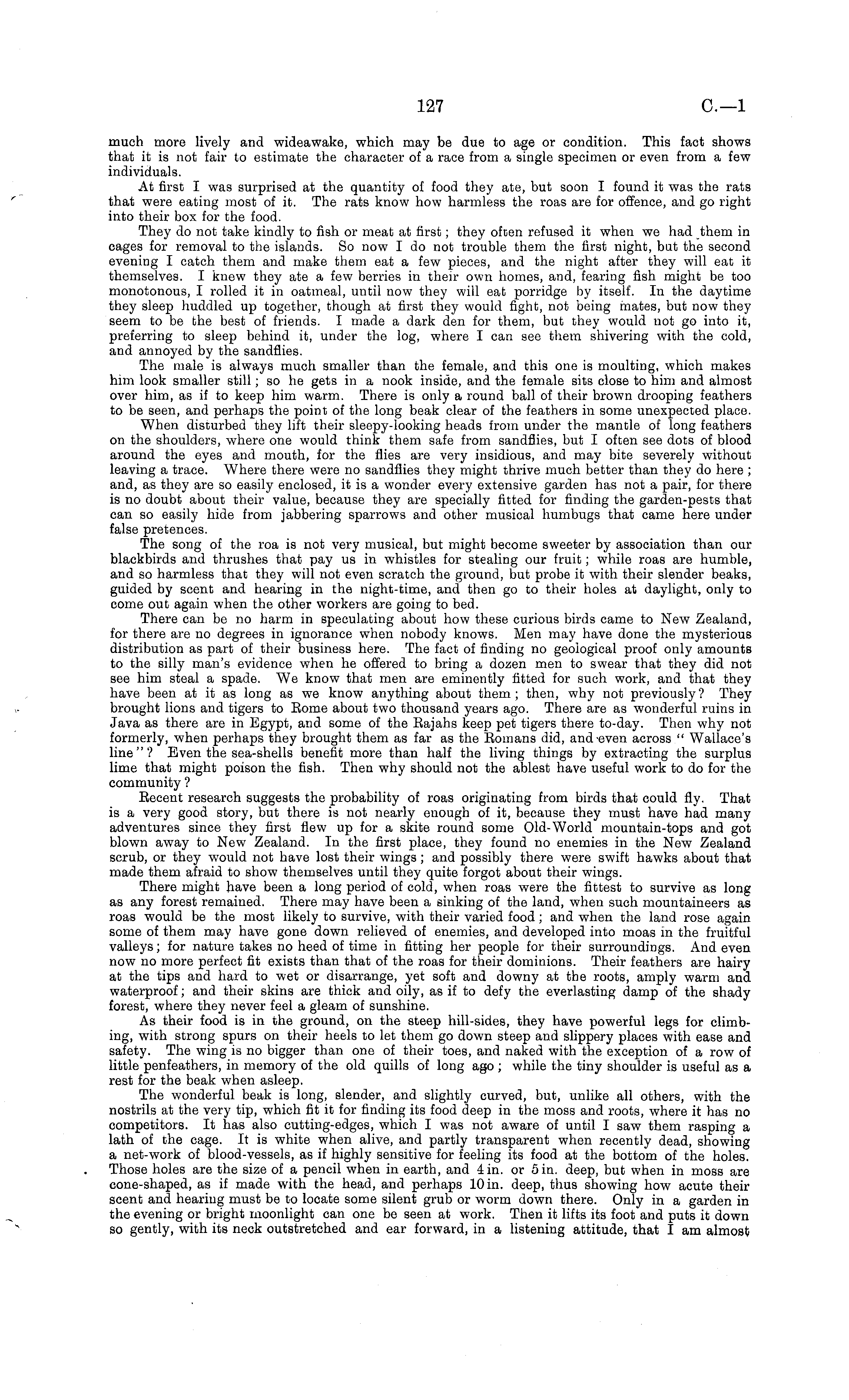 much more lively and wideawake, which may be due to age or condition. This fact shows that it is not fair to estimate the character of a race from a single specimen or even from a few individuals. At first I was surprised at the quantity of food they ate, but soon I found it was the rats that were eating most of it. The rats know how harmless the roas are for offence, and go right into their box for the food. They do not take kindly to fish or meat at first; they often refused it when we had them in cages for removal to the islands. So now I do not trouble them the first night, but the second evening I catch them and make them eat a few pieces, and the night after they will eat it themselves. I knew they ate a few berries in their own homes, and, fearing fish might be too monotonous, I rolled it in oatmeal, until now they will eat porridge by itself. In the daytime they sleep huddled up together, though at first they would fight, not being mates, but now they seem to be the best of friends. I made a dark den for them, but they would not go into it, preferring to sleep behind it, under the log, where I can see them shivering with the cold, and annoyed by the sandflies. The male is always much smaller than the female, and this one is moulting, which makes him look smaller still; so he gets in a nook inside, and the female sits close to him and almost over him, as if to keep him warm. There is only a round ball of their brown drooping feathers to be seen, and perhaps the point of the long beak clear of the feathers in some unexpected place. When disturbed they lift their sleepy-looking heads from under the mantle of long feathers on the shoulders, where one would think them safe from sandflies, but I often see dots of blood around the eyes and mouth, for the flies are very insidious, and may bite severely without leaving a trace. Where there were no sandflies they might thrive much better than they do here ; and, as they are so easily enclosed, it is a wonder every extensive garden has not a pair, for there is no doubt about their value, because they are specially fitted for finding the garden-pests that can so easily hide from jabbering sparrows and other musical humbugs that came here under false pretences. The song of the roa is not very musical, but might become sweeter by association than our blackbirds and thrushes that pay us in whistles for stealing our fruit; while roas are humble, and so harmless that they will not even scratch the ground, but probe it with their slender beaks, guided by scent and hearing in the night-time, and then go to their holes at daylight, only to come out again when the other workers are going to bed. There can be no harm in speculating about how these curious birds came to New Zealand, for there are no degrees in ignorance when nobody knows. Men may have done the mysterious distribution as part of their business here. The fact of finding no geological proof only amounts to the silly man's evidence when he offered to bring a dozen men to swear that they did not see him steal a spade. We know that men are eminently fitted for such work, and that they have been at it as long as we know anything about them; then, why not previously? They brought lions and tigers to Rome about two thousand years ago. There are as wonderful ruins in Java as there are in Egypt, and some of the Rajahs keep pet tigers there to-day. Then why not formerly, when perhaps they brought them as far as the Romans did, and even across " Wallace's line"? Even the sea-shells benefit more than half the living things by extracting the surplus lime that might poison the fish. Then why should not the ablest have useful work to do for the community ? Recent research suggests the probability of roas originating from birds that could fly. That is a very good story, but there is not nearly enough of it, because they must have had many adventures since they first flew up for a skite round some Old-World mountain-tops and got blown away to New Zealand. In the first place, they found no enemies in the New Zealand scrub, or they would not have lost their wings ; and possibly there were swift hawks about that made them afraid to show themselves until they quite forgot about their wings. There might have been a long period of cold, when roas were the fittest to survive as long as any forest remained. There may have been a sinking of the land, when such mountaineers as roas would be the most likely to survive, with their varied food ; and when the land rose again some of them may have gone down relieved of enemies, and developed into moas in the fruitful valleys; for nature takes no heed of time in fitting her people for their surroundings. And even now no more perfect fit exists than that of the roas for their dominions. Their feathers are hairy at the tips and hard to wet or disarrange, yet soft and downy at the roots, amply warm and waterproof; and their skins are thick and oily, as if to defy the everlasting damp of the shady forest, where they never feel a gleam of sunshine. As their food is in the ground, on the steep hill-sides, they have powerful legs for climbing, with strong spurs on their heels to let them go down steep and slippery places with ease and safety. The wing is no bigger than one of their toes, and naked with the exception of a row of little penfeathers, in memory of the old quills of long ago ; while the tiny shoulder is useful as a rest for the beak when asleep. The wonderful beak is long, slender, and slightly curved, but, unlike all others, with the nostrils at the very tip, which fit it for finding its food deep in the moss and roots, where it has no competitors. It has also cutting-edges, which I was not aware of until I saw them rasping a lath of the cage. It is white when alive, and partly transparent when recently dead, showing a net-work of blood-vessels, as if highly sensitive for feeling its food at the bottom of the holes. Those holes are the size of a pencil when in ear