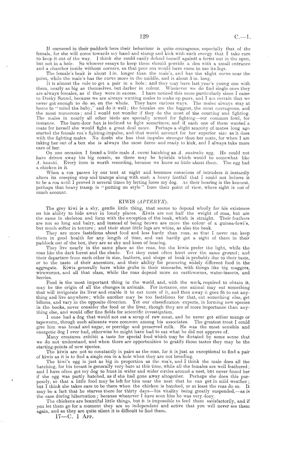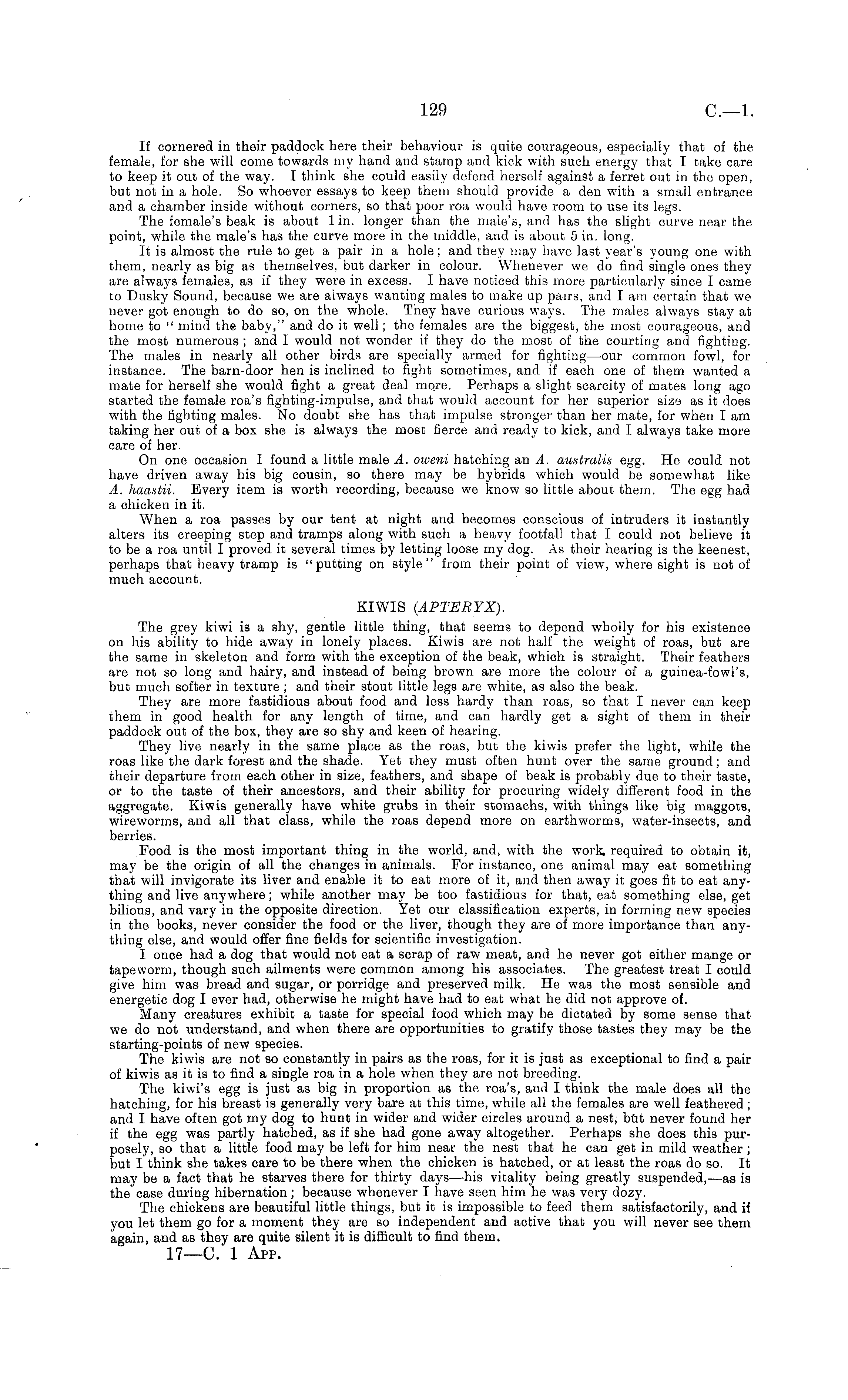 If cornered in their paddock here their behaviour is quite courageous, especially that of the female, for she will come towards my hand and stamp and kick with such energy that I take care to keep it out of the way. I think she could easily defend herself against a ferret out in the open, but not in a hole. So whoever essays to keep them should provide a den with a small entrance and a chamber inside without corners, so that poor roa would have room to use its legs. The female's beak is about 1 in. longer than the male's, and has the slight curve near the point, while the male's has the curve more in the middle, and is about 5 in. long. It is almost the rule to get a pair in a hole ; and they may have last year's young one with them, nearly as big as themselves, but darker in colour. Whenever we do find single ones they are always females, as if they were in excess. I have noticed this more particularly since I came to Dusky Sound, because we are always wanting males to make up pairs, and I am certain that we never got enough to do so, on the whole. They have curious ways. The males always stay at home to " mind the baby," and do it well; the females are the biggest, the most courageous, and the most numerous ; and I would not wonder if they do the most of the courting and fighting. The males in nearly all other birds are specially armed for fighting—our common fowl, for instance. The barn-door hen is inclined to fight sometimes, and if each one of them wanted a mate for herself she would fight a great deal more. Perhaps a slight scarcity of mates long ago started the female roa's fighting-impulse, and that would account for her superior size as it does with the fighting males. No doubt she has that impulse stronger than her mate, for when lam taking her out of a box she is always the most fierce and ready to kick, and I always take more care of her. On one occasion I found a little male A. oweni hatching an A. australis egg. He could not have driven away his big cousin, so there may be hybrids which would be somewhat like A. haastii. Every item is worth recording, because we know so little about them. The egg had a chicken in it. When a roa passes by our tent at night and becomes conscious of intruders it instantly alters its creeping step and tramps along with such a heavy footfall that I could not believe it to be a roa until I proved it several times by letting loose my dog. As their hearing is the keenest, perhaps that heavy tramp is "putting on style" from their point of view, where sight is not of much account. KIWIS (APTERYX). The grey kiwi is a shy, gentle little thing, that seems to depend wholly for his existence on his ability to hide away in lonely places. Kiwis are not half the weight of roas, but are the same in skeleton and form with the exception of the beak, which is straight. Their feathers are not so long and hairy, and instead of being brown are more the colour of a guinea-fowl's, but much softer in texture ; and their stout little legs are white, as also the beak. They are more fastidious about food and less hardy than roas, so that I never can keep them in good health for any length of time, and can hardly get a sight of them in their paddock out of the box, they are so shy and keen of hearing. They live nearly in the same place as the roas, but the kiwis prefer the light, while the roas like the dark forest and the shade. Yet they must often hunt over the same ground; and their departure from each other in size, feathers, and shape of beak is probably due to their taste, or to the taste of their ancestors, and their ability for procuring widely different food in the aggregate. Kiwis generally have white grubs in their stomachs, with things like big maggots, wireworms, and all that class, while the roas depend more on earthworms, water-insects, and berries. Food is the most important thing in the world, and, with the work, required to obtain it, may be the origin of all the changes in animals. For instance, one animal may eat something that will invigorate its liver and enable it to eat more of it, and then away it goes fit to eat anything and live anywhere; while another may be too fastidious for that, eat something else, get bilious, and vary in the opposite direction. Yet our classification experts, in forming new species in the books, never consider the food or the liver, though they are of more importance than anything else, and would offer fine fields for scientific investigation. I once had a dog that would not eat a scrap of raw meat, and he never got either mange or tapeworm, though such ailments were common among his associates. The greatest treat I could give him was bread and sugar, or porridge and preserved milk. He was the most sensible and energetic dog I ever had, otherwise he might have had to eat what he did not approve of. Many creatures exhibit a taste for special food which may be dictated by some sense that we do not understand, and when there are opportunities to gratify those tastes they may be the starting-points of new species. The kiwis are not so constantly in pairs as the roas, for it is just as exceptional to find a pair of kiwis as it is to find a single roa in a hole when they are not breeding. The kiwi's egg is just as big in proportion as the roa's, and I think the male does all the hatching, for his breast is generally very bare at this time, while all the females are well feathered; and I have often got my dog to hunt in wider and wider circles around a nest, but never found her if the egg was partly hatched, as if she had gone away altogether. Perhaps she does this purposely, so that a little food may be left for him near the nest that he can get in mild weather ; but I think she takes care to be there when the chicken is hatched, or at least the roas do so. It may be a fact that he starves there for thirty days —his vitality being greatly suspended,—as is the case during hibernation; because whenever I have seen him he wa