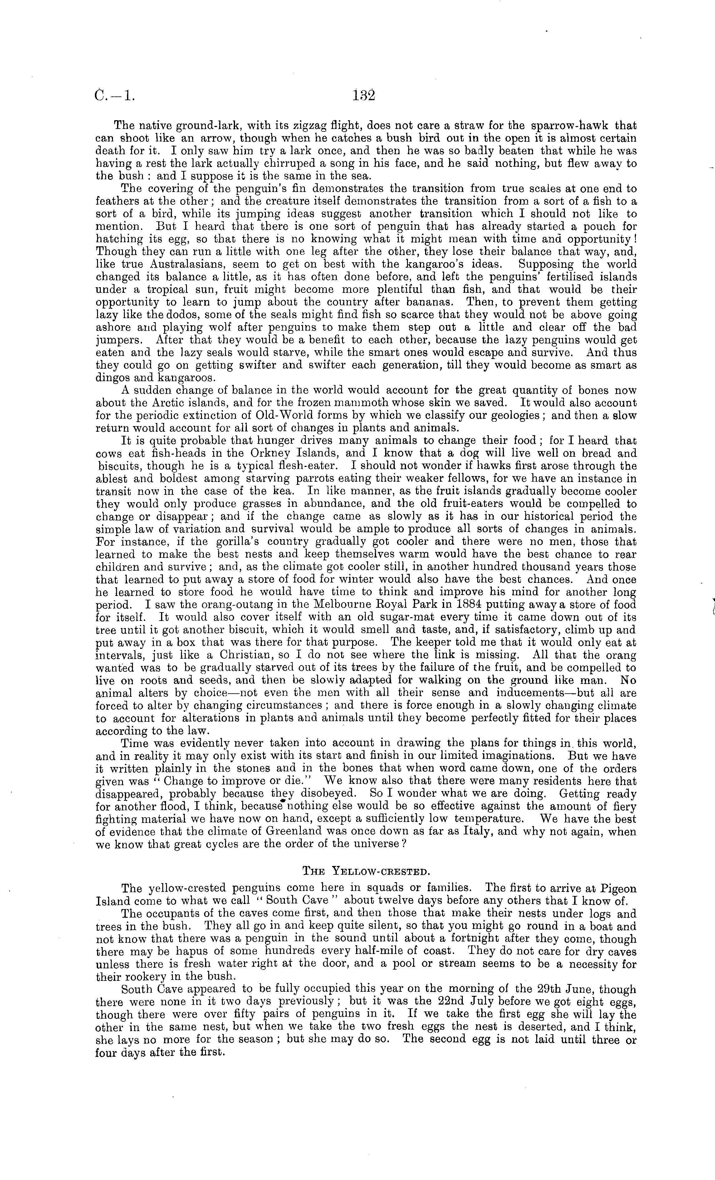 The native ground-lark, with its zigzag flight, does not care a straw for the sparrow-hawk that can shoot like an arrow, though when he catches a bush bird out in the open it is almost certain death for it. I only saw him try a lark once, and then he was so badly beaten that while he was having a rest the lark actually chirruped a song in his face, and he said nothing, but flew away to the bush : and I suppose it is the same in the sea. The covering of the penguin's fin demonstrates the transition from true scales at one end to feathers at the other; and the creature itself demonstrates the transition from a sort of a fish to a sort of a bird, while its jumping ideas suggest another transition which I should not like to mention. But I heard that there is one sort of penguin that has already started a pouch for hatching its egg, so that there is no knowing what it might mean with time and opportunity ! Though they can run a little with one leg after the other, they lose their balance that way, and, like true Australasians, seem to get on best with the kangaroo's ideas. Supposing the world changed its balance a little, as it has often done before, and left the penguins' fertilised islands under a tropical sun, fruit might become more plentiful than fish, and that would be their opportunity to learn to jump about the country after bananas. Then, to prevent them getting lazy like the dodos, some of the seals might find fish so scarce that they would not be above going ashore and playing wolf after penguins to make them step out a little and clear off the bad jumpers. After that they would be a benefit to each other, because the lazy penguins would get eaten and the lazy seals would starve, while the smart ones would escape and survive. And thus they could go on getting swifter and swifter each generation, till they would become as smart as dingos and kangaroos. A sudden change of balance in the world would account for the great quantity of bones now about the Arctic islands, and for the frozen mammoth whose skin we saved. It would also account for the periodic extinction of Old-World forms by which we classify our geologies ; and then a slow return would account for all sort of changes in plants and animals. It is quite probable that hunger drives many animals to change their food ; for I heard that cows eat fish-heads in the Orkney Islands, and I know that a dog will live well on bread and biscuits, though he is a typical flesh-eater. I should not wonder if hawks first arose through the ablest and boldest among starving parrots eating their weaker fellows, for we have an instance in transit now in the case of the kea. In like manner, as the fruit islands gradually become cooler they would only produce grasses in abundance, and the old fruit-eaters would be compelled to change or disappear ; and if the change came as slowly as it has in our historical period the simple law of variation and survival would be ample to produce all sorts of changes in animals. For instance, if the gorilla's country gradually got cooler and there were no men, those that learned to make the best nests and keep themselves warm would have the best chance to rear children and survive; and, as the climate got cooler still, in another hundred thousand years those that learned to put away a store of food for winter would also have the best chances. And once he learned to store food he would have time to think and improve his mind for another long period. I saw the orang-outang in the Melbourne Royal Park in 1884 putting away a store of food for itself. It would also cover itself with an old sugar-mat every time it came down out of its tree until it got another biscuit, which it would smell and taste, and, if satisfactory, climb up and put away in a box that was there for that purpose. The keeper told me that it would only eat at intervals, just like a Christian, so I do not see where the link is missing. All that the orang wanted was to be gradually starved out of its trees by the failure of the fruit, and be compelled to live on roots and seeds, and then be slowly adapted for walking on the ground like man. No animal alters by choice—not even the men with all their sense and inducements—but all are forced to alter by changing circumstances ; and there is force enough in a slowly changing climate to account for alterations in plants aud animals until they become perfectly fitted for their places according to the law. Time was evidently never taken into account in drawing the plans for things in. this world, and in reality it may only exist with its start and finish iv our limited imaginations. But we have it written plainly in the stones and in the bones that when word came down, one of the orders given was " Change to improve or die." We know also that there were many residents here that disappeared, probably because they disobeyed. So I wonder what we are doing. Getting ready for another flood, I think, because"nothing else would be so effective against the amount of fiery fighting material we have now on hand, except a sufficiently low temperature. We have the best of evidence that the climate of Greenland was once down as far as Italy, and why not again, when we know that great cycles are the order of the universe ? The Yellow-crested. The yellow-crested penguins come here in squads or families. The first to arrive at Pigeon Island come to what we call " South Cave " about twelve days before any others that I know of. The occupants of the caves come first, and then those that make their nests under logs and trees in the bush. They all go in and keep quite silent, so that you might go round in a boat and not know that there was a penguin in the sound until about a fortnight after they come, though there may be hapus of some hundreds every half-mile of coast. They do not care for dry caves unless there is fresh water right at the door, and a pool or stream seems to be a necessity for their rookery in the bush. Sou