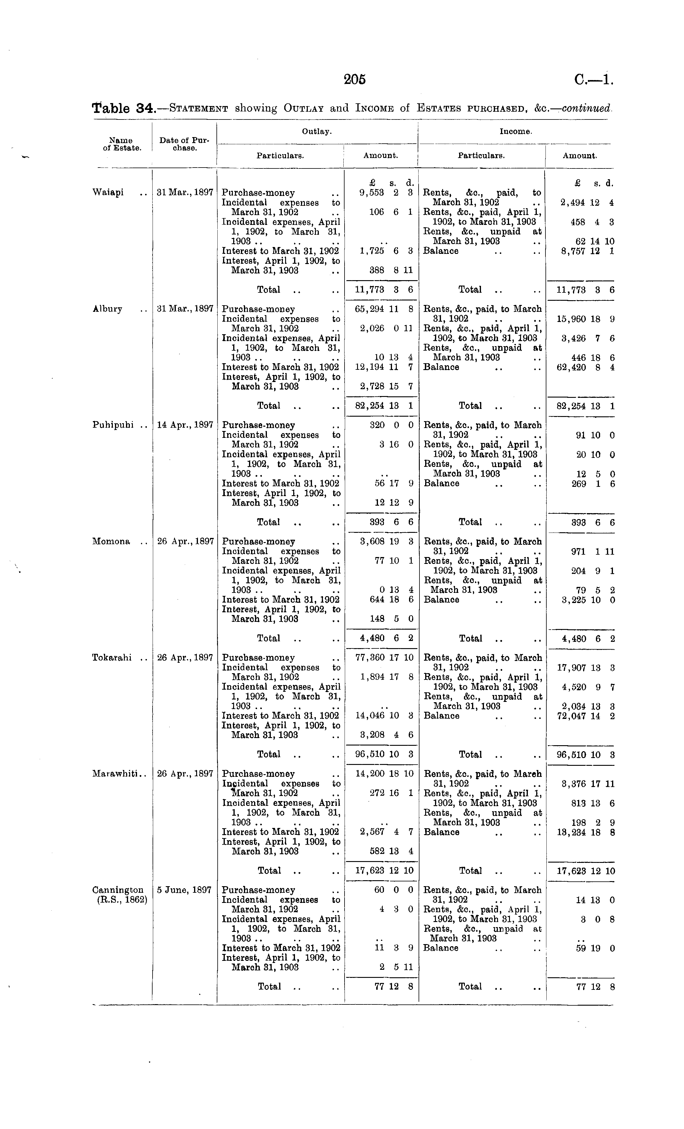 Outlay. Income. Name of Estate. Date of Purchase. s. Amount. Particulars. Amount. Particulars. aiapi 31 Mar., 1897 Purchaae-money Incidental expenses to March 31, 1902 Incidental expenses, April 1, 1902, to March 31, 1903 Interest to Maroh 31, 1902 Interest, April 1, 1902, to Maroh 31, 1903 £ s. d. 9,553 2 3 Rents, &e, paid, to March 31, 1902 Rents, &e, paid, April 1, 1902, to March 31, 1903 Rents, &e, unpaid at March 31, 1903 Balanoe £ s. d. 2,494 12 4 106 6 1 458 4 3 1,725 6 3 62 14 10 8,757 12 1 388 8 11 Total Total 11,773 3 6 11,773 3 6 Ibury 31 Mar., 1897 Purchase-money Incidental expenses to Maroh 31, 1902 Incidental expenses, April 1, 1902, to Maroh 31, 1903 Interest to Maroh 31, 1902 Interest, April 1, 1902, to March 31, 1903 65,294 11 8 2,026 0 11 Rents, &e, paid, to March 31, 1902 Rents, &e, paid, April 1, 1902, to Maroh 31, 1903 Rents, &e, unpaid at March 31, 1903 Balance 15,960 18 9 3,426 7 6 10 13 4 12,194 11 7 446 18 6 62,420 8 4 2,728 15 7 Total Total 82,254 13 1 82,254 13 1 uhipuhi .. 14 Apr., 1897 Purchase-money Incidental expenses to March 31, 1902 Incidental expenses, April 1, 1902, to March 31, 1903 Interest to Maroh 31, 1902 Interest, April 1, 1902, to March 31, 1903 320 0 0 3 16 0 Rents, &e, paid, to March 31, 1902 Rents, &e, paid, April 1, 1902, to March 31, 1903 Rents, (fee, unpaid at Maroh 31, 1903 Balance 91 10 0 20 10 0 56*17 9 12 5 0 269 1 6 12 12 9 Total Total 393 6 6 393 6 6 Pomona 26 Apr., 1897 Purohase-money Incidental expenses to Maroh 31, 1902 Incidental expenses, April 1, 1902, to Maroh 31, 1903 Interest to March 31, 1902 Interest, April 1, 1902, to Maroh 31, 1903 3,608 19 3 Rents, &e, paid, to March 31, 1902 Rents, &e, paid, April 1, 1902, to March 31, 1903 Rents, &e, unpaid at March 31, 1903 Balance 77 10 1 971 1 11 204 9 1 0 13 4 644 18 6 79 5 2 3,225 10 0 148 5 0 Total Total 4,480 6 2 4,480 6 2 'okarahi .. 26 Apr., 1897 Purohase-money Incidental expenses to March 31, 1902 Incidental expenses, April 1, 1902, to Maroh 31, 1903 Interest to March 31, 1902 Interest, April 1, 1902, to March 31, 1903 77,360 17 10 1,894 17 8 Rents, &e, paid, to Maroh 31, 1902 Rents, &e, paid, April 1, 1902, to Maroh 31, 1903 Rents, &e, unpaid at March 31, 1903 Balance 17,907 13 3 4,520 9 7 14,046 10 3 2,034 13 3 72,047 14 2 3,208 4 6 Total Total 96,510 10 3 96,510 10 3 darawhiti.. 26 Apr., 1897 Purchase-money Incidental expenses to March 31, 1902 Incidental expenses, April 1, 1902, to March 31, 1903 Interest to March 31, 1902 Interest, April 1, 1902, to March 31, 1903 14,200 18 10 272 16 1 Rents, (fee, paid, to Mareh 31, 1902 Rents, &e, paid, April 1, 1902, to March 31, 1903 Rents, &e, unpaid at March 31, 1903 Balance 3,376 17 11 813 13 6 2,567 4 7 198 2 9 13,234 18 8 582 13 4 Total Total 17,623 12 10 17,623 12 10 Jannington (R.S., 1862) 5 June, 1897 Purchase-money Incidental expenses to Maroh 31, 1902 Incidental expenses, April 1, 1902, to March 31, 1903 Interest to March 31, 1902 Interest, April 1, 1902, to Maroh 31, 1903 60 0 0 4 3 0 Rents, &e, paid, to March 31, 1902 Rents, rfee, paid, April 1, 1902, to Maroh 31, 1903 Rents, &e, unpaid at March 31, 1903 Balance 14 13 0 3 0 8 ii 3 9 59 19 0 2 5 11 Total Total 77 12 8 77 12 8