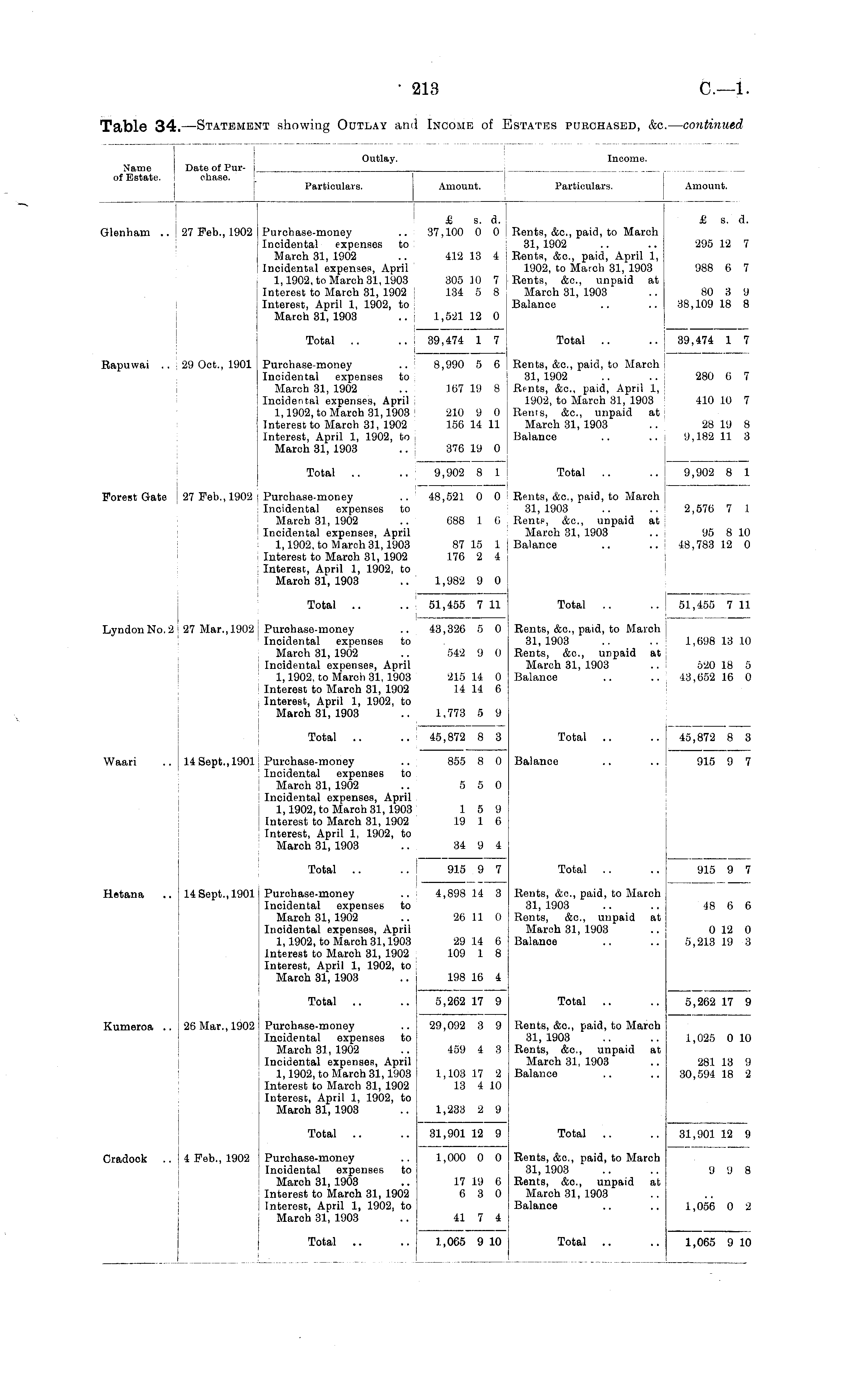 Name Date of Purof Estate. chase. I Outlay. Income. Particulars. Amount. Particulars. Amount. lenham .. 27 Feb., 1902 £ s. d. Purchase-money .. 37,100 0 0 Rents, &e, paid, to March Incidental expenses to 81,1902 March 31, 1902 .. 412 13 4 j Rents, (fee, paid, April 1, Incidental expenses, April 1902, to March 31, 1903 1,1902, to March 31,1903 305 10 7 Rents, &e, unpaid at Interest to March 31, 1902 ' 134 5 8 March 31, 1903 Interest, April 1, 1902, to Balance March 31, 1903 .. 1,521 12 0 Total .. .. 39,474 1 7 Total .. Purchase-money .. ' 8,990 5 6 | Rents, &e, paid, to March Incidental expenses to 31,1902 March 31, 1902 .. 167 19 8 Rents, &e, paid, April 1, Incidental expenses, April 1902, to March 31, 1903 1,1902, to March 31,1903 210 9 0 Rents, &e, unpaid at Interest to March 31, 1902 156 14 11 March 31, 1903 Interest, April 1, 1902, to Balance March 31, 1903 .. 376 19 0 Total .. .. 9,902 8 1 Total .. £ s. d. 295 12 7 988 6 7 80 3 9 38,109 18 8 39,474 1 7 i lapuwai .. j 29 Oct., 1901 280 0 7 410 10 7 28 19 8 9,182 11 3 9,902 8 1 Forest Gate | 27 Feb., 1902 1 Purchase-money .. 48,521 0 0 Rents, &e, paid, to March Incidental expenses to 31, 1903 March 31, 1902 .. 688 1 6 . Rents, (fee, unpaid at Incidental expensea, April March 31, 1903 1,1902, to March 31,1903 87 15 1 Balance Interest to March 31, 1902 176 2 4 Interest, April 1, 1902, to March 31, 1903 .. 1,982 9 0 2,576 7 1 95 8 10 48,783 12 0 | Lyndon No. 2 27 Mar., 1902 Total .. .. 51,455 7 11 Total .. Purohase-money .. 43,326 5 0 Rents, (fee, paid, to March Incidental expenses to 31, 1903 March 31, 1902 .. 542 9 0 Rents, &e, unpaid at Incidental expenses, April March 31, 1903 1,1902, to March 31, 1903 215 14 0 Balance Interest to March 31, 1902 14 14 6 Interest, April 1, 1902, to March 31, 1903 .. 1,773 5 9 51,455 7 11 1,698 13 10 520 18 5 43,652 16 0 Total .. .. ! 45,872 8 3 Total .. 45,872 8 3 Waari 14 Sept., 1901 Purchase-money .. 855 8 0 Balance Incidental expenses to March 31, 1902 .. 5 5 0 Incidental expenses, April 1,1902, to March 31, 1903 15 9 Purchase-money .. 855 8 0 Incidental expenses to March 31, 1902 .. 5 5 0 Incidental expenses, April 1,1902, to March 31, 1903 15 9 Interest to March 31, 1902 19 1 6 Interest, April 1, 1902, to March 31, 1903 .. 34 9 4 915 9 7 Interest to March 31, 1902 19 1 6 Interest, April 1, 1902, to March 31, 1903 .. 34 9 4 Total .. .. I 915 9 7 Total .. Total .. .. I 915 9 7 915 9 7 Hetana 14 Sept., 1901 Purohase-money .. 4,898 14 3 Rents, &e, paid, to March Incidental expenses to 31, 1903 March 31, 1902 .. 26 11 0 Rents, &e, unpaid at Incidental expenses, April March 31, 1903 1,1902, to March 31,1903 29 14 6 Balance Interest to March 31, 1902 109 1 8 Interest, April 1, 1902, to Purohase-money Incidental expenses to March 31, 1902 Incidental expenses, April 1,1902, to March 31,1903 Interest to March 31, 1902 Interest, April 1, 1902, to March 31, 1903 4,898 14 3 26 11 0 29 14 6 109 1 8 198 16 4 48 6 6 0 12 0 5,213 19 3 Maroh 31, 1903 .. 198 16 4 Total .. .. 5,262 17 9 Total .. Total .. 5,262 17 9 5,262 17 9 Kumeroa .. 26 Mar., 1902 Purchase-money .. 29,092 3 9 Rents, &e, paid, to March Incidental expenses to 31,1903 March 31, 1902 .. 459 4 3 Rents, rfee, unpaid at Incidental expenses, April March 31, 1903 1,1902, to March 31,1903 1,103 17 2 Balance Interest to March 31, 1902 13 4 10 Interest, April 1, 1902, to Purcha.se-money Incidental expenses to March 31, 1902 Incidental expenses, April 1,1902, to March 31,1903 Interest to March 31, 1902 Interest, April 1, 1902, to March 31, 1903 29,092 3 9 459 4 3 1,103 17 2 13 4 10 1,233 2 9 1,025 0 10 281 13 9 30,594 18 2 March 31, 1903 .. 1,233 2 9 Total .. .. 31,901 12 9 Total .. Total 31,901 12 9 31,901 12 9 Cradock 4 Feb., 1902 Purchase-money .. 1,000 0 0 Rents, &e, paid, to March Incidental expenses to 31, 1903 March 31, 1903 .. 17 19 6 Renta, &e, unpaid at Interest to March 31, 1902 6 3 0 March 31, 1903 Interest, April 1, 1902, to Balance March 31, 1903 .. 41 7 4 Purchase-money Incidental expenses to March 31, 1903 Interest to March 31, 1902 Interest, April 1, 1902, to March 31, 1903 1,000 0 0 17 19 6 6 3 0 41 7 4 9 9 8 1,056 0 2 Total .. .. 1,065 9 10 Total .. Total 1,065 9 10 1,065 9 10 1,065 9 10