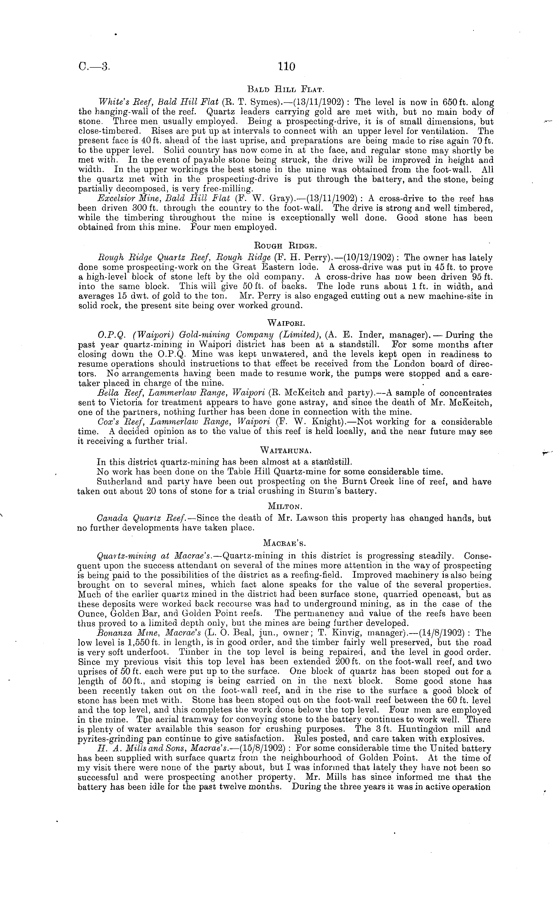 Bald Hill Flat. White's Beef, Bald Hill Flat (R. T. Symes).—(l3/11/1902) : The level is now in 650 ft. along the hanging-wall of the reef. Quartz leaders carrying gold are met with, but no main body of stone. Three men usually employed. Being a prospecting-drive, it is of small dimensions, but close-timbered. Rises are put up at intervals to connect with an upper level for ventilation. The present face is 40 ft. ahead of the last uprise, and preparations are being made to rise again 70 ft. to the upper level. Solid country has now come in at the face, and regular stone may shortly be met with. In the event of payable stone being struck, the drive will be improved in height and width. In the upper workings the best stone in the mine was obtained from the foot-wall. All the quartz met with in the prospecting-drive is put through the battery, and the stone, being partially decomposed, is very free-milling. Excelsior Mine, Bald Hill Flat (F. W. Gray).—(l 3/11/1902) : A cross-drive to the reef has been driven 300 ft. through the country to the foot-wall. The drive is strong and well timbered, while the timbering throughout the mine is exceptionally well done. Good stone has been obtained from this mine. Four men employed. Rough Ridge. Rough Ridge Quartz Reef, Rough Bidge (F. H. Perry).—(lo/12/1902) : The owner has lately done some prospecting-work on the Great Eastern lode. A cross-drive was put in 45 ft. to prove a high-level block of stone left by the old company. A cross-drive has now been driven 95 ft. into the same block. This will give 50 ft. of backs. The lode runs about 1 ft. in width, and averages 15 dwt. of gold to the ton. Mr. Perry is also engaged cutting out a new machine-site in solid rock, the present site being over worked ground. Waipori. O.P.Q. (Waipori) Gold-mining Company (Limited), (A. E. Inder, manager). — During the past year quartz-mining in Waipori district has been at a standstill. For some months after closing down the O.P.Q. Mine was kept unwatered, and the levels kept open in readiness to resume operations should instructions to that effect be received from the London board of directors. No arrangements having been made to resume work, the pumps were stopped and a caretaker placed in charge of the mine. Bella Beef, Lammerlaw Bange, Waipori (R. McKeitch and party).—A sample of concentrates sent to Victoria for treatment appears to have gone astray, and since the death of Mr. McKeitch, one of the partners, nothing further has been done in connection with the mine. Cox's Beef, Lammerlaio Bange, Waipori (F. W. Knight).—Not working for a considerable time. A decided opinion as to the value of this reef is held locally, and the near future may see it receiving a further trial. Waitahuna. In this district quartz-mining has been almost at a standstill. No work has been done on the Table Hill Quartz-mine for some considerable time. Sutherland and party have been out prospecting on the Burnt Creek line of reef, and have taken out about 20 tons of stone for a trial crushing in Sturm's battery. Milton. Canada Quartz Beef. —Since the death of Mr. Lawson this property has changed hands, but no further developments have taken place. Macrae's. Quartz-mining at Macrae's. —Quartz-mining in this district is progressing steadily. Consequent upon the success attendant on several of the mines more attention in the way of prospecting is being paid to the possibilities of the district as a reefing-field. Improved machinery is also being brought on to several mines, which fact alone speaks for the value of the several properties. Much of the earlier quartz mined in the district had been surface stone, quarried opencast, but as these deposits were worked back recourse was had to underground mining, as in the case of the Ounce, Golden Bar, and Golden Point reefs. The permanency and value of the reefs have been thus proved to a limited depth only, but the mines are being further developed. Bonanza Mine, Macrae's (L. O. Beal, jun., owner; T. Kinvig, manager).—(l 4/8/1902) : The low level is 1,550 ft. in length, is in good order, and the timber fairly well preserved, but the road is very soft underfoot. Timber in the top level is being repaired, and the level in good order. Since my previous visit this top level has been extended 200 ft. on the foot-wall reef, and two uprises of 50 ft. each were put up to the surface. One block of quartz has been stoped out for a length of 50 ft., and stoping is being carried on in the next block. Some good stone has been recently taken out on the foot-wall reef, and in the rise to the surface a good block of stone has been met with. Stone has been stoped out on the foot-wall reef between the 60 ft. level and the top level, and this completes the work done below the top level. Four men are employed in the mine. The aerial tramway for conveying stone to the battery continues to work well. There is plenty of water available this season for crushing purposes. The 3 ft. Huntingdon mill and pyrites-grinding pan continue to give satisfaction. Rules posted, and care taken with explosives. 11. A. Mills and Sons, Macrae's. —(ls/8/1902) : For some considerable time the United battery has been supplied with surface quartz from the neighbourhood of Golden Point. At the time of my visit there were none of the party about, but I was informed that lately they have not been so successful and were prospecting another property. Mr. Mills has since informed me that the battery has been idle for the past twelve months. During the three years it was in active operation
