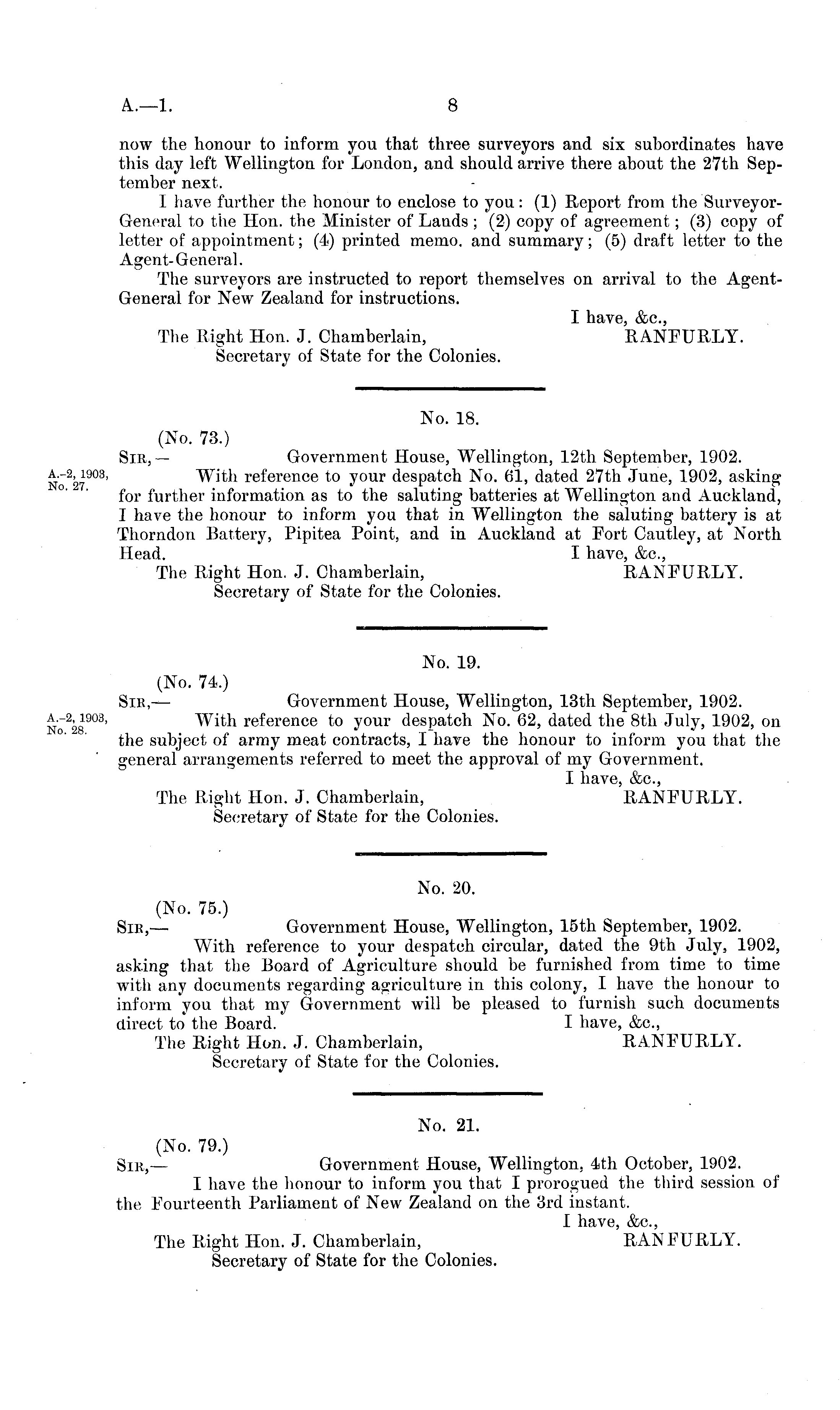 No. 21. (No. 79.) Sir, — Government House, Wellington, 4th October, 1902. I have the honour to inform you that I prorogued the third session of the Fourteenth Parliament of New Zealand on the 3rd instant. I have, &c, The Right Hon. J. Chamberlain, RANFURLY. Secretary of State for the Colonies.
