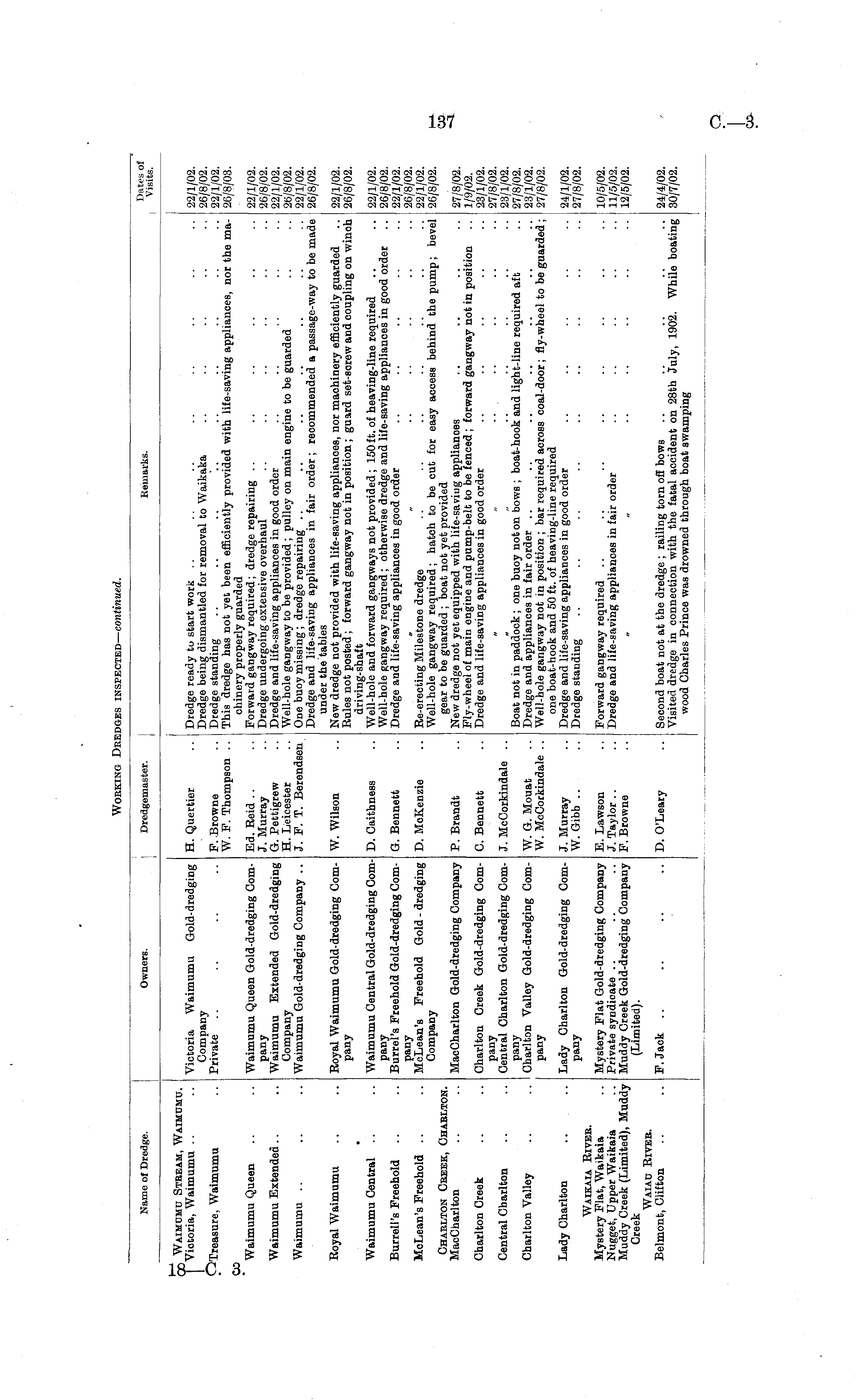Name of Dredge. Owners. Dredgemaster. Remarks. Dates of Visits. Qrj Waimumu Stream, Waimumu. I Viotoria, Waimumu .. Waimumu Victoria Waimumu Gold-dredging Company Private H. Quertier Dredge ready to start work Dredge being dismantled for removal to Waikaka Dredge standing This dredge has not yet been efficiently provided with life-saving applianoes, nor the machinery properly guarded Forward gangway required; dredge repairing Dredge undergoing extensive overhaul Dredge and life-saving appliances in good order Well-hole gangway to be provided ; pulley on main engine to be guarded One buoy missing ; dredge repairing Dredge and life-saving appliances in fair order ; recommended a passage-way to be made under the tables New dredge not provided with life-saving appliances, nor maohinery efficiently guarded Rules not posted ; forward gangway not in position ; guard set-sorew and coupling on winoh driving-shaft Well-hole and forward gangways not provided ; 150 ft. of heaving-line required Well-hole gangway required; otherwise dredge and life-saving appliances in good order Dredge and life-saving appliances in good order 22/1/02. 26/8/02. 22/1/02. 26/8/03. F. Browne W. F. Thompson .. CO Waimumu Queen Waimumu Queen Gold-dredging Company Waimumu Extended Gold-dredging Company Waimumu Gold-dredging Company .. Ed. Reid .. J. Murray G. Pettigrew H. Leicester J. F. T. Berendsen 22/1/02. 26/8/02. 22/1/02. 26/8/02. 22/1/02. 26/8/02. Waimumu Extended Waimumu Royal Waimumu Royal Waimumu Golddredging Company W. Wilson 22/1/02. 26/8/02. Waimumu Central Waimumu Central Gold-dredging Company Burrel's Freehold Gold-dredging Company McLean's Freehold Gold - dredging Company D. Caithness 22/1/02. 26/8/02. 22/1/02. 26/8/02. 22/1/02. 26/8/02. Burrell's Freehold G. Bennett MoLean's Freehold D. MoKenzie Re-erecting Milestone dredge Well-hole gangway required; hatch to be cut for easy access behind the pump; bevel gear to be guarded ; boat not yet provided New dredge not yet equipped with life-saviug applianoes Fly-wheel of main engine and pump-belt to be fenced ; forward gangway not in position Dredge and life-saving appliances in good order Charlton Creek, Charlton. MacCharlton MacCharlton Gold-dredging Company P. Brandt 27/8/02. 1/9/02. 23/1/02. 27/8/02. 23/1/02. 27/8/02. 23/1/02. 27/8/02. Charlton Creek Charlton Creek Gold-dredging Company Central Charlton Gold-dredging Company Charlton Valley Gold-dredging Company C. Bennett Central Charlton J. McCorkindale .. Boat not in paddock ; one buoy not on bows ; boat-hook and light-line required aft Dredge and applianoes in fair order Well-hole gangway not in position ; bar required across coal-door; fly-wheel to be guarded ; one boat-hook and 50 ft. of heaving-line required Dredge and life-saving appliances in good order Dredge standing Charlton Valley W. G. Mouat W. McCorkindale .. Lady Charlton Lady Charlton Gold-dredging Company J. Murray W. Gibb 24/1/02. 27/8/02. Waikaia River. Mystery Flat, Waikaia Nugget, Upper Waikaia Muddy Creek (Limited), Muddy Creek Waiau River. Belmont, Clifton Mystery Flat Gold-dredging Company Private syndicate Muddy Creek Gold-dredging Company (Limited). E. Lawson J. Taylor F. Browne Forward gangway required Dredge and life-saving appliances in fair order 10/5/02. 11/5/02. 12/5/02. F. Jack .. D. O'Leary Second boat not at the dredge ; railing torn off bows Visited dredge in connection with the fatal accident on 28th July, 1902. While boating wood Charles Prince was drowned through boat swamping 24/4/02. 30/7/02.