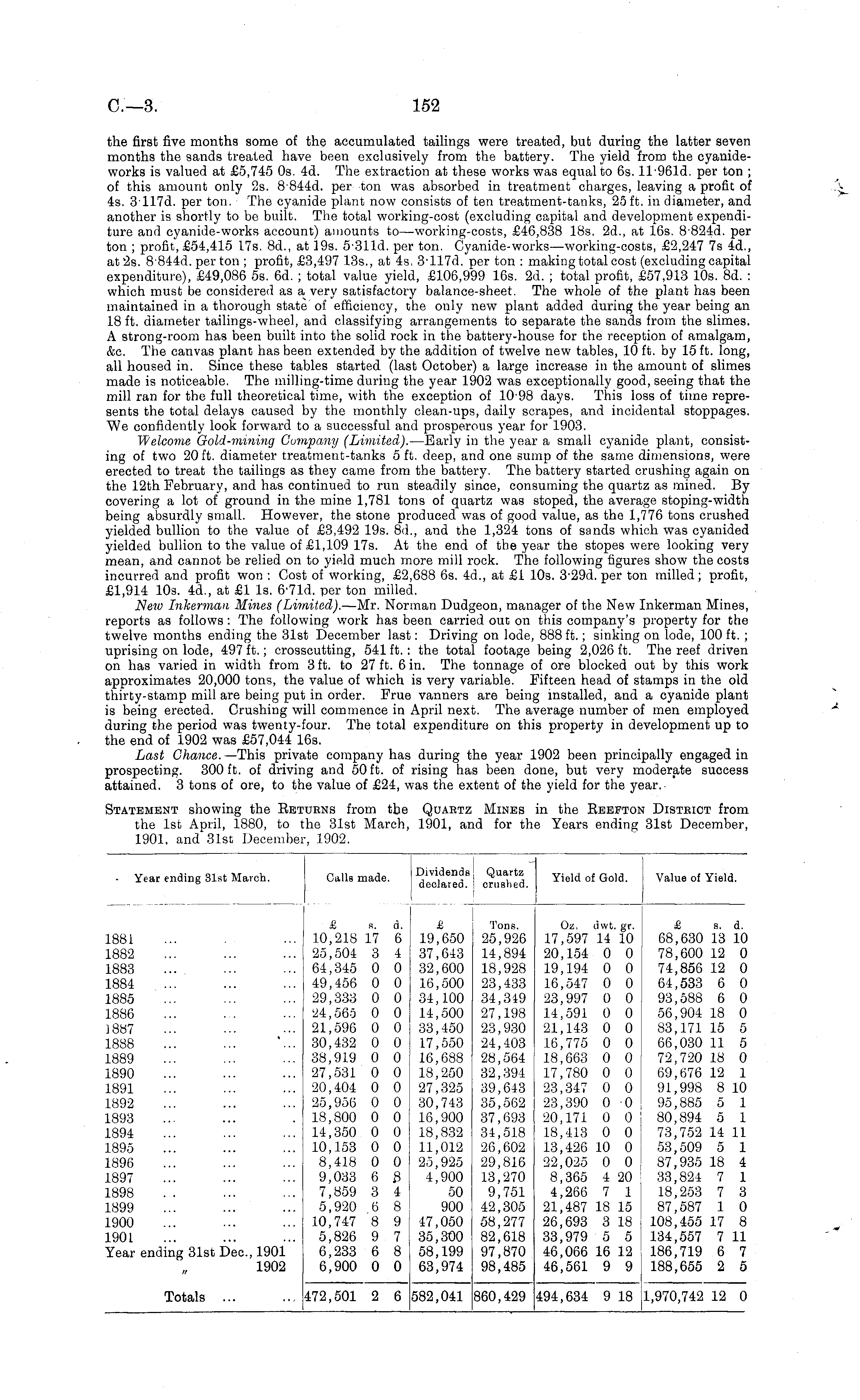 Year ending 31st March. Calls made. Dividends Quartz declared, crushed. Yield of Gold. Value of Yield. 1881 1882 1883 1884 1885 1886 1887 1888 1889 1890 1891 1892 1893 1894 1895 1896 1897 1898 1899 1900 1901 Year ending 31st Dec, 1901 1902 £ s. 10,218 17 25,504 3 64,345 0 49,456 0 29,333 0 24,565 0 21,596 0 30,432 0 38,919 0 27,531 0 20,404 0 25,956 0 18,800 0 14,350 0 10,153 0 8,418 0 9,033 6 7,859 3 5,920 6 10,747 8 5,826 9 6,233 6 6,900 0 d. 6 4 0 0 0 0 0 0 0 0 0 0 0 0 0 0 8 4 8 9 7 8 0 £ 19,650 37,643 32,600 16,500 34,100 14,500 33,450 17,550 16,688 18,250 27,325 30,743 16,900 18,832 11,012 25, 925 4,900 50 900 17,050 35,300 58,199 63,974 Tons. 25,926 14,894 18,928 23,433 34,349 27,198 23,930 24,403 28,564 32,394 39,643 35,062 37,693 34,518 26,602 29,816 13,270 9,751 42,305 58,277 82,618 97,870 98,485 Oz, dwt. gr. 17,597 14 10 20,154 0 0 19,194 0 0 16,547 0 0 23,997 0 0 14,591 0 0 21,143 0 0 16,775 0 0 18,663 0 0 17,780 0 0 23,347 0 0 23,390 0 0 20,171 0 0 18,113 0 0 13,426 10 0 22,025 0 0 8,365 4 20 4,266 7 1 21,487 18 15 26,693 3 18 33,979 5 5 46,066 16 12 46,561 9 9 £ s. d. 68,630 13 10 78,600 12 0 74,856 12 0 64,533 6 0 93,588 6 0 56,904 18 0 83,171 15 5 66,030 11 5 72,720 18 0 69,676 12 1 91,998 8 10 95,885 5 1 80,894 5 1 73,752 14 11 53,509 5 1 87,935 18 4 33,824 7 1 18,253 7 3 87,587 1 0 108,455 17 8 134,557 7 11 186,719 6 7 188,655 2 5 Totals ... 472,501 2 6 |582,041 860,429 494,634 9 18 1,970,742 12 0