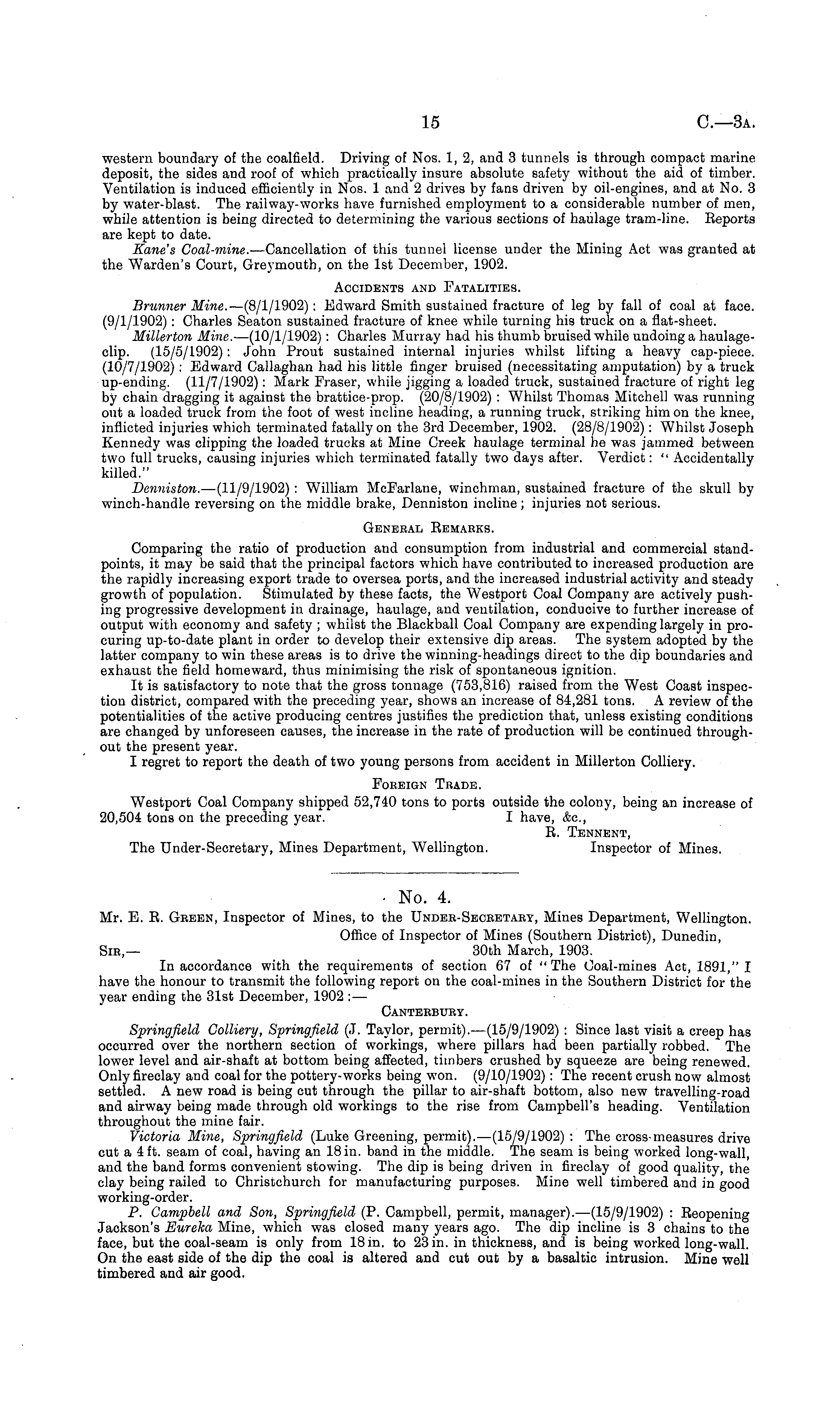 - No. 4. Mr. E. R. Green, Inspector of Mines, to the Under-Secretary, Mines Department, Wellington. Office of Inspector of Mines (Southern District), Dunedin, Sir,— 30th March, 1903. In accordance with the requirements of section 67 of "The Coal-mines Act, 1891," I have the honour to transmit the following report on the coal-mines in the Southern District for the year ending the 31st December, 1902 : — Canterbury. Springfield Colliery, Springfield (J. Taylor, permit).—(ls/9/1902) : Since last visit a creep has occurred over the northern section of workings, where pillars had been partially robbed. The lower level and air-shaft at bottom being affected, timbers crushed by squeeze are being renewed. Only fireclay and coal for the pottery-works being won. (9/10/1902): The recent crush now almost settled. A new road is being cut through the pillar to air-shaft bottom, also new travelling-road and airway being made through old workings to the rise from Campbell's heading. Ventilation throughout the mine fair. Victoria Mine, Springfield (Luke Greening, permit).—(ls/9/1902) : The cross-measures drive cut a 4 ft. seam of coal, having an 18 in. band in the middle. The seam is being worked long-wall, and the band forms convenient stowing. The dip is being driven in fireclay of good quality, the clay being railed to Christchurch for manufacturing purposes. Mine well timbered and in good working-order. P. Campbell and Son, Springfield (P. Campbell, permit, manager). —(15/9/1902) : Reopening Jackson's Eureka Mine, which was closed many years ago. The dip incline is 3 chains to the face, but the coal-seam is only from 18 in. to 23 in. in thickness, and is being worked long-wall. On the east side of the dip the coal is altered and cut out by a basaltic intrusion. Mine well timbered and air good.