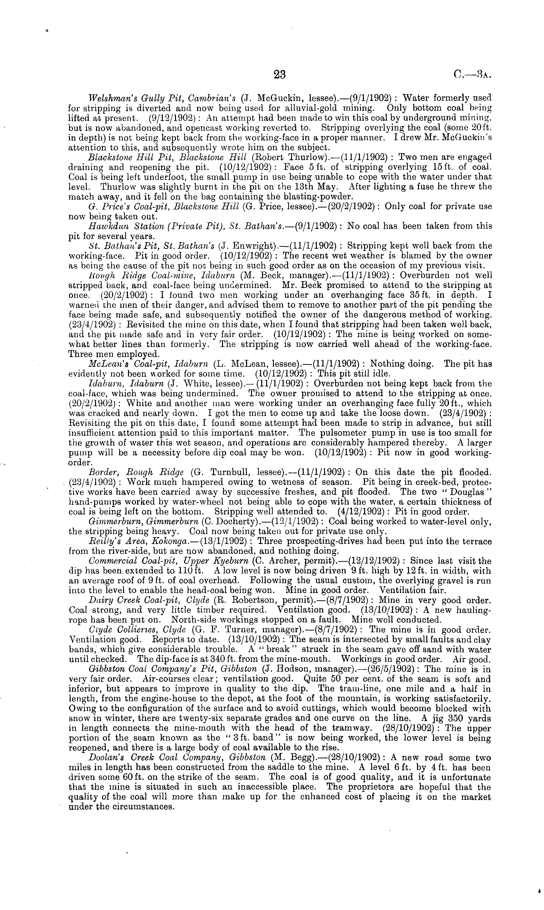 Welshman's Gully Pit, Cambrian's (J. McGuckin, lessee). —(9/1/1902) : Water formerly used for stripping is diverted and now being used for alluvial-gold mining. Only bottom coal being lifted at present. (9/12/1902) : An attempt had been made to win this coal by underground mining, but is now abandoned, and opencast working reverted to. Stripping overlying the coal (some 20ft. in depth) is not being kept back from the working-face in a proper manner. I drew Mr. McGuckin's attention to this, and subsequently wrote him on the subject. Blackstone Hill Pit, Blackstone Hill (Robert Thurlow). —(11/1/1902) : Two men are engaged draining and reopening the pit. (10/12/1902) : Face 5 ft. of stripping overlying 15 ft. of coal. Coal is being left underfoot, the small pump in use being unable to cope with the water under that level. Thurlow was slightly burnt in the pit on the 13th May. After lighting a fuse he threw the match away, and it fell on the bag containing the blasting-powder. G. Price's Coal-pit, Blackstone Hill (G. Price, lessee). —(20/2/1902): Only coal for private use now being taken out. Hatvkdun Station (Private Pit), St. Bathan's. —(9/1/1902): No coal has been taken from this pit for several years. St. Bathan's Pit, St. Bathan's (J. Enwright). —(11/1/1902) : Stripping kept well back from the working-face. Pit in good order. (10/12/1902) : The recent wet weather is blamed by the owner as being the cause of the pit not being in such good order as on the occasion of my previous visit. Rough Ridge Coal-mine, Idaburn (M. Beck, manager).—(ll/1/1902) : Overburden not well stripped back, and coal-face being undermined. Mr. Beck promised to attend to the stripping at once. (20/2/1902) : I found two men working under an overhanging face 35 ft. in depth. I warned the men of their danger, and advised them to remove to another part of the pit pending the face being made safe, and subsequently notified the owner of the dangerous method of working. (23/4/1902) : Revisited the mine on this date, when I found that stripping had been taken well back, and the pit made safe and in very fair order. (10/12/1902) : The mine is being worked on somewhat better lines than formerly. The stripping is now carried well ahead of the working-face. Three men employed. McLean's Coal-pit, Idaburn (L. McLean, lessee). —(11/1/1902) : Nothing doing. The pit has evidently not been worked for some time. (10/12/1902) : This pit still idle. Idaburn, Idaburn (J. White, lessee).—(ll/1/1902) : Overburden not being kept back from the coal-face, which was being undermined. The owner promised to attend to the stripping at once. (20/2/1902) : White and another man were working under an overhanging face fully 20 ft., which was cracked and nearly down. I got the men to come up and take the loose down. (23/4/1902) : Revisiting the pit on this date, I found some attempt had been made to strip in advance, but still insufficient attention paid to this important matter. The pulsometer pump in use is too small for the growth of water this wet season, and operations are considerably hampered thereby. A larger pump will be a necessity before dip coal may be won. (10/12/1902) : Pit now in good workingorder. Border, Rough Ridge (G. Turnbull, lessee). —(11/1/1902) : On this date the pit flooded. (23/4/1902) : Work much hampered owing to wetness of season. Pit being in creek-bed, protective works have been carried away by successive freshes, and pit flooded. The two " Douglas " hand-pumps worked by water-wheel not being able to cope with the water, a certain thickness of coal is being left on the bottom. Stripping well attended to. (4/12/1902) : Pit in good order. Gimmerbum, Gimmerburn (C. Docherty).—(l2/1/1902): Coai being worked to water-level only, the stripping being heavy. Coal now being taken out for private use only. Reilly's Area, Kokonga. —(l3/1/1902) : Three prospecting-drives had been put into the terrace from the river-side, but are now abandoned, and nothing doing. Commercial Coal-pit, Upper Kyebum (C. Archer, permit). —(12/12/1902) : Since last visit the dip has been, extended to 110 ft. A low level is now being driven 9 ft. high by 12 ft. in width, with an average roof of 9 ft. of coal overhead. Following the usual custom, the overlying gravel is run into the level to enable the head-coal being won. Mine in good order. Ventilation fair. Dairy Greek Goal-pit, Clyde (R. Robertson, permit).—(B/7/1902) : Mine in very good order. Coal strong, and very little timber required. Ventilation good. (13/10/1902) : A new haulingrope has been put on. North-side workings stopped on a fault. Mine well conducted. Clyde Collieries, Clyde (G. F. Turner, manager).—(B/7/1902) : The mine is in good order. Ventilation good. Reports to date. (13/10/1902): The seam is intersected by small faults and clay bands, which give considerable trouble. A " break" struck in the seam gave off sand with water until checked. The dip-face is at 340 ft. from the mine-mouth. Workings in good order. Air good. Gibbston Goal Company's Pit, Gibbston (J. Hodson, manager).—(26/5/1902): The mine is in very fair order. Air-courses clear; ventilation good. Quite 50 per cent, of the seam is soft and inferior, but appears to improve in quality to the dip. The tram-line, one mile and a half in length, from the engine-house to the depot, at the foot of the mountain, is working satisfactorily. Owing to the configuration of the surface and to avoid cuttings, which would become blocked with snow in winter, there are twenty-six separate grades and one curve on the line. A jig 350 yards in length connects the mine-mouth with the head of the tramway. (28/10/1902) : The upper portion of the seam known as the "3ft. band" is now being worked, the lower level is being reopened, and there is a large body of coal available to the rise. Doolan's Creek Goal Company, Gibbston (M. Begg).—(2B/10/1902) : A new road some two miles in length has been constructed from the s