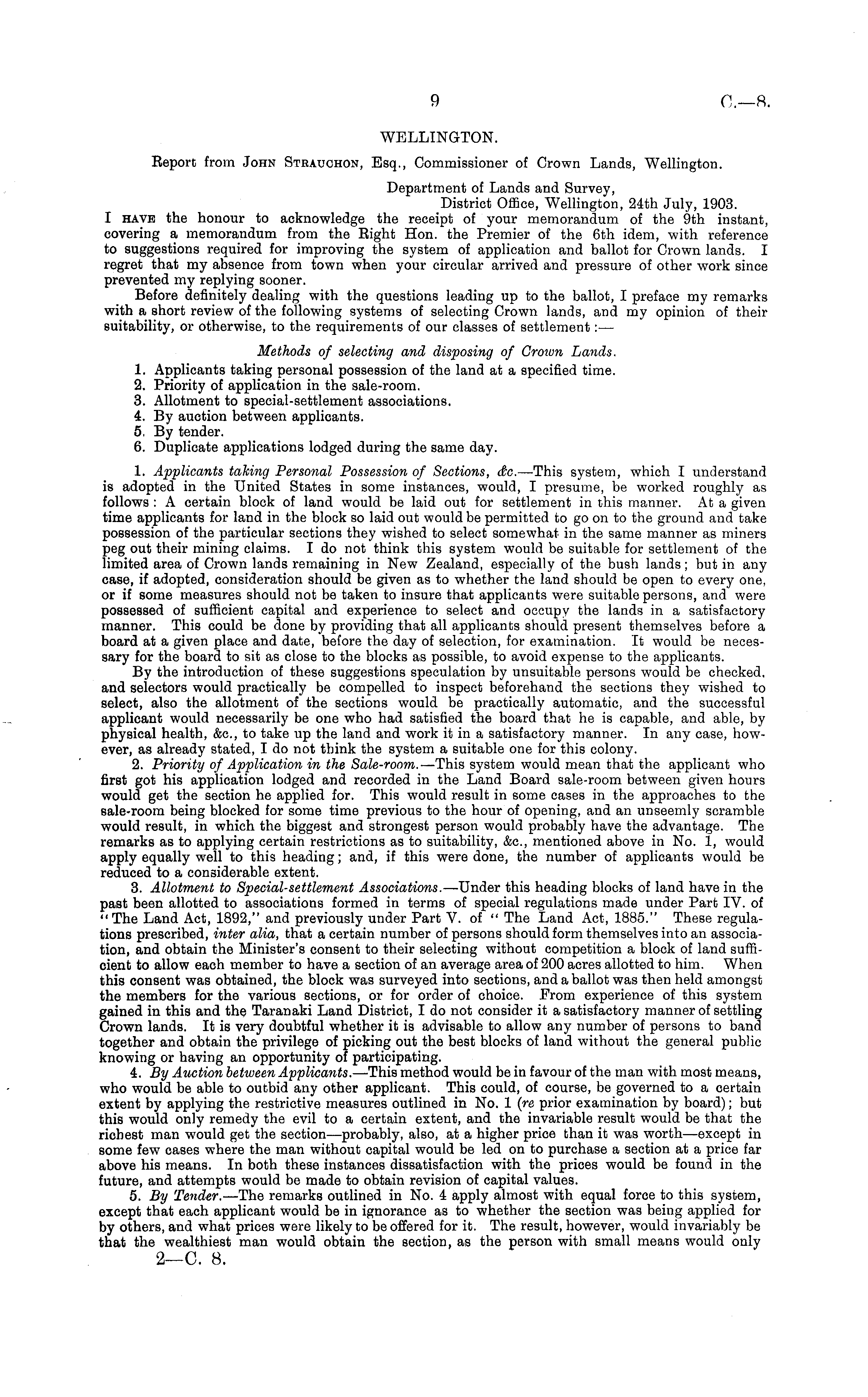 WELLINGTON. Report from John Strauchon, Esq., Commissioner of Crown Lands, Wellington. Department of Lands and Survey, District Office, Wellington, 24th July, 1903. I have the honour to acknowledge the receipt of your memorandum of the 9th instant, covering a memorandum from the Eight Hon. the Premier of the 6th idem, with reference to suggestions required for improving the system of application and ballot for Crown lands. I regret that my absence from town when your circular arrived and pressure of other work since prevented my replying sooner. Before definitely dealing with the questions leading up to the ballot, I preface my remarks with a short review of the following systems of selecting Crown lands, and my opinion of their suitability, or otherwise, to the requirements of our classes of settlement: — Methods of selecting and disposing of Croivn Lands. 1. Applicants taking personal possession of the land at a specified time. 2. Priority of application in the sale-room. 3. Allotment to special-settlement associations. 4. By auction between applicants. 5. By tender. 6. Duplicate applications lodged during the same day. 1. Applicants taking Personal Possession of Sections, dc. —This system, which I understand is adopted in the United States in some instances, would, I presume, be worked roughly as follows : A certain block of land would be laid out for settlement in this manner. At a given time applicants for land in the block so laid out would be permitted to go on to the ground and take possession of the particular sections they wished to select somewhat in the same manner as miners peg out their mining claims. Ido not think this system would be suitable for settlement of the limited area of Crown lands remaining in New Zealand, especially of the bush lands; but in any case, if adopted, consideration should be given as to whether the land should be open to every one, or if some measures should not be taken to insure that applicants were suitable persons, and were possessed of sufficient capital and experience to select and occupy the lands in a satisfactory manner. This could be done by providing that all applicants should present themselves before a board at a given place and date, before the day of selection, for examination. It would be necessary for the board to sit as close to the blocks as possible, to avoid expense to the applicants. By the introduction of these suggestions speculation by unsuitable persons would be checked. and selectors would practically be compelled to inspect beforehand the sections they wished to select, also the allotment of the sections would be practically automatic, and the successful applicant would necessarily be one who had satisfied the board that he is capable, and able, by physical health, &c, to take up the land and work it in a satisfactory manner. In any case, however, as already stated, I do not think the system a suitable one for this colony. 2. Priority of Application in the Sale-room. —This system would mean that the applicant who first got his application lodged and recorded in the Land Board sale-room between given hours would get the section he applied for. This would result in some cases in the approaches to the sale-room being blocked for some time previous to the hour of opening, and an unseemly scramble would result, in which the biggest and strongest person would probably have the advantage. The remarks as to applying certain restrictions as to suitability, &c, mentioned above in No. 1, would apply equally well to this heading; and, if this were done, the number of applicants would be reduced to a considerable extent. 3. Allotment to Special-settlement Associations. —Under this heading blocks of land have in the past been allotted to associations formed in terms of special regulations made under Part IV. of "The Land Act, 1892," and previously under Part V. of " The Land Act, 1885." These regulations prescribed, inter alia, that a certain number of persons should form themselves into an association, and obtain the Minister's consent to their selecting without competition a block of land sufficient to allow each member to have a section of an average area of 200 acres allotted to him. When this consent was obtained, the block was surveyed into sections, and a ballot was then held amongst the members for the various sections, or for order of choice. From experience of this system gained in this and the Taranaki Land District, I do not consider it a satisfactory manner of settling Crown lands. It is very doubtful whether it is advisable to allow any number of persons to band together and obtain the privilege of picking out the best blocks of land without the general public knowing or having an opportunity of participating. 4. By Auction between Applicants. —This method would be in favour of the man with most means, who would be able to outbid any other applicant. This could, of course, be governed to a certain extent by applying the restrictive measures outlined in No. 1 (re prior examination by board); but this would only remedy the evil to a certain extent, and the invariable result would be that the richest man would get the section—probably, also, at a higher price than it was worth—except in some few cases where the man without capital would be led on to purchase a section at a price far above his means. In both these instances dissatisfaction with the prices would be found in the future, and attempts would be made to obtain revision of capital values. 5. By Tender. —The remarks outlined in No. 4 apply almost with equal force to this system, except that each applicant would be in ignorance as to whether the section was being applied for by others, and what prices were likely to be offered for it. The result, however, would invariably be that the wealthiest man would obtain the section, as the person with small means would only 2—C. 8.