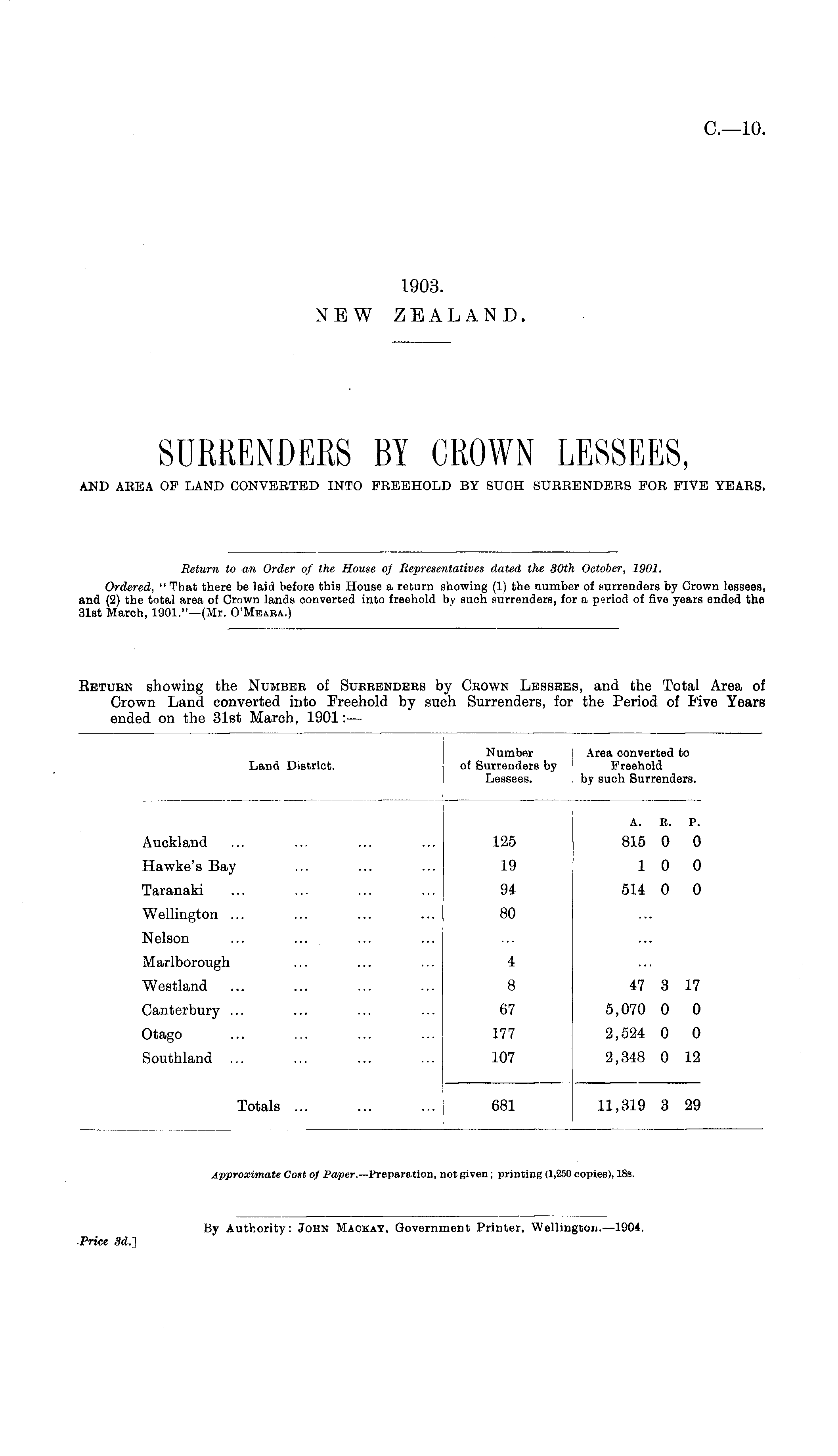 Land District. Number of Surrenders by Lessees. Area converted to Freehold by such Surrenders. Auckland 125 A. 815 E. 0 p. 0 Hawke's Bay 19 1 0 0 Taranaki 94 514 0 0 Wellington ... 80 Nelson Maryborough 4 Westland 8 47 3 17 Canterbury ... 67 5,070 0 0 Otago 177 2,524 0 0 Southland 107 2,348 0 12 Totals ... 681 11,319 3 29