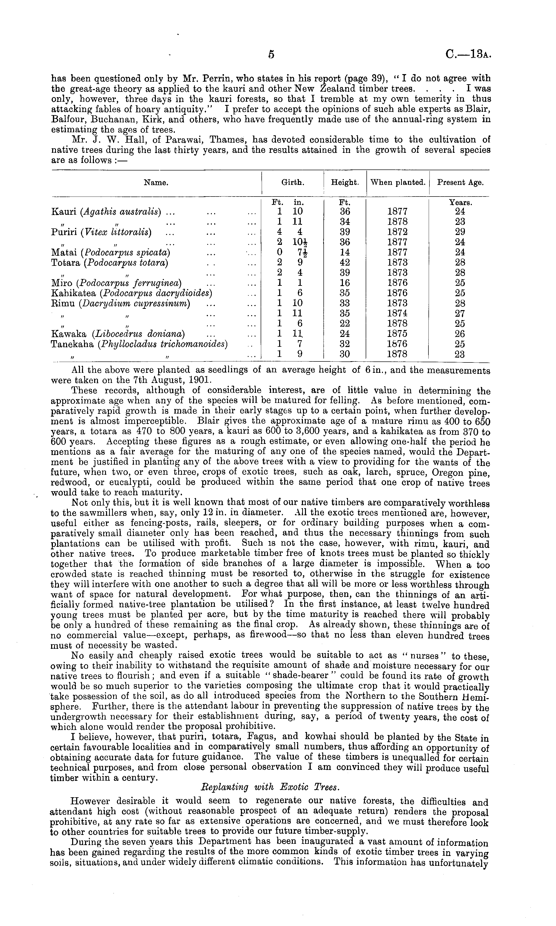 has been questioned only by Mr. Perrin, who states in his report (page 39), " I do not agree with the great-age theory as applied to the kauri and other New Zealand timber trees. ... I was only, however, three days in the kauri forests, so that I tremble at my own temerity in thus attacking fables of hoary antiquity." I prefer to accept the opinions of such able experts as Blair, Balfour, Buchanan, Kirk, and others, who have frequently made use of the annual-ring system in estimating the ages of trees. Mr. J. W. Hall, of Parawai, Thames, has devoted considerable time to the cultivation of native trees during the last thirty years, and the results attained in the growth of several species are as follows :—