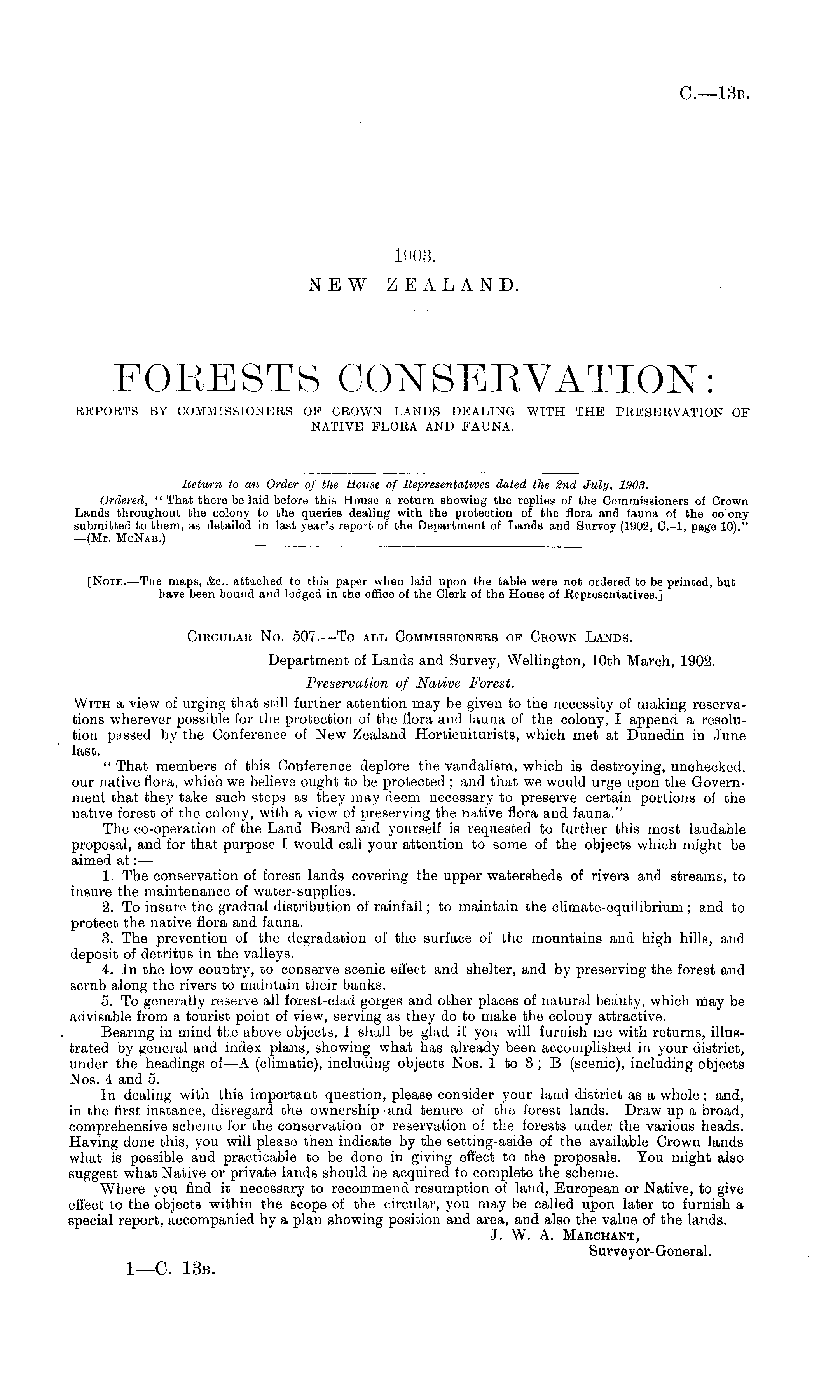 [Note. —The maps, &c, attached to this paper when laid upon the table were not ordered to be printed, but have been bound and lodged in the office of the Clerk of the House of Representatives.] Cibculab No. 507.—T0 all Commissioners of Crown Lands. Department of Lands and Survey, Wellington, 10th March, 1902. Preservation of Native Forest. With a view of urging that still further attention may be given to the necessity of making reservations wherever possible for the protection of the flora and fauna of the colony, I append a resolution passed by the Conference of New Zealand Horticulturists, which met at Dunedin in June last. " That members of this Conference deplore the vandalism, which is destroying, unchecked, our native flora, which we believe ought to be protected ; and that we would urge upon the Government that they take such steps as they may deem necessary to preserve certain portions of the native forest of the colony, with a view of preserving the native flora and fauna." The co-operation of the Land Board and yourself is requested to further this most laudable proposal, and for that purpose I would call your attention to some of the objects which might be aimed at:— 1. The conservation of forest lands covering the upper watersheds of rivers and streams, to insure the maintenance of water-supplies. 2. To insure the gradual distribution of rainfall; to maintain the climate-equilibrium ; and to protect the native flora and fauna. 3. The prevention of the degradation of the surface of the mountains and high hills, and deposit of detritus in the valleys. 4. In the low country, to conserve scenic effect and shelter, and by preserving the forest and scrub along the rivers to maintain their banks. 5. To generally reserve all forest-clad gorges and other places of natural beauty, which may be advisable from a tourist point of view, serving as they do to make the colony attractive. Bearing in mind the above objects, I shall be glad if you will furnish me with returns, illustrated by general and index plans, showing what has already been accomplished in your district, under the headings of —A (climatic), including objects Nos. 1 to 3 ; B (scenic), including objects Nos. i and 5. In dealing with this important question, please consider your land district as a whole; and, in the first instance, disregard the ownership • and tenure of the forest lands. Draw up a broad, comprehensive scheme for the conservation or reservation of the forests under the various heads. Having done this, you will please then indicate by the setting-aside of the available Crown lands what is possible and practicable to be done in giving effect to the proposals. You might also suggest what Native or private lands should be acquired to complete the scheme. Where you find it necessary to recommend resumption of land, European or Native, to give effect to the objects within the scope of the circular, you may be called upon later to furnish a special report, accompanied by a plan showing position and area, and also the value of the lands. J. W. A. Mabchant, Surveyor-General. I—C. 13b.