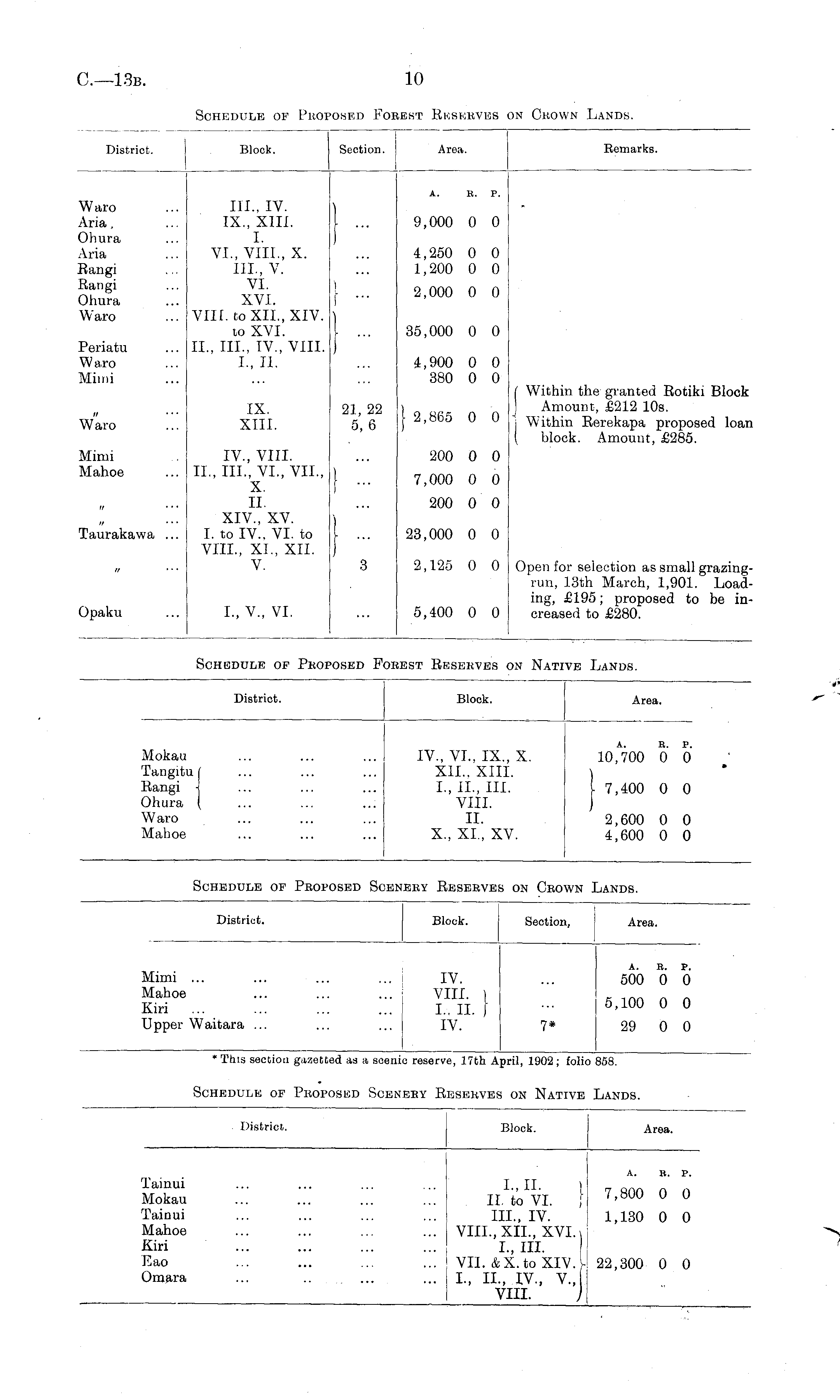 District. Block. Area. Mokau Tangitu ( Rangi -I Ohura ( Waro Mahoe IV., VI., IX., X. XII., XIII. I., II., III. VIII. II. X., XL, XV. 10,700 7,400 B. 0 0 p. 0 0 2,600 4,600 0 0 0 0