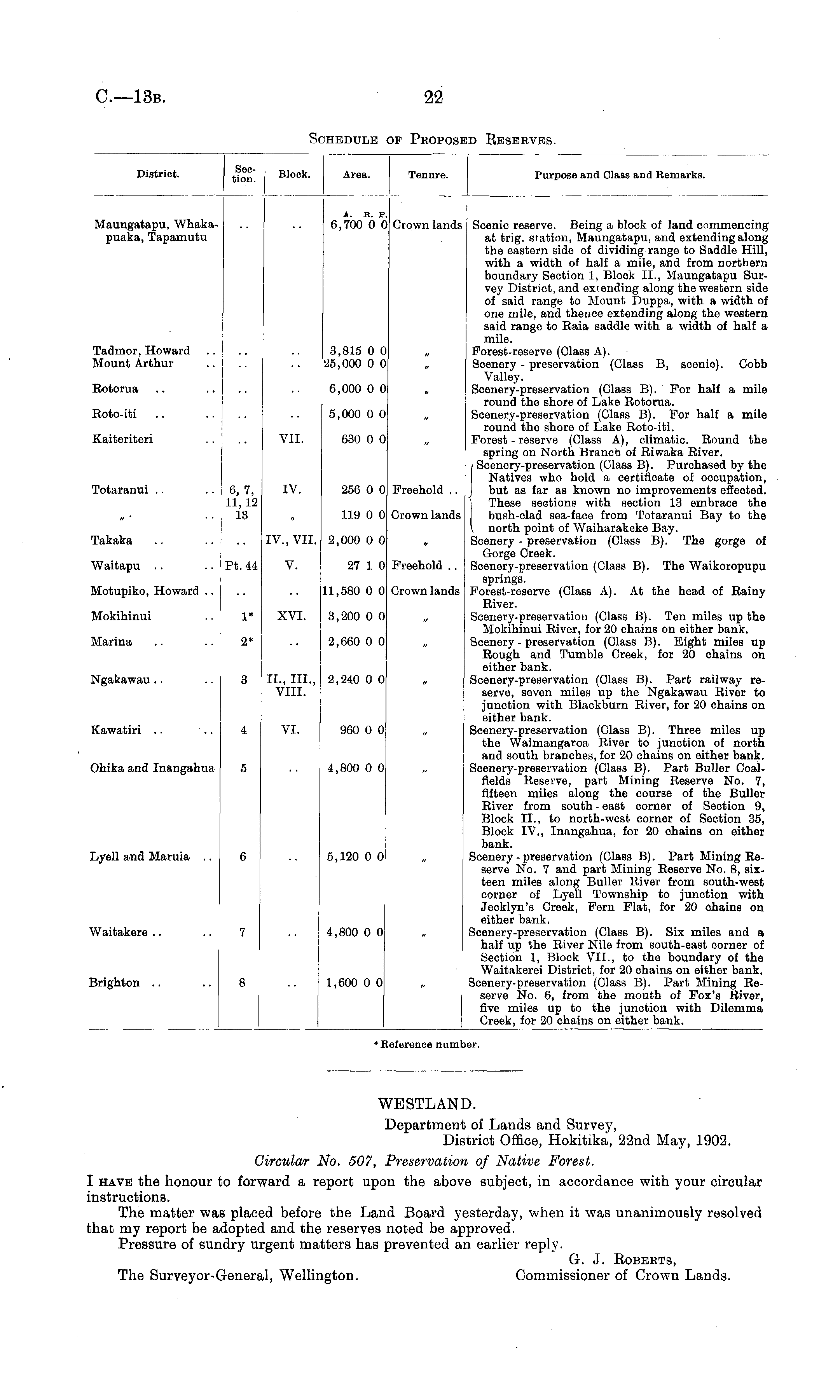 WBSTLAND. Department of Lands and Survey, District Office, Hokitika, 22nd May, 1902. Circular No. 507, Preservation of Native Forest. I have the honour to forward a report upon the above subject, in accordance with your circular instructions. The matter was placed before the Land Board yesterday, when it was unanimously resolved that my report be adopted and the reserves noted be approved. Pressure of sundry urgent matters has prevented an earlier reply. G. J. EOBEBTS, The Surveyor-General, Wellington. Commissioner of Crown Lands.