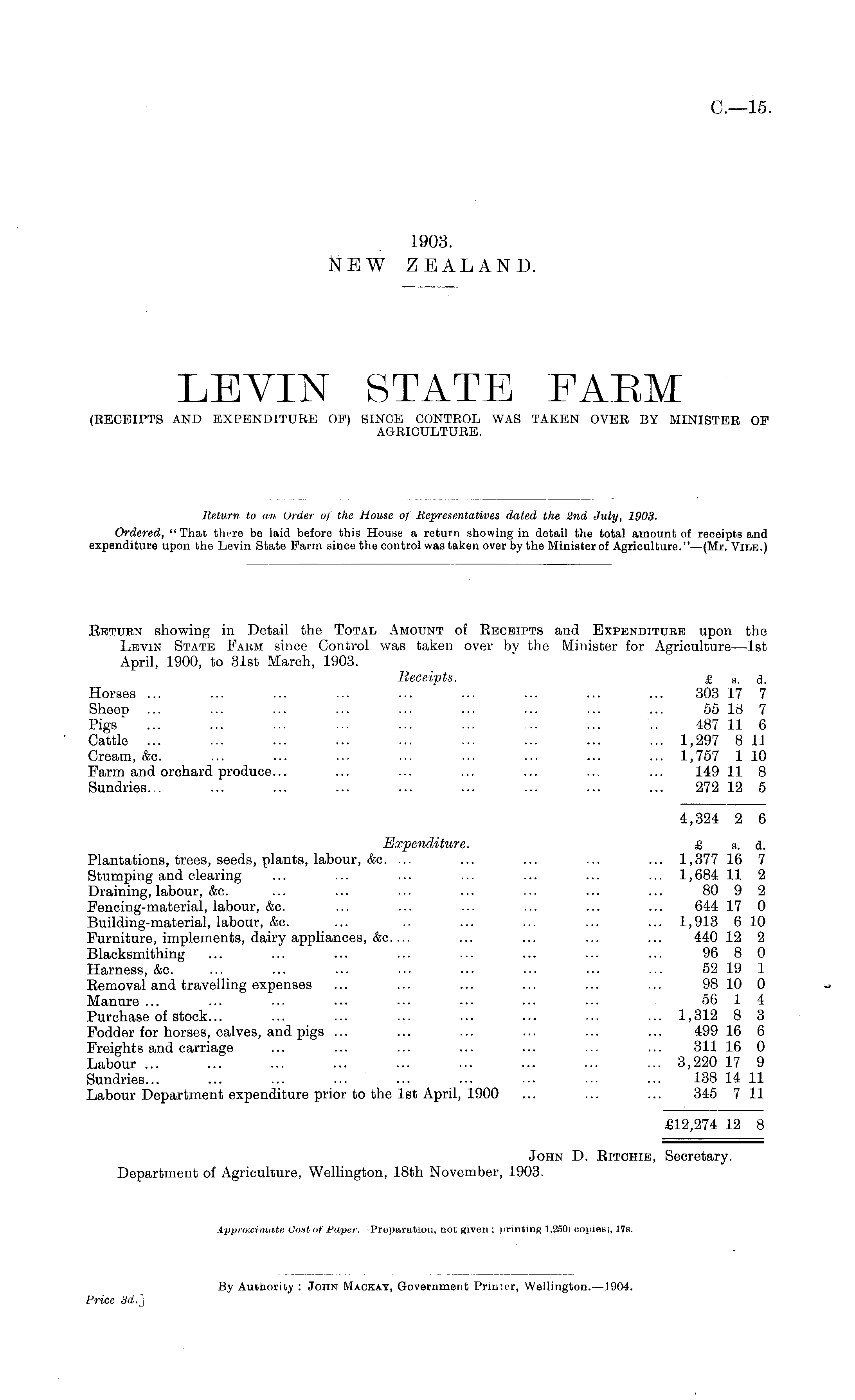 Retubn showing in Detail the Total Amount of Receipts and Expenditure upon the Levin State Fakm since Control was taken over by the Minister for Agriculture—lst April, 1900, to 31st March, 1903. Receipts. £ B . d. Horses ... ... ... ... ... ... ... ... ... 303 17 7 Sheep ... ... ... ... ... ... ... ... ... 55 18 7 Pigs* ... ... ... ... ... ... ... ... '.. 487 11 6 Cattle ... ... ... ... ... ... ... ... ... 1,297 811 Cream, &c. ... ... ... ... ... ... ... ... 1,757 1 10 Farm and orchard produce... ... ... ... ... ... ... 149 11 8 Sundries... ... ... ... ... ... ... ... ... 272 12 5 4,324 2 6 Expenditure. £ s. d. Plantations, trees, seeds, plants, labour, &c. ... ... ... ... ... 1,377 16 7 Stumping and clearing ... ... ... ... ... ... ... 1,684 11 2 Draining, labour, &c. ... ... ... ... ... ... ... 80 9 2 Fencing-material, labour, &c. ... ... ... ... ... ... 644 17 0 Building-material, labour, &c. ... .. ... ... ... ... 1,913 6 10 Furniture, implements, dairy appliances, &c.... ... ... ... ... 440 12 2 Blacksmithing ... ... ... ... ... ... ... ... 96 8 0 Harness, &c. ... ... ... ... ... ... ... ... 52 19 1 Removal and travelling expenses ... ... ... ... ... ... 98 10 0 Manure ... ... ... ... ... ... ... ... 56 1 4 Purchase of stock... ... ... ... ... ... ... ... 1,312 8 3 Fodder for horses, calves, and pigs ... ... ... ... ... ... 499 16 6 Freights and carriage ... ... ... ... ... ... ... 311 16 0 Labour 3,220 17 9 Sundries... ... ... ... ... ... ... ... ... 138 14 11 Labour Department expenditure prior to the Ist April, 1900 ... ... ... 345 711 £12,274 12 8 John D. Ritchie, Secretary. Department of Agriculture, Wellington, 18th November, 1903. Approximate Gout of Pa/per. —Preparation, nor given ; printing 1.250) copies), 17s.