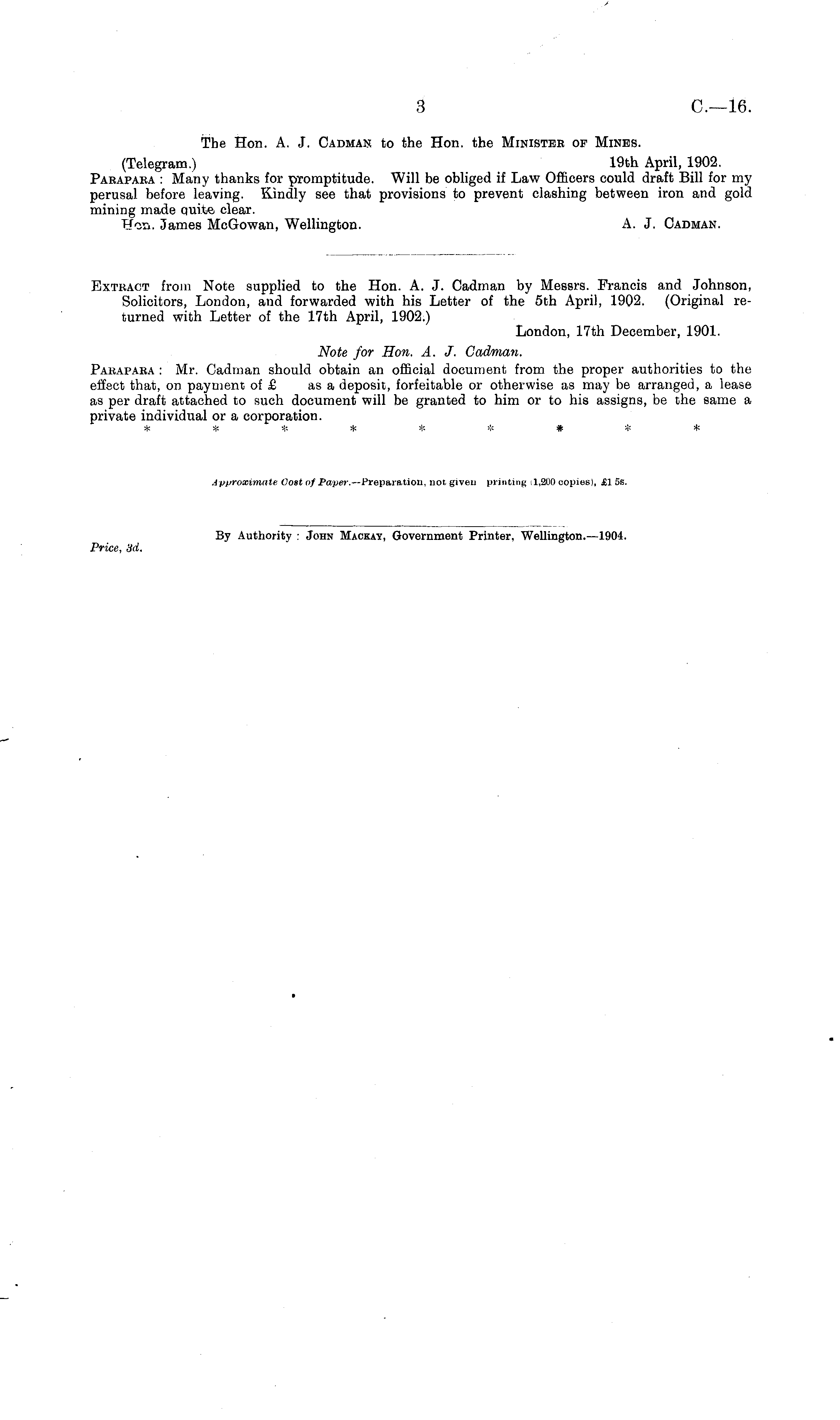 The Hon. A. J. Cadman to the Hon. the Ministeb of Mines. (Telegram.) 19th April, 1902. Parapaea : Many thanks for promptitude. Will be obliged if Law Officers could draft Bill for my perusal before leaving. Kindly see that provisions to prevent clashing between iron and gold mining made quite clear. Hon. James McGowan, Wellington. A. J. Cadman. Extract from Note supplied to the Hon. A. J. Cadman by Messrs. Francis and Johnson, Solicitors, London, and forwarded with his Letter of the sth April, 1902. (Original returned with Letter of the 17th April, 1902.) London, 17th December, 1901. Note for Hon. A. J. Gadman. Pakapaea : Mr. Cadman should obtain an official document from the proper authorities to the effect that, on payment of £ as a deposit, forfeitable or otherwise as may be arranged, a lease as per draft attached to such document will be granted to him or to his assigns, be the same a private individual or a corporation. Approximate Cost of Pape)\ —Preparation, not giveu printing ,1,200 copies), £1 ss.