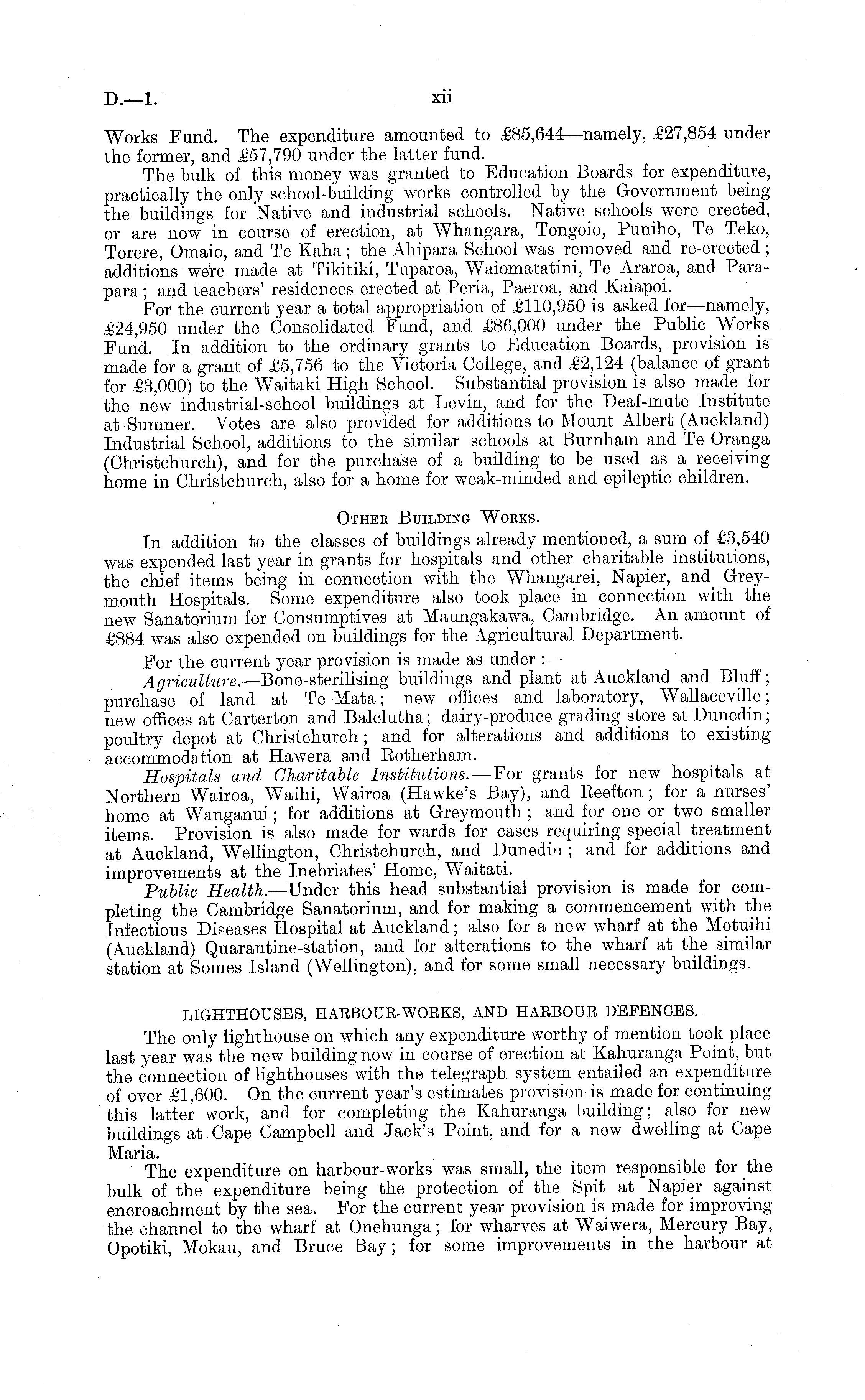 Works Fund. The expenditure amounted to £85,644 —namely, £27,854 under the former, and £57,790 under the latter fund. The bulk of this money was granted to Education Boards for expenditure, practically the only school-building works controlled by the Government being the buildings for Native and industrial schools. Native schools were erected, or are now in course of erection, at Whangara, Tongoio, Puniho, Te Teko, Torere, Omaio, and Te Kaha; the Ahipara School was removed and re-erected; additions we're made at Tikitiki, Tuparoa, Waiomatatini, Te Araroa, and Parapara ; and teachers' residences erected at Peria, Paeroa, and Kaiapoi. For the current year a total appropriation of £110,950 is asked for—namely, £24,950 under the Consolidated Fund, and £86,000 under the Public Works Fund. In addition to the ordinary grants to Education Boards, provision is made for a grant of £5,756 to the Victoria College, and £2,124 (balance of grant for £3,000) to the Waitaki High School. Substantial provision is also made for the new industrial-school buildings at Levin, and for the Deaf-mute Institute at Sumner. Votes are also provided for additions to Mount Albert (Auckland) Industrial School, additions to the similar schools at Burnham and Te Oranga (Christchurch), and for the purchase of a building to be used as a receivinghome in Christchurch, also for a home for weak-minded and epileptic children. Other Building Woeks. In addition to the classes of buildings already mentioned, a sum of £3,540 was expended last year in grants for hospitals and other charitable institutions, the chief items being in connection with the Whangarei, Napier, and Greymouth Hospitals. Some expenditure also took place in connection with the new Sanatorium for Consumptives at Maungakawa, Cambridge. An amount of £884 was also expended on buildings for the Agricultural Department. For the current year provision is made as under : — Agriculture. —Bone-sterilising buildings and plant at Auckland and Bluff; purchase of land at Te Mata; new offices and laboratory, Wallaceville; new offices at Carterton and Balclutha; dairy-produce grading store at Dunedin; poultry depot at Christchurch ; and for alterations and additions to existing accommodation at Hawera and Eotherham. Hospitals and Charitable Institutions. — For grants for new hospitals at Northern Wairoa, Waihi, Wairoa (Hawke's Bay), and Keefton ; for a nurses' home at Wanganui; for additions at Greymouth ; and for one or two smaller items. Provision is also made for wards for cases requiring special treatment at Auckland, Wellington, Christchurch, and Dunedin ; and for additions and improvements at the Inebriates' Home, Waitati. Public Health. —Under this head substantial provision is made for completing the Cambridge Sanatorium, and for making a commencement with the Infectious Diseases Hospital at Auckland; also for a new wharf at the Motuihi (Auckland) Quarantine-station, and for alterations to the wharf at the similar station at Somes Island (Wellington), and for some small necessary buildings. LIGHTHOUSES, HABBOUE-WOEKS, AND HARBODE DEFENCES. The only lighthouse on which any expenditure worthy of mention took place last year was the new building now in course of erection at Kahuranga Point, but the connection of lighthouses with the telegraph system entailed an expenditure of over £1,600. On the current year's estimates provision is made for continuing this latter work, and for completing the Kahuranga building; also for new buildings at Cape Campbell and Jack's Point, and for a new dwelling at Cape Maria. The expenditure on harbour-works was small, the item responsible for the bulk of the expenditure being the protection of the Spit at Napier against encroachment by the sea. For the current year provision is made for improving the channel to the wharf at Onehunga; for wharves at Waiwera, Mercury Bay, Opotiki, Mokau, and Bruce Bay ; for some improvements in the harbour at
