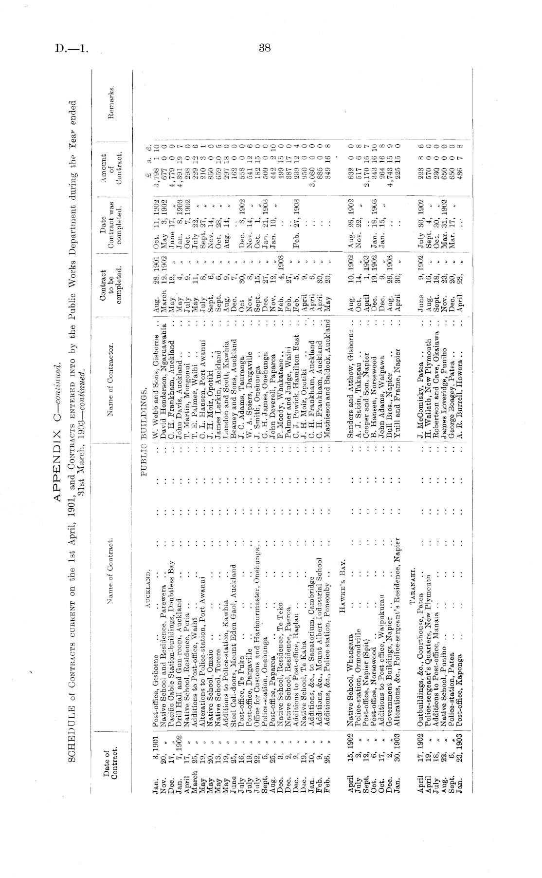 Date of Contract. Name of Contract. Name of Contractor. Contract to be completed. Date Contract was completed. Amount of Contract. Remarks. Auckland. PUBLIC BUILDINGS. £ s. d. 3,798 1 10 677 0 0 4,779 0 0 4,391 19 7 298 0 0 229 12 6 210 3 1 850 0 0 659 10 5 297 18 0 162 0 0 558 0 0 541 12 6 182 15 0 509 0 0 442 2 10 499 35 0 387 17 0 239 12 4 950 0 0 3,080 0 0 885 0 0 349 16 8 Jan. 3, 1901 Nov. 20, „ Dec. 17, „ Jan. 7, 1902 April 17, „ March 25, „ May 19, „ May 20, „ May 13, „ May 19, „ June 25, July 16, „ July 19, „ July 22, „ Sept. 5, „ Aug. 25, „ Deo. 3, „ Dec. 2, „ Dec. 2, „ Dec. 19, „ Jan. 10, Feb. 9, „ Feb. 26, „ Post-office, Gisborne Native School and Residence, Parewera Pacific Cable Station-buildings, Doubtless Bay Drill Hall and Gun-room, Auckland Native School, Residence, Peria .. Additions to Post-office, Waihi Alterations to Police-station, Port Awanui Native School, Omaio Native School, Torere Additions to Police-station, Kawhia Steel Cell-doors, Mount Eden Gaol, Auckland Post-office, Te Puke Post-office, Dargaville Offioe for Customs and Harbourmaster, Onehunga.. Police-station, Onehunga Post-office, Paparoa Native School, Residence, Te Teko Native School, Residence, Paeroa Additions to Post-office, Raglan .. Native School, Te Kaha Additions, &c, to Sanatorium, Cambridge Additions, &c, Mount Albert Industrial School Additions, &c, Police station, Ponsonby .. .. I W. Webb and Sons, Gisborne .. .. David Henderson, Ngaruawahia .. C. H. Frankham, Auckland .. j John Davis, Auckland .. .. ! T. Martin, Mongonui .. .. j T. E. Palmer, Waihi .. .. j 0. L. Hansen, Port Awanui .. J. H. Moir, Opotiki .. I James Larkin, Auckland .. | Lundon and Scott, Kawhia .. j Beaney and Sons, Auckland .. J. C. Adams, Tauranga .. W. A. Spiers, Dargaville .. J. Smith, Onehunga .. .. G. H. James, Onehunga .. John Deverell, Paparoa .. F. Moody, Whakatane.. .. Palmer and Judge, Waihi .. C. J. Powick, Hamilton East .. .. J. H. Moir, Opotiki .. C. H. Frankham, Auckland .. C. H. Frankham, Auckland .. Mathieson and Baldock, Auckland Aug. 28, 1901 March 12, 1902 May 12, „ May ' 4, „ July 9, „ May 11, „ July 8, „ Sept. 6, „ Sept. 6, „ Aug. 9, „ Dec. 7, „ Oct 30, „ Nov. 8, „ Sept. 15, „ Dec. 27, „ Nov. 12, „ Feb. 4, 1903 Feb. 27, „ Feb. 5, . April 9, „ April 6, „ April 30, „ May 20, „ Oct. 11, 1902 May 3, 1902 June 17, „ Jan. 8, 1903 Oct. 7, 1902 July 22, , Sept. 27, „ Nov. 14, „ Oct.. 28, „ Aug. 14, Dec. 3, 1902 Nov. 14, „ Oct. 1, „ Jan. 21, 1903 Jan. 10, „ Feb. 27, 1903 April 15, 1902 July 2, „ Sept. 12, „ Oot. 6, „ Oct. 17, „ Dec. 2, „ Jan. 30,1903 Hawke's Bay. Aug. 10, 1902 Oct. 14, „ April 1, 1903 Dec. 19, 1902 Dec. 9, „ Aug. 26, 1903 April 30, „ Aug. 26, 1902 Nov. 22, , Native Sohool, Whangara Police-station, Ormonaville Post-office, Napier (Spit) Post-office, Norsewooa Additions to Post-office, Waipukurau Government Buildings, Napier Alterations, &c, Police-sergeant's Residence, Napier .. ! Sanders and Atthow, Gisborne .. .. ! A. J. Sabin, Takapau .. .. ; Cooper and Son, Napier .. B. Hansen, Norsewood .. John Adams, Waipawa .. j Bull Bros., Napier .. Yuill and Frame, Napier Jan. 18, 1903 Jan. 15, „ 832 0 0 517 6 8 2,170 16 7 343 16 10 264 16 8 4,743 15 9 225 15 0 April 17, 1902 April 19, „ July 18, „ Aug. 22, „ Sept. 6, , Jan. 23, 1903 Taranaki. Outbuildings, &c, Courthouse, Patea Police-sergeant's Quarters, New Plymouth Additions to Post-office, Manaia Native School, Puniho Police-station, Patea Post-office, Kaponga ..J. McComisky, Patea .. .. j H. Wallath, New Plymouth .. i Robertson and Cave, Okaiawa .. .. James Loveridge, Puniho .. George Boagey, Patea .. .. A. R. Burrell, Hawera June 9, 1902 Aug. 16, „ Sept. 18, . Nov. 23, „ Dec. 20, „ April 23, „ July 30, 1902 Sept. 4, „ Oct. 30, „ Mar. 31, 1903 Mar. 17, „ 223 8 6 570 0 0 23Q 0 0 650 0 0 650 0 0 436 7 8
