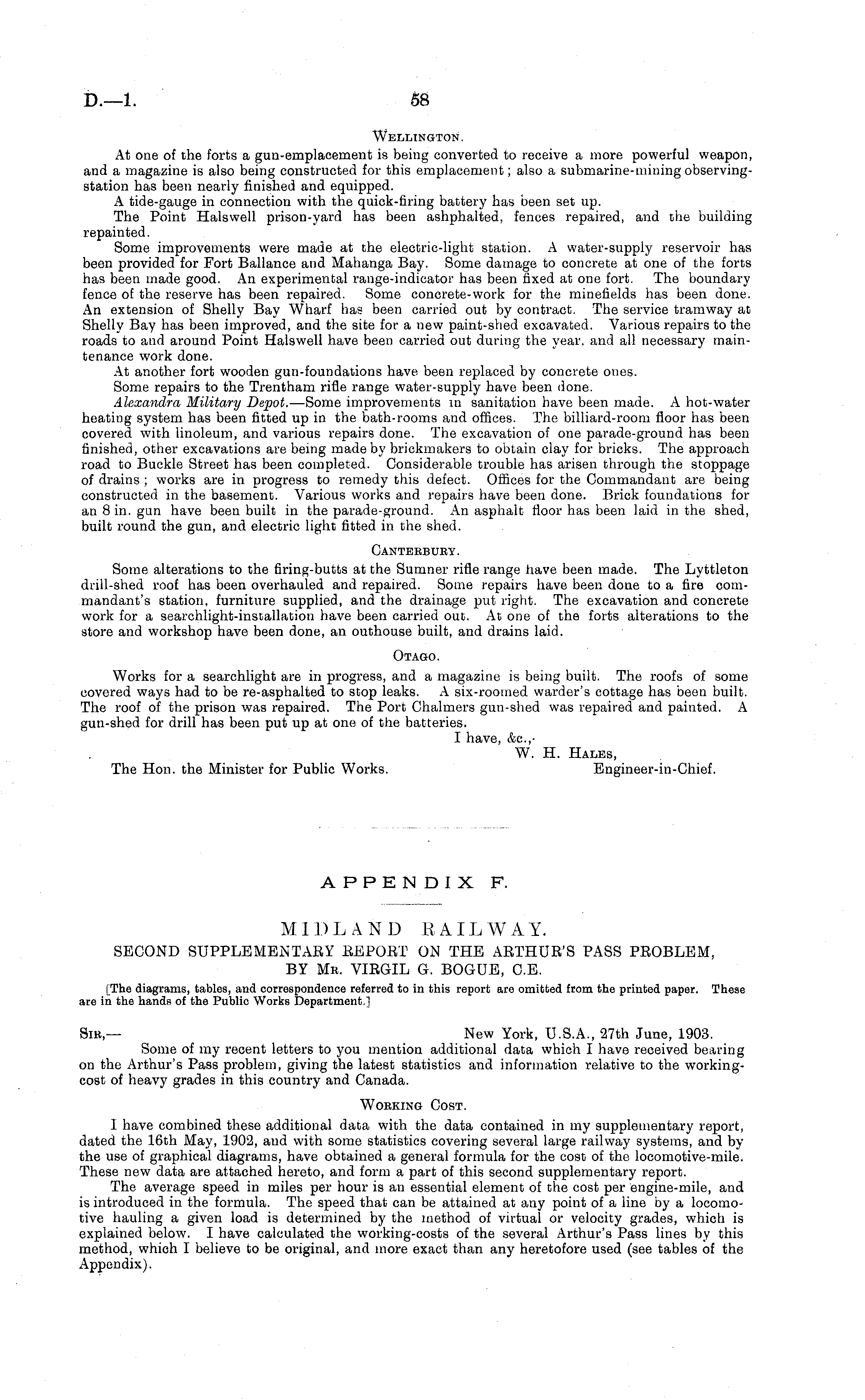 MIDLAND RAILWAY. SECOND SUPPLEMENTARY EEPOBT ON THE ARTHUR'S PASS PROBLEM, BY Mr. VIRGIL G. BOGUE, C.E. [The diagrams, tables, and correspondence referred to in this report are omitted from the printed paper. These are in the hands of the Public Works Department.] Sir,— New York, U.S.A., 27th June, 1903. Some of my recent letters to you mention additional data which I have received bearing on the Arthur's Pass problem, giving the latest statistics and information relative to the workingcost of heavy grades in this country and Canada. Working Cost. I have combined these additional data with the data contained in my supplementary report, dated the 16th May, 1902, aud with some statistics covering several large railway systems, and by the use of graphical diagrams, have obtained a general formula for the cost of the locomotive-mile. These new data are attached hereto, and form a part of this second supplementary report. The average speed in miles per hour is an essential element of the cost per engine-mile, and is introduced in the formula. The speed that can be attained at any point of a line by a locomotive hauling a given load is determined by the method of virtual or velocity grades, which is explained below. I have calculated the working-costs of the several Arthur's Pass lines by this method, which I believe to be original, and more exact than any heretofore used (see tables of the Appendix).