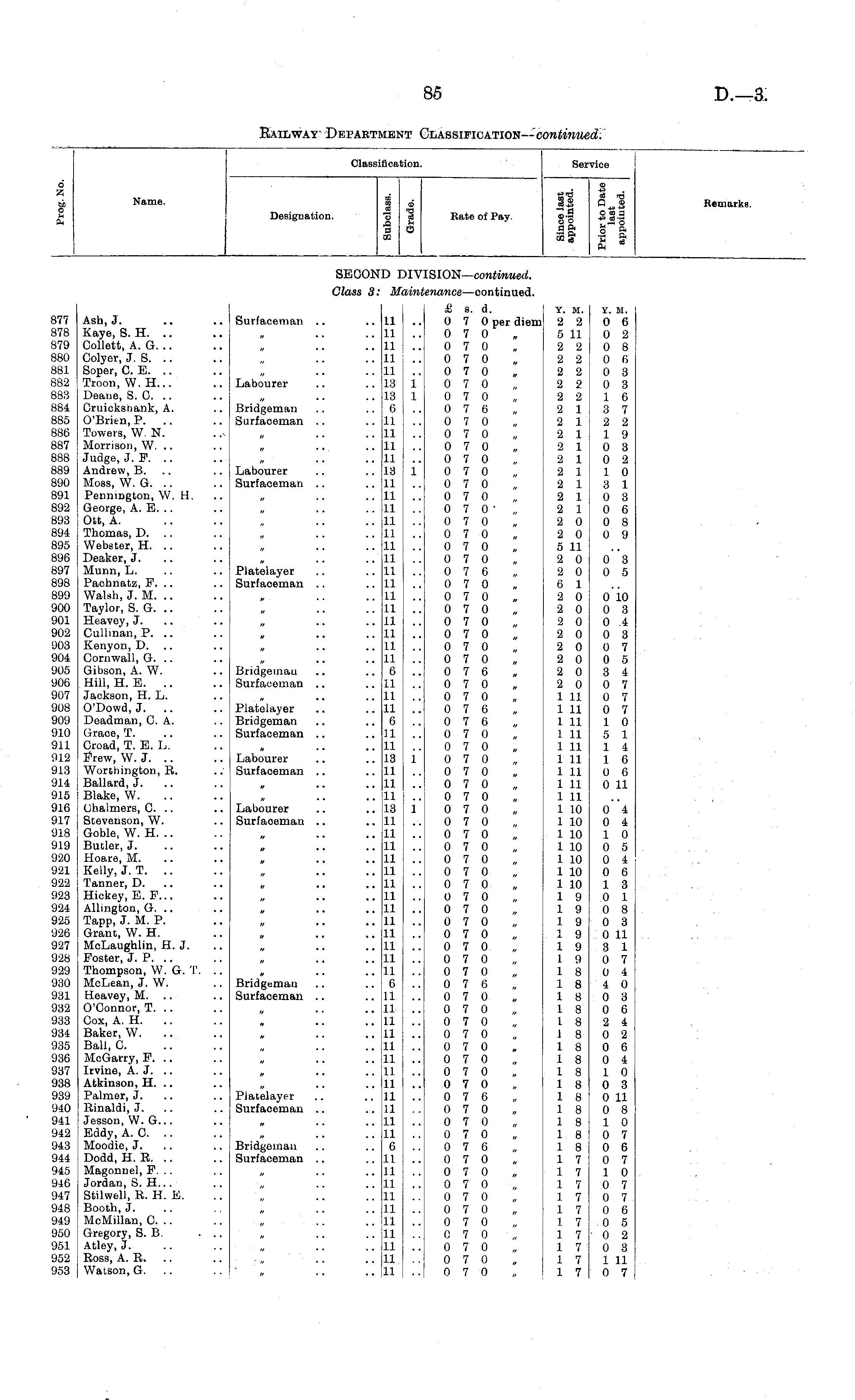 Clasi dfici ition. Service d •A f Name. % a ! it Ij *•§ 3 3-3 o ° 7-2 o It 11 Remarks. Designation. Rate of Pay. SEOOIS il SION — continued. Class 3 d', >,nance —continued. .77 (78 179 180 183 (82 188 184 iS5 186 S87 i88 >89 (90 191 !92 )98 !94 596 i% i97 i'JH S99 )00 )01 )02 )08 X>4 )0S )06 )07 )08 )09 )io 111 112 )18 )14 )15 )16 )17 )18 )19 )20 )21 )22 128 )24 )25 )26 )27 )28 )29 )80 )81 )82 )88 )84 )35 )3G S37 )38 )39 MO Ml 142 )43 )44 >io )46 )47 )48 M'J )50 )61 )52 )53 Ash, J. Kaye, S. H. .. Collett, A. G. .. Colyer, J. S. .. Soper, C. E. .. Troon, W. H... Deaue, S. C. .. Cruicksnank, A. O'Brien, P. .. Towers, W. N. Morrison, W. Judge, J. F. .. Andrew, B. .. Moss, W. G. .. PenniDgton, W. H. George, A. E. .. Ott, A. Thomas, D. Webeter, H. .. Deaker, J. Munn, L. Paohnatz, F. .. Walsh, J. M. .. Taylor, S. G. .. Heavey, J. Cullinan, P. .. Kenyon, D. .. Cornwall, G. .. Gibson, A. W. Hill, H. B. .. Jackson, H. L. O'Dowd, J. Deadman, C. A. Grace, T. Oroad, T. E. L. Frew, W. J. .. Worchington, R. Ballard, J. Blake, W. Ohalmers, C. .. Stevenson, W. Goble, W. H. .. Butler, J. Hoare, M. Kelly, J. T. .. Tanner, D. .. Hiokey, E. F... Allington, G. .. Tapp, J. M. P. Grant, W. H. McLaughlin, H. J. Foster, J. P. .. Thompson, W. G. T. .. McLean, J. W. Heavey, M. .. O'Connor, T. .. Cox, A. H. Baker, W. Ball, C. MoGarry, F. .. Irvine, A. J. .. Atkinson, H. .. Palmer, J. Binaldi, J. Jesson, W. G... Eddy, A. 0. .. Moodie, J. Dodd, H. R. .. Magonuel, F. .. Jordan, S. H... Stilwell, R. H. E. Booth, J. McMillan, C. .. Gregory, S. B. ... Atley, J. Ross, A. R. Watson, G. .. Surfaceman .. Labourer Bridgeman Surfaceman .. Labourer Surfaceman .. Platelayer Surfaoeman .. Bridgemau Surfaceman .. Platelayer Bridgeman Surfaceman .. Labourer Surfaceman .. 11 11 11 11 11 13 13 6 11 11 11 11 13 11 11 11 11 LI 11 11 11 11 11 11 11 11 11 11 6 11 11 11 6 11 11 13 11 11 11 13 11 11 11 11 11 11 11 11 11 11 11 11 11 6 11 11 11 11 11 11 11 11 11 11 11 11 6 11 11 11 11 11 1-1 11 11 11 11 1 1 1 1 £ s. d. 0 7 0 per diem 0 7 0 0 7 0 0 7 0 0 7 0 0 7 0 0 7 0 0 7 6 0 7 0 0 7 0 0 7 0 0 7 0 0 7 0 0 7 0 0 7 0 0 7 0- „ 0 7 0 0 7 0 0 7 0 0 7 0 0 7 6 0 7 0 0 7 0 0 7 0 0 7 0 0 7 0 0 7 0 0 7 0 0 7 6 0 7 0 0 7 0 0 7 6 0 7 6 0 7 0 0 7 0 0 7 0 0 7 0 0 7 0 0 7 0 0 7 0 0 7 0 0 7 0 0 7 0 0 7 0 0 7 0 0 7 0 0 7 0 0 7 0 0 7 0 0 7 0 0 7 0 0 7 0 0 7 0 0 7 6 0 7 0 0 7 0 0 7 0 0 7 0 0 7 0 0 7 0 0 7 0 0 7 0 0 7 6 0 7 0 0 7 0 0 7 0 0 7 6 0 7 0 0 7 0 0 7 0 0 7 0 0 7 0 , 0 7 0 0 7 0 0 7 0 0 7 0 0 7 0 Y. M. 2 2 5 11 2 2 2 2 2 2 2 2 2 2 2 1 2 1 2 1 2 1 2 1 2 1 2 1 2 1 2 1 2 0 2 0 5 11 2 0 2 0 6 1 2 0 2 0 2 0 2 0 2 0 2 0 2 0 2 0 1 11 1 11 1 11 1 11 1 11 1 11 1 11 1 11 1 11 1 10 1 10 1 10 1 10 1 10 1 10 1 10 1 9 1 9 1 9 1 9 1 9 1 9 1 8 1 8 1 8 1 8 1 8 1 8 1 8 1 8 1 8 1 8 1 8 1 8 1 8 1 8 1 8 1 7 1 7 1 7 1 7 1 7 1 7 1 7 1 7 1 7 1 7 Y. M. 0 6 0 2 0 8 0 6 0 3 0 3 1 6 3 7 2 2 1 9 0 3 0 2 1 0 3 1 0 3 0 6 0 8 0 9 o"3 0 5 0 10 0 3 0 A 0 3 0 7 0 5 3 4 0 7 0 7 0 7 1 0 S 1 1 4 1 6 0 6 I 0 11 Labourer Surfaoeman .. Bridgemau Surfaceman .. 1 0 4 0 4 1 0 0 5 0 4 0 6 1 3 0 1 0 8 0 3 0 11 3 1 0 7 0 4 4 0 0 3 0 6 2 4 0 2 0 6 0 4 1 0 0 3 0 11 0 8 1 0 0 7 0 6 0 7 1 0 0 7 0 7 0 6 0 5 " 0 2 0 3 1 11 0 7 Platelayer Surfaoeman .. Bridgemau Surfaceman ..