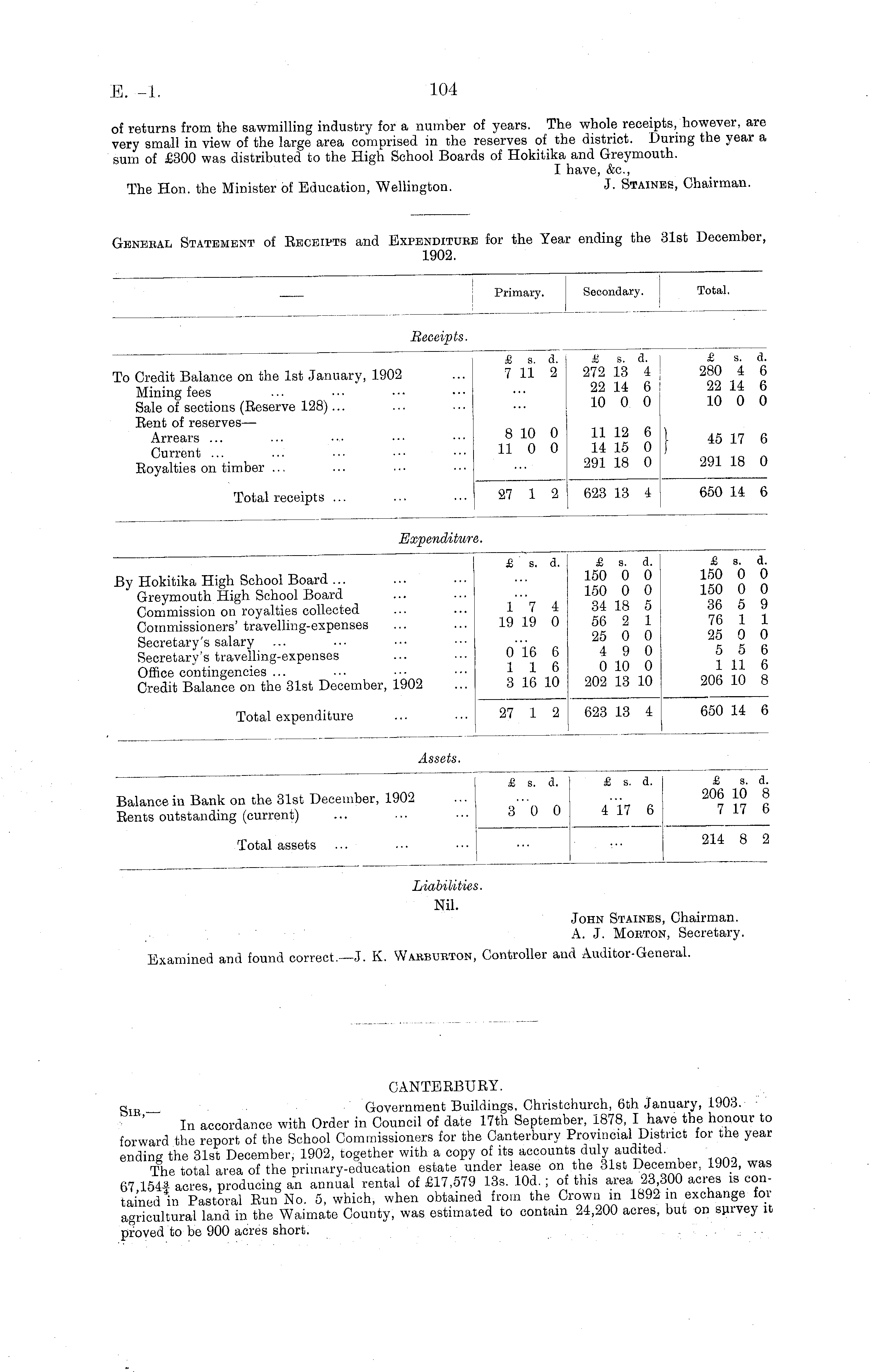 CANTERBURY, o __ Government Buildings, Christchurch, 6th January, 1903. - In accordance with Order in Council of date 17th September, 1878, I have the honour to forward the report of the School Commissioners for the Canterbury Provincial District tor the year ending the 31st December, 1902, together with a copy of its accounts duly audited. The total area of the primary-education estate under lease on the 31st December, 1902, was 67,154| acres, producing an annual rental of £17,579 13s. 10d.; of this area 23 300 acres is contained in Pastoral Run No. 5, which, when obtained from the Crown in 1892 in exchange for agricultural land in the Waimate County, was estimated to contain 24,200 acres, but on sjirvey it proved to be 900 acres short. , .-.■■.-■