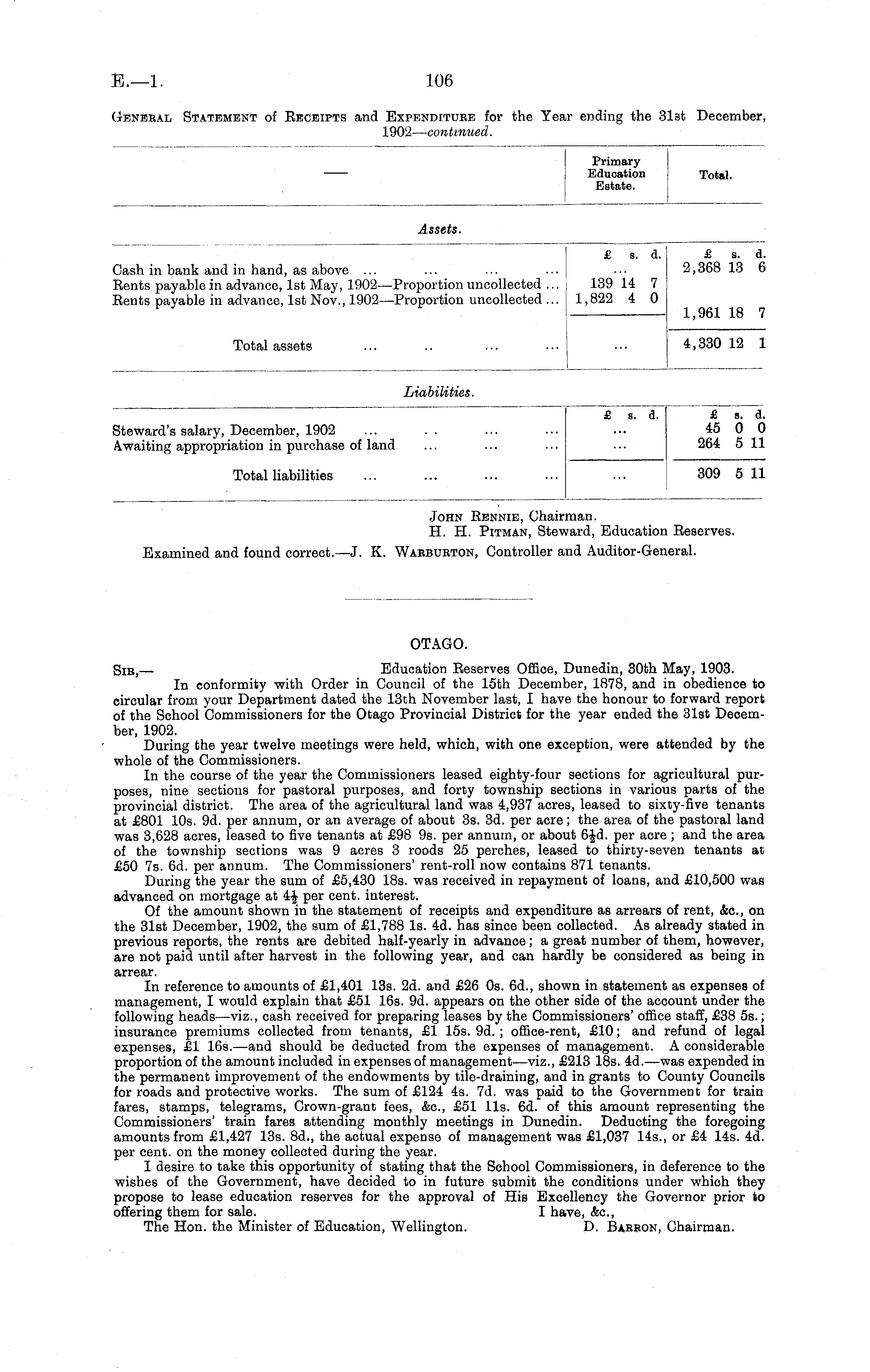 OTAGO. Sib, — Education Beserves Office, Dunedin, 30th May, 1903. In conformity with Order in Council of the 15th December, 1878, and in obedience to circular from your Department dated the 13ch November last, I have the honour to forward report of the School Commissioners for the Otago Provincial District for the year ended the 31st December, 1902. During the year twelve meetings were held, which, with one exception, were attended by the whole of the Commissioners. In the course of the year the Commissioners leased eighty-four sections for agricultural purposes, nine sections for pastoral purposes, and forty township sections in various parts of the provincial district. The area of the agricultural land was 4,937 acres, leased to sixty-five tenants at £801 10s. 9d. per annum, or an average of about 3s. 3d. per acre; the area of the pastoral land was 3,628 acres, leased to five tenants at £98 9s. per annum, or about per acre; and the area of the township sections was 9 acres 3 roods 25 perches, leased to thirty-seven tenants at £50 7s. 6d. per annum. The Commissioners' rent-roll now contains 871 tenants. During the year the sum of £5,430 18s. was received in repayment of loans, and £10,500 was advanced on mortgage at 4f per cent, interest. Of the amount shown in the statement of receipts and expenditure as arrears of rent, &c, on the 31st December, 1902, the sum of £1,788 Is. 4d. has since been collected. As already stated in previous reports, the rents are debited half-yearly in advance; a great number of them, however, are not paid until after harvest in the following year, and can hardly be considered as being in arrear. In reference to amounts of £1,401 13s. 2d. and £26 os. 6d., shown in statement as expenses of management, I would explain that £51 16s. 9d. appears on the other side of the account under the following heads—viz., cash received for preparing leases by the Commissioners' office staff, £38 55.; insurance premiums collected from tenants, £1 15s. 9d.; office-rent, £10; and refund of legal expenses, £1 16s. —and should be deducted from the expenses of management. A considerable proportion of the amount included in expenses of management—viz., £213 18s. 4d.—was expended in the permanent improvement of the endowments by tile-draining, and in grants to County Councils for roads and protective works. The sum of £124 4s. 7d. was paid to the Government for train fares, stamps, telegrams, Crown-grant fees, &c, £51 11s. 6d. of this amount representing the Commissioners' train fares attending monthly meetings in Dunedin. Deducting the foregoing amounts from £1,427 13s. Bd., the actual expense of management was £1,037 145., or £4 14s. 4d. per cent, on the money collected during the year. I desire to take this opportunity of stating that the School Commissioners, in deference to the wishes of the Government, have decided to in future submit the conditions under which they propose to lease education reserves for the approval of His Excellency the Governor prior to offering them for sale. I have, &c, The Hon. the Minister of Education, Wellington. D. Barron, Chairman.