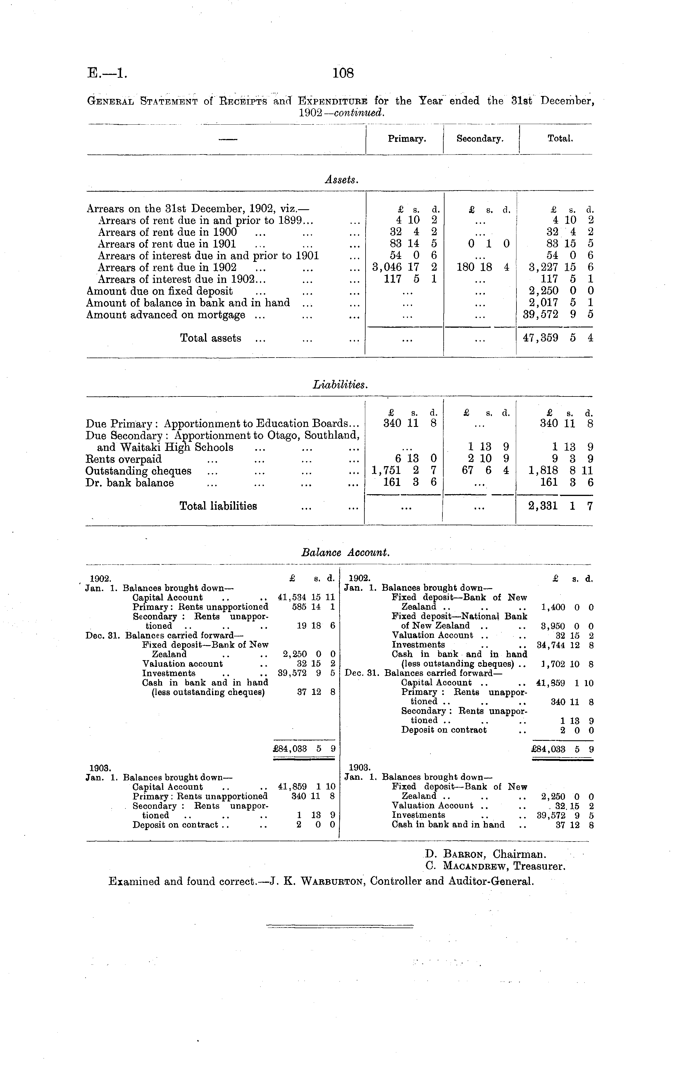 Primary. Secondary. Total. Assets. Arrears on the 31st December, 1902, viz.— Arrears of rent due in and prior to 1899... Arrears of rent due in 1900 Arrears of rent due in 1901 Arrears of interest due in and prior to 1901 Arrears of rent due in 1902 Arrears of interest due in 1902... Amount due on fixed deposit Amount of balance in bank and in hand ... Amount advanced on mortgage ... £ s. 4 10 32 4 83 14 54 0 3,046 17 117 5 d. 2 2 5 6 2 1 £ s. d. 0 10 180 18 4 £ s. 4 10 32 4 83 15 54 0 3,227 15 117 5 2,250 0 2,017 5 39,572 9 d. 2 2 5 6 6 1 0 1 5 Total assets 47,359 5 4: Liabilities >ue Primary : Apportionment to Education Boards... >ue Secondary : Apportionment to Otago, Southland, and "Waitaki High Schools ients overpaid Outstanding cheques >r. bank balance £ s. 340 11 d. 8 £ s. d. £ s. d. 340 11 8 6 13 1,751 2 161 3 0 7 6 1 13 9 2 10 9 67 6 4 1 13 9 9 3 9 1,818 8 11 161 3 6 Total liabilities 2,331 1 7 Balanci Ac< tount. 1902. Jan. 1. Balances brought down—• Capital Account Primary: Bents unapportioned Secondary : Bents unapportioned Dec. 31. Balances carried forward— Fixed deposit—Bank of New Zealand Valuation account Investments Cash in bank and in hand (less outstanding cheques) £ s. d. 41,534 15 11 585 14 1 19 18 6 2,250 0 0 32 15 2 39,572 9 5 37 12 8 1902. £ s. d. Jan. 1. Balances brought down— Fixed deposit—Bank of New Zealand .. .. .. 1,400 0 0 Fixed deposit—National Bank of New Zealand .. .. 3,950 0 0 Valuation Account .. .. 32 15 2 Investments .. .. 34,744 12 8 Cash in bank and in hand (less outstanding cheques) .. ],702 10 8 Dec. 31. Balances carried forward— Capital Account .. .. 41,S5'J 1 10 Primary : Bents unapportioned .. .. .. 340 11 8 Secondary : Bents unapportioned .. .. .. 1 13 9 Deposit on contraot .. 2 0 0 19( Jan £84,033 5 9 £84,033 5 9 1903. Jan. 1. Balances brought down— Capital Account Primary: Bents unapportioned Secondary : Rents unapportioned Deposit on contract .. 41,859 1 10 340 11 8 1 13 9 2 0 0 1903. Jan. 1. Balances brought down— Fixed deposit—Bank of New Zealand .. .. .. 2,250 0 0 Valuation Account .. .. 32.15 2 Investments .. .. 39,572 9 5 Cash in bank and in hand .. 37 12 8