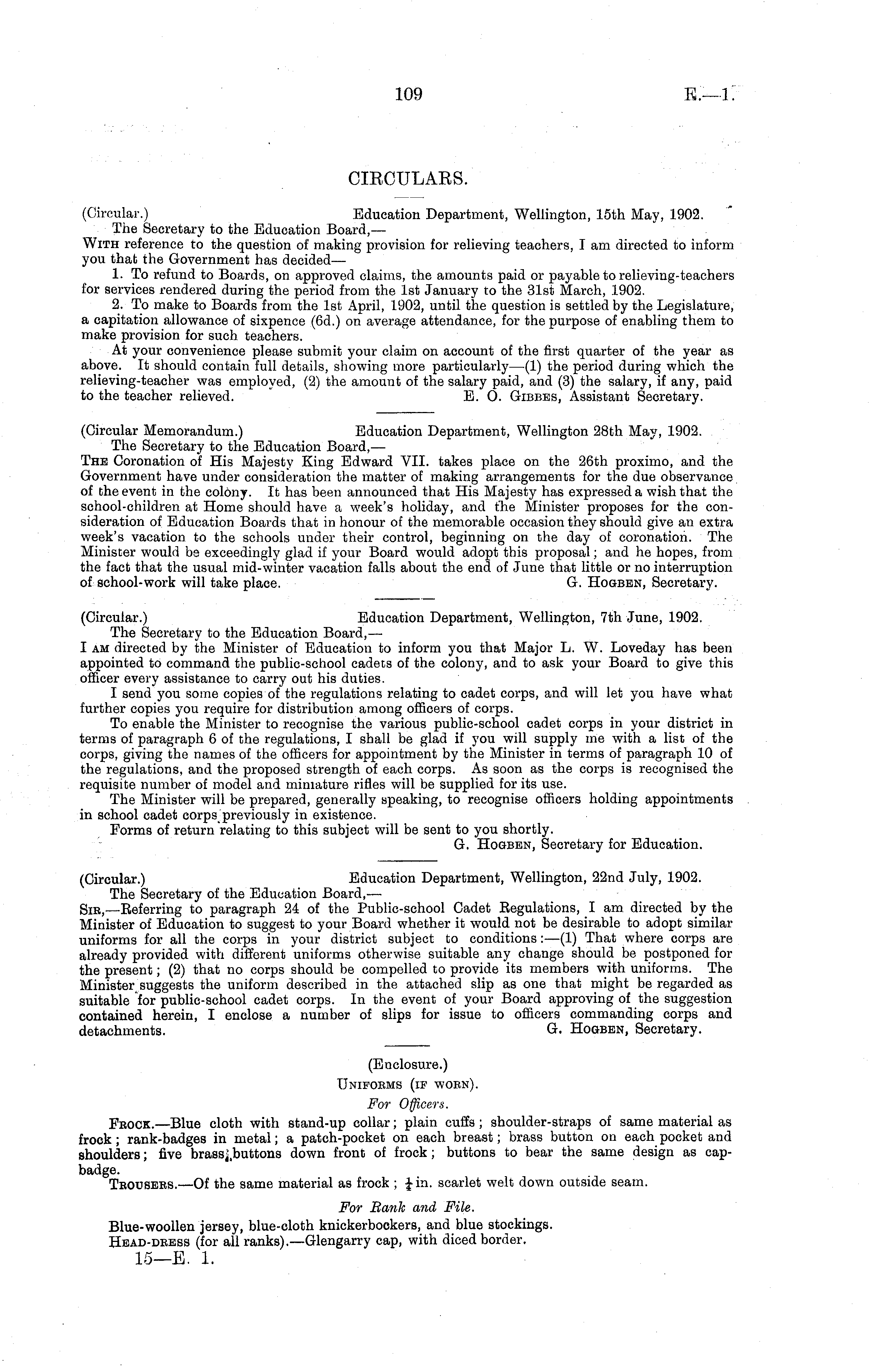 (Circular.) Education Department, Wellington, 22nd July, 1902. The Secretary of the Education Board, — Sib, —Referring to paragraph 24 of the Public-school Cadet Regulations, I am directed by the Minister of Education to suggest to your Board whether it would not be desirable to adopt similar uniforms for all the corps in your district subject to conditions: —(1) That where corps are already provided with different uniforms otherwise suitable any change should be postponed for the present; (2) that no corps should be compelled to provide its members with uniforms. The Minister suggests the uniform described in the attached slip as one that might be regarded as suitable for public-school cadet corps. In the event of your Board approving of the suggestion contained herein, I enclose a number of slips for issue to officers commanding corps and detachments. G. Hogben, Secretary.