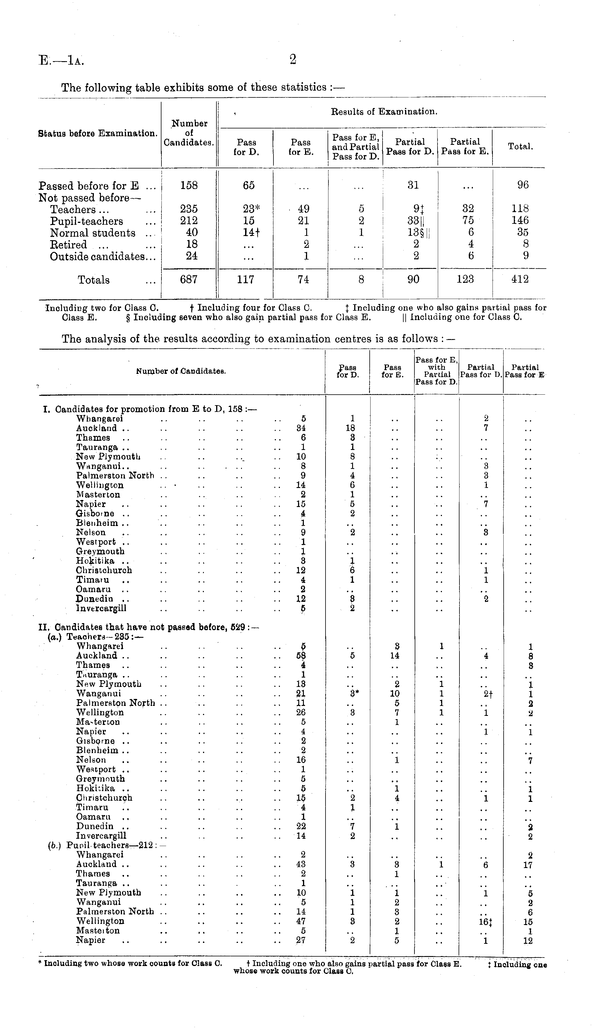 Results of Examination. Itatus before Examination. Number of Candidates. PassforE par ' ial and Partial p ag8 foc D. Pass for D. Pass forD. Pass for E. Partial Pass for E. Total. 'assed before for E ... lot passed before— Teachers ... Pupil-teachers Normal students .. Retired ... Outside candidates... 158 65 31 96 235 212 40 18 24 23* 15 14t 49 21 1 2 1 5 2 1 9! 33|| 1351! 2 2 32 75 6 4 6 118 146 35 8 9 Totals 687 117 74 8 90 123 412