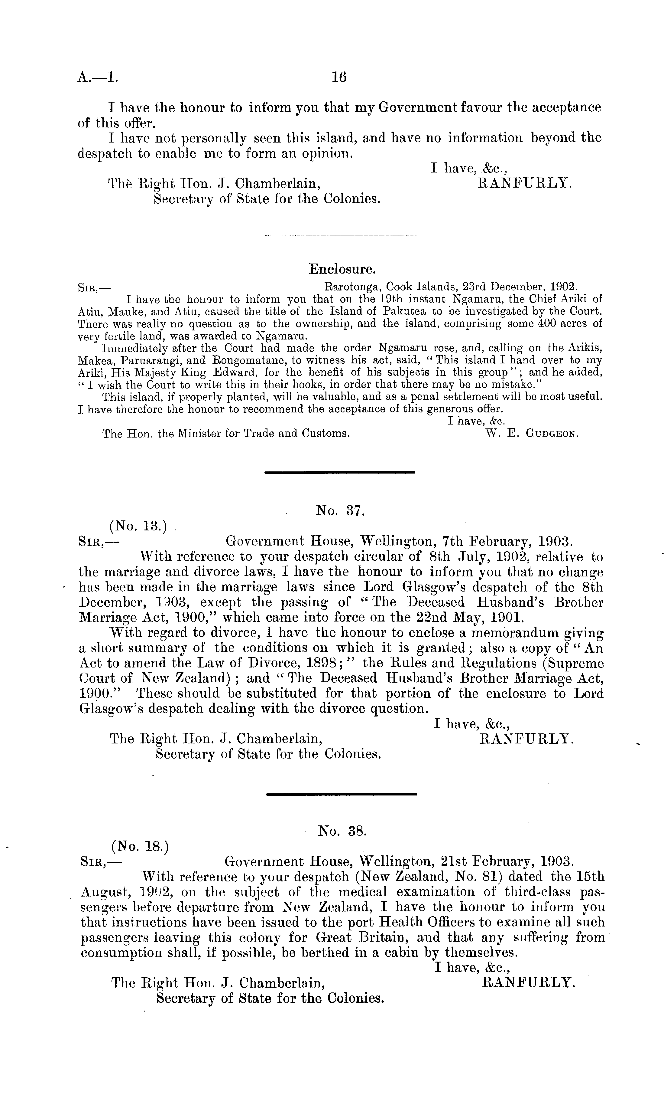 No. 38. (No. 18.) Sir, — Government House, Wellington, 21st February, 1903. With reference to your despatch (New Zealand, No. 81) dated the 15th August, 1902, on the subject of the medical examination of third-class passengers before departure from New Zealand, I have the honour to inform you that instructions have been issued to the port Health Officers to examine all such passengers leaving this colony for Great Britain, and that any suffering from consumption shall, if possible, be berthed in a cabin by themselves. I have, &c, The Right Hon. J. Chamberlain, RANFURLY. Secretary of State for the Colonies.