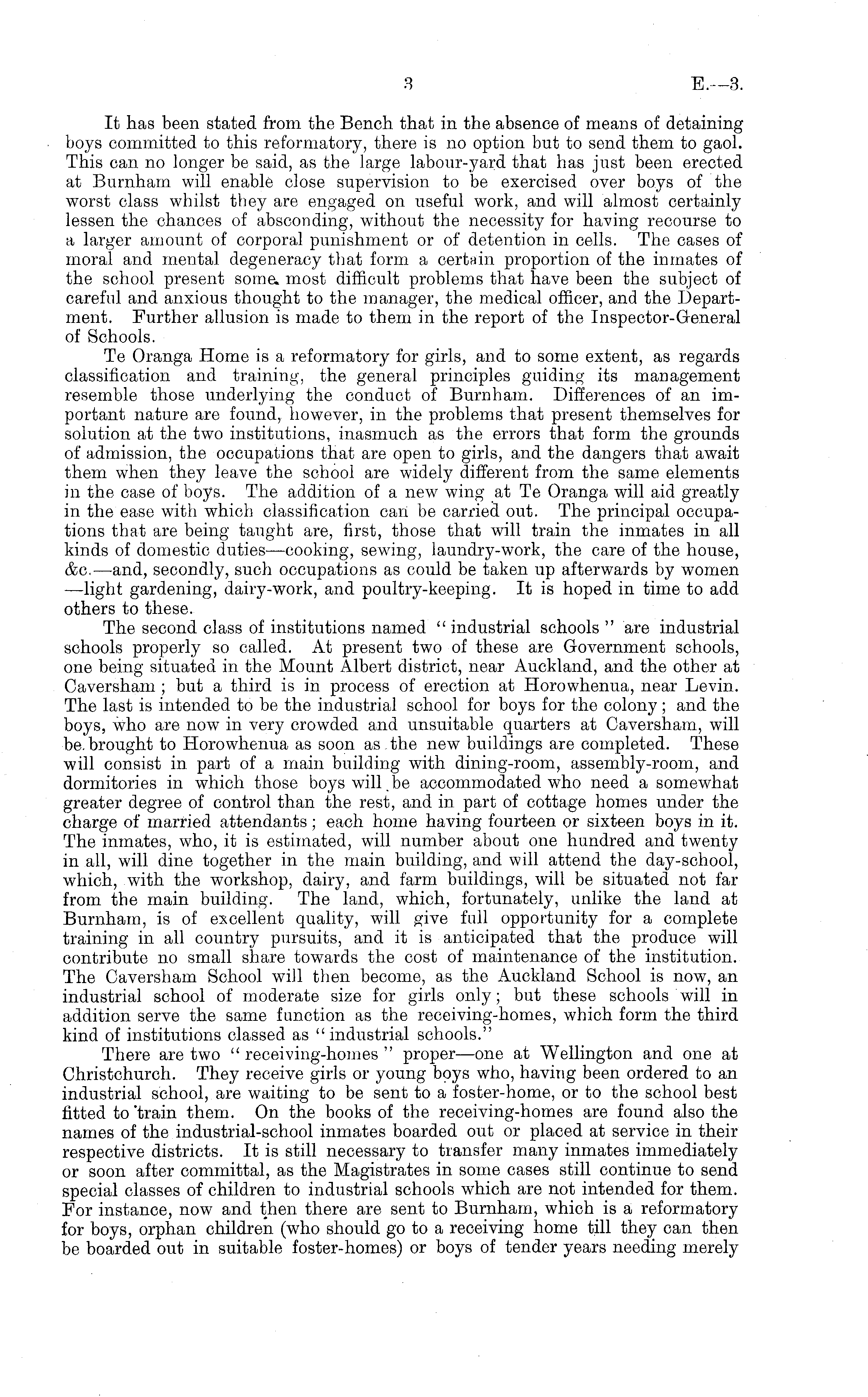 It has been stated from the Bench that in the absence of means of detaining boys committed to this reformatory, there is no option but to send them to gaol. This can no longer be said, as the large labour-yard that has just been erected at Burnham will enable close supervision to be exercised over boys of the worst class whilst they are engaged on useful work, and will almost certainly lessen the chances of absconding, without the necessity for having recourse to a larger amount of corporal punishment or of detention in cells. The cases of moral and mental degeneracy that form a certain proportion of the inmates of the school present soma most difficult problems that have been the subject of careful and anxious thought to the manager, the medical officer, and the Department. Further allusion is made to them in the report of the Inspector-General of Schools. Te Oranga Home is a reformatory for girls, and to some extent, as regards classification and training, the general principles guiding its management resemble those underlying the conduct of Burnham. Differences of an important nature are found, however, in the problems that present themselves for solution at the two institutions, inasmuch as the errors that form the grounds of admission, the occupations that are open to girls, and the dangers that await them when they leave the school are widely different from the same elements in the case of boys. The addition of a new wing at Te Oranga will aid greatly in the ease with which classification can be carried out. The principal occupations that are being taught are, first, those that will train the inmates in all kinds of domestic duties—cooking, sewing, laundry-work, the care of the house, &c-—and, secondly, such occupations as could be taken up afterwards by women —light gardening, dairy-work, and poultry-keeping. It is hoped in time to add others to these. The second class of institutions named " industrial schools " are industrial schools properly so called. At present two of these are Government schools, one being situated in the Mount Albert district, near Auckland, and the other at Caversham ; but a third is in process of erection at Horowhenua, near Levin. The last is intended to be the industrial school for boys for the colony ; and the boys, who are now in very crowded and unsuitable quarters at Caversham, will be. brought to Horowhenua as soon as the new buildings are completed. These will consist in part of a main building with dining-room, assembly-room, and dormitories in which those boys will .be accommodated who need a somewhat greater degree of control than the rest, and in part of cottage homes under the charge of married attendants ; each home having fourteen or sixteen boys in it. The inmates, who, it is estimated, will number about one hundred and twenty in all, will dine together in the main building, and will attend the day-school, which, with the workshop, dairy, and farm buildings, will be situated not far from the main building. The land, which, fortunately, unlike the land at Burnham, is of excellent quality, will give full opportunity for a complete training in all country pursuits, and it is anticipated that the produce will contribute no small share towards the cost of maintenance of the institution. The Caversham School will then become, as the Auckland School is now, an industrial school of moderate size for girls only; but these schools will in addition serve the same function as the receiving-homes, which form the third kind of institutions classed as "industrial schools." There are two " receiving-homes " proper —one at Wellington and one at Christchurch. They receive girls or young boys who, having been ordered to an industrial school, are waiting to be sent to a foster-home, or to the school best fitted to 'train them. On the books of the receiving-homes are found also the names of the industrial-school inmates boarded out or placed at service in their respective districts. It is still necessary to transfer many inmates immediately or soon after committal, as the Magistrates in some cases still continue to send special classes of children to industrial schools which are not intended for them. For instance, now and then there are sent to Burnham, which is a reformatory for boys, orphan children (who should go to a receiving home till they can then be boarded out in suitable foster-homes) or boys of tender years needing merely