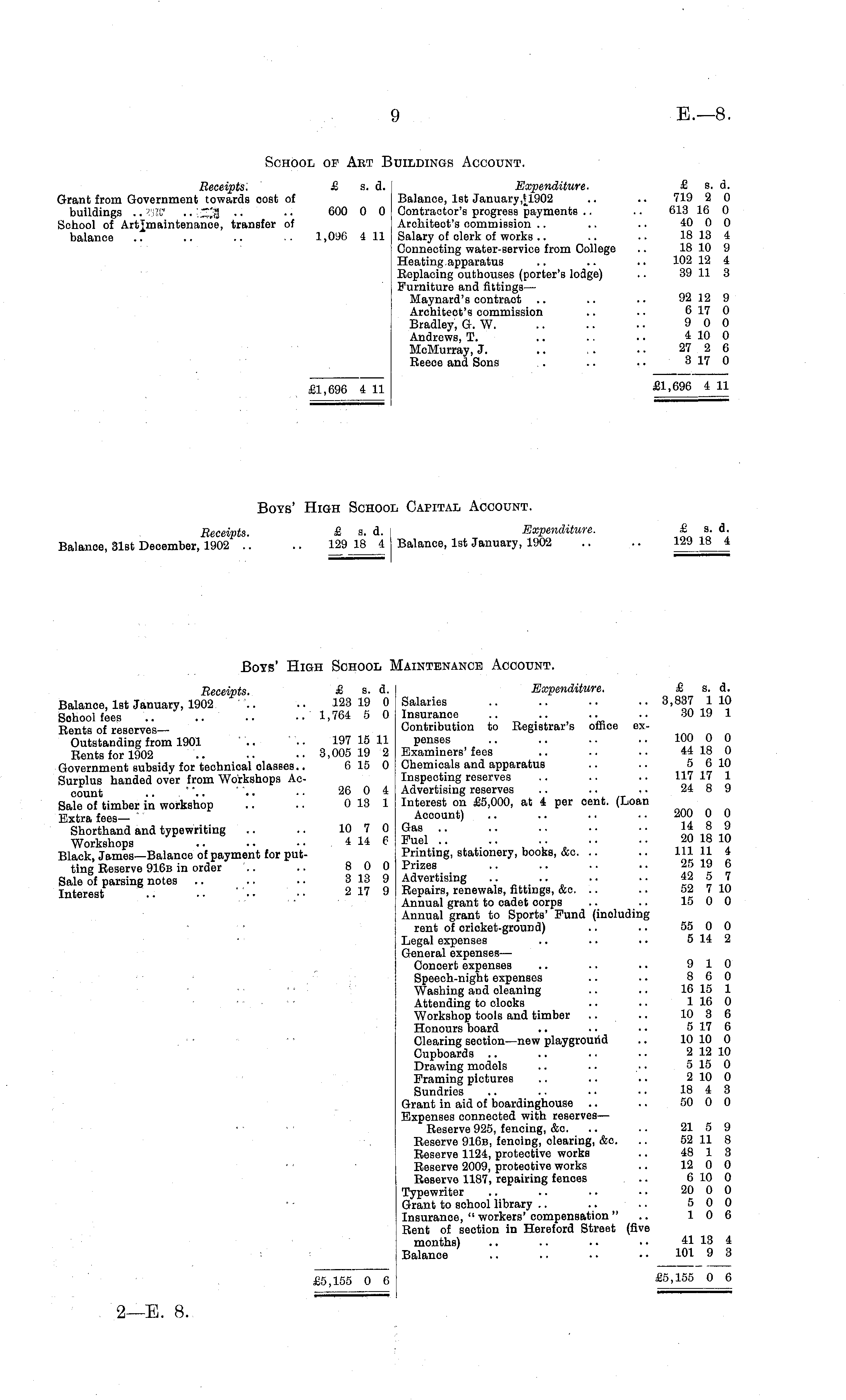 Boys' High School Capital Account. Receipts. £ s. d. Expenditure. £ s. d. Balance, 31st December, 1902 .. .. 129 18 4 Balance, Ist January, 1902 .. .. 129 18 4
