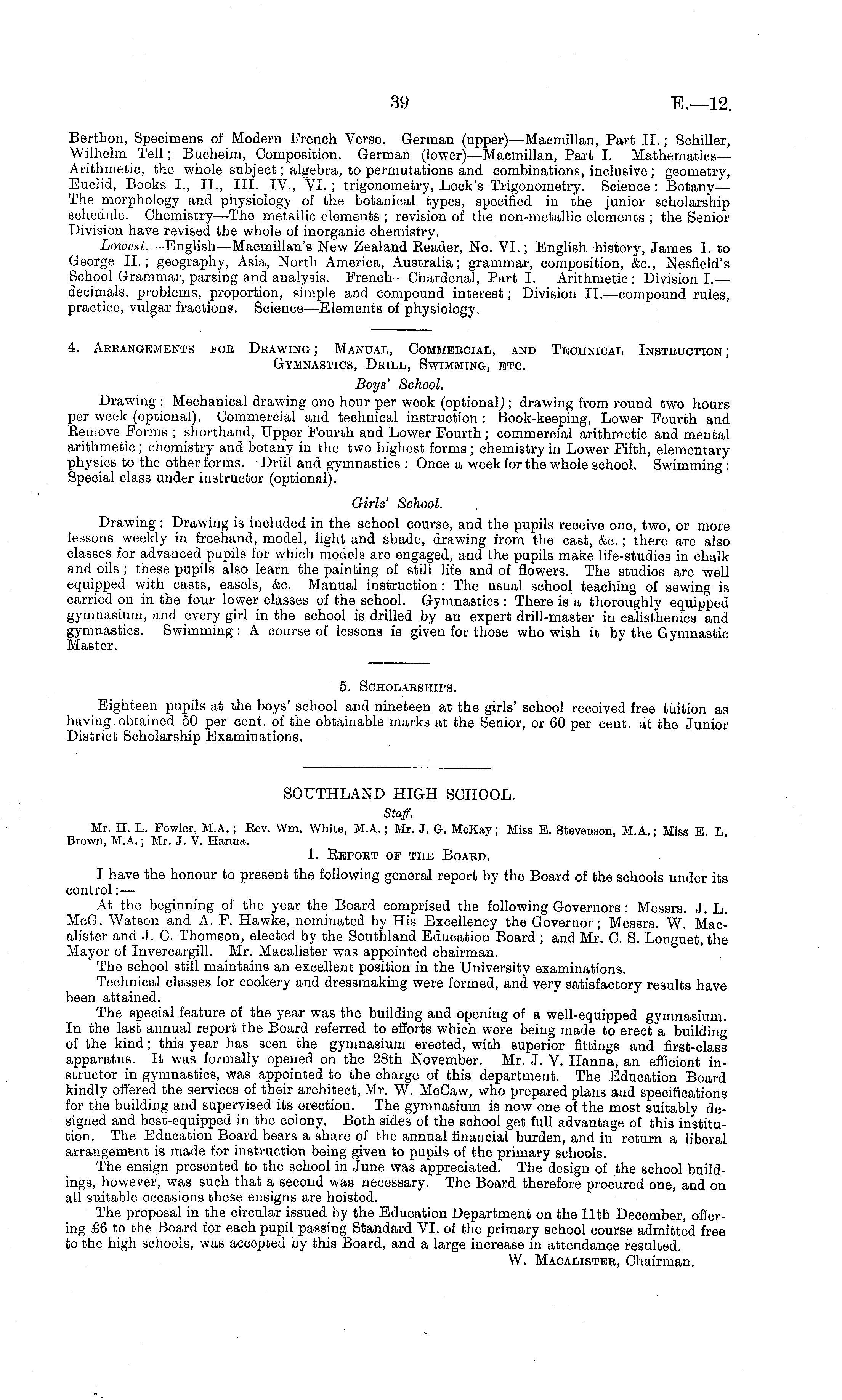 SOUTHLAND HIGH SCHOOL. Staff. Mr. H. L. Fowler, M.A. ; Rev. Wm. White, M.A.; Mr. J. G. McKay; Miss E. Stevenson, M.A.; Miss E L Brown, M.A.; Mr. J. V. Hanna. 1. Report of the Board. I have the honour to present the following general report by the Board of the schools under its control: — At the beginning of the year the Board comprised the following Governors : Messrs. J. L. McG. Watson and A. F. Hawke, nominated by His Excellency the Governor; Messrs. W. Macalister and J. C. Thomson, elected by.the Southland Education Board ; and Mr. C. S. Longuet, the Mayor of Invercargill. Mr. Macalister was appointed chairman. The school still maintains an excellent position in the University examinations. Technical classes for cookery and dressmaking were formed, and very satisfactory results have been attained. The special feature of the year was the building and opening of a well-equipped gymnasium. In the last annual report the Board referred to efforts which were being made to erect a building of the kind; this year has seen the gymnasium erected, with superior fittings and first-class apparatus. It was formally opened on the 28th November. Mr. J. V. Hanna, an efficient instructor in gymnastics, was appointed to the charge of this department. The Education Board kindly offered the services of their architect, Mr. W. McCaw, who prepared plans and specifications for the building and supervised its erection. The gymnasium is now one of the most suitably designed and best-equipped in the colony. Both sides of the school get full advantage of this institution. The Education Board bears a share of the annual financial burden, and in return a liberal arrangement is made for instruction being given to pupils of the primary schools. The ensign presented to the school in June was appreciated. The design of the school buildings, however, was such that a second was necessary. The Board therefore procured one, and on all suitable occasions these ensigns are hoisted. The proposal in the circular issued by the Education Department on the 11th December, offering £6 to the Board for each pupil passing Standard VI. of the primary school course admitted free to the high schools, was accepted by this Board, and a large increase in attendance resulted. W. Macalister, Chairman,