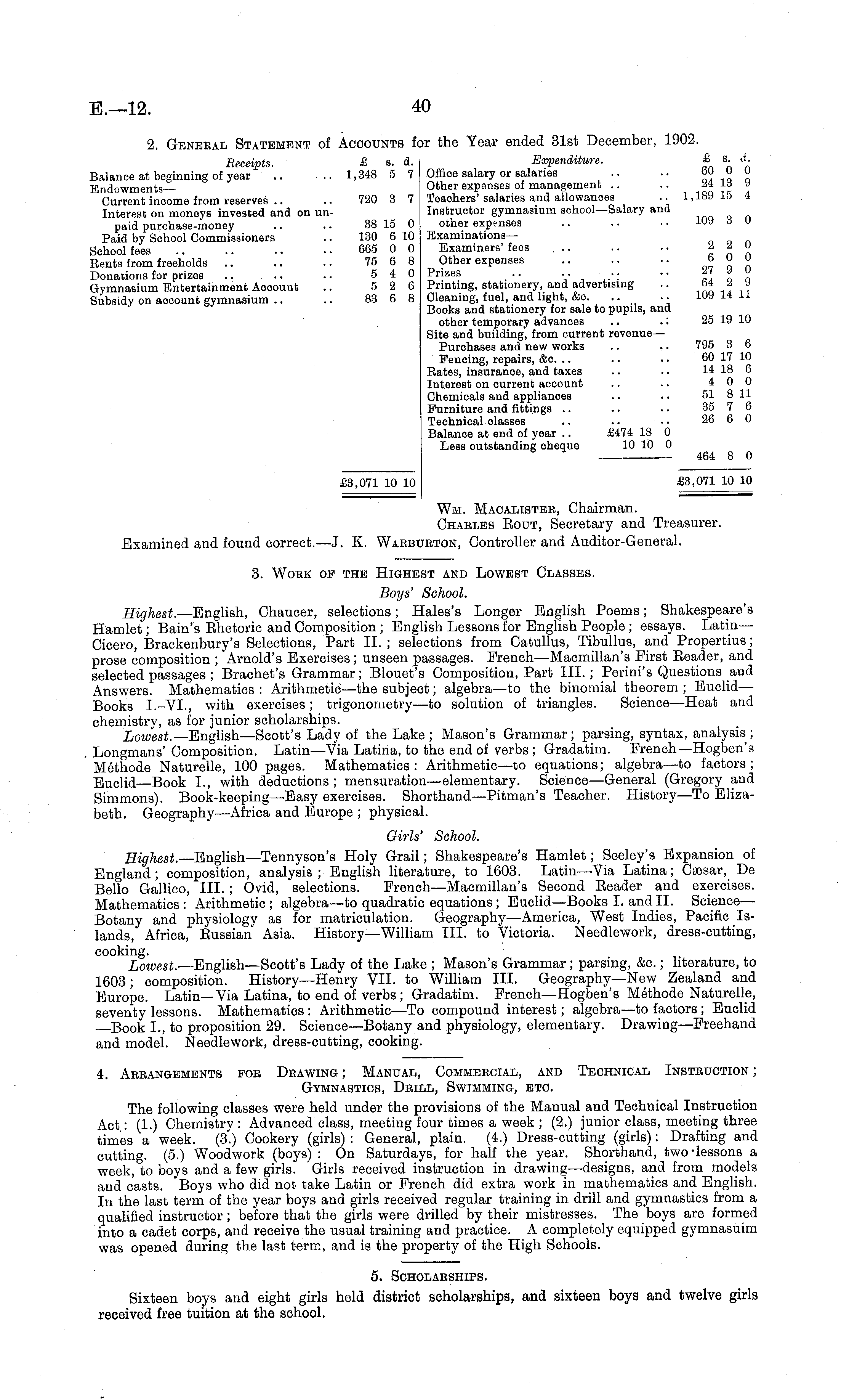 3. Work of the Highest and Lowest Classes. Boys' School. Highest. —English, Chaucer, selections; Hales's Longer English Poems; Shakespeare's Hamlet; Bain's Bhetoric and Composition ; English Lessons for English People; essays. LatinCicero, Brackenbury's Selections, Part 11. ; selections from Catullus, Tibullus, and Propertius; prose composition ; Arnold's Exercises; unseen passages. French —Macmillan's First Beader, and selected passages ; Brachet's Grammar; Blouet's Composition, Part HI.; Perini's Questions and Answers. Mathematics : Arithmetic—the subject; algebra—to the binomial theorem ; Euclid— Books 1.-VI., with exercises; trigonometry—to solution of triangles. Science —Heat and chemistry, as for junior scholarships. Lowest. —English—Scott's Lady of the Lake; Mason's Grammar; parsing, syntax, analysis; Longmans'Composition. Latin—Via Latina, to the end of verbs ; Gradatim. French—Hogben's Methode Naturelle, 100 pages. Mathematics: Arithmetic —to equations; algebra —to factors; Euclid —Book 1., with deductions ; mensuration—elementary. Science —General (Gregory and Simmons). Book-keeping —Easy exercises. Shorthand —Pitman's Teacher. History —To Elizabeth. Geography —Africa and Europe ; physical. Girls' School. Highest. —English—Tennyson's Holy Grail; Shakespeare's Hamlet; Seeley's Expansion of England; composition, analysis; English literature, to 1603. Latin—Via Latina; Caesar, De Bello Gallico, 111. ; Ovid, selections. French —Macmillan's Second Beader and exercises. Mathematics : Arithmetic ; algebra—to quadratic equations; Euclid—Books I. and 11. Science—■ Botany and physiology as for matriculation. Geography —America, West Indies, Pacific Islands, Africa, Bussian Asia. History—William 111. to Victoria. Needlework, dress-cutting, cooking. Lowest. —English —Scott's Lady of the Lake ; Mason's Grammar; parsing, &c.; literature, to 1603; composition. History—Henry VII. to William 111. Geography—New Zealand and Europe. Latin— Via Latina, to end of verbs; Gradatim. French—Hogben's Methode Naturelle, seventy lessons. Mathematics : Arithmetic—To compound interest; algebra—to factors; Euclid Book 1., to proposition 29. Science —Botany and physiology, elementary. Drawing—Freehand and model. Needlework, dress-cutting, cooking. 4. Arrangements for Drawing ; Manual, Commercial, and Technical Instruction ; Gymnastics, Drill, Swimming, etc. The following classes were held under the provisions of the Manual and Technical Instruction Act: (1.) Chemistry : Advanced class, meeting four times a week ; (2.) junior class, meeting three times a week. (3*.) Cookery (girls) : General, plain. (4.) Dress-cutting (girls): Drafting and cutting. (5.) Woodwork (boys) :On Saturdays, for half the year. Shorthand, two-lessons a week, to boys and a few girls. Girls received instruction in drawing—designs, and from models and casts. Boys who did not take Latin or French did extra work in mathematics and English. In the last term of the year boys and girls received regular training in drill and gymnastics from a qualified instructor; before that the girls were drilled by their mistresses. The boys are formed into a cadet corps, and receive the usual training and practice. A completely equipped gymnasuim was opened during the last term, and is the property of the High Schools.