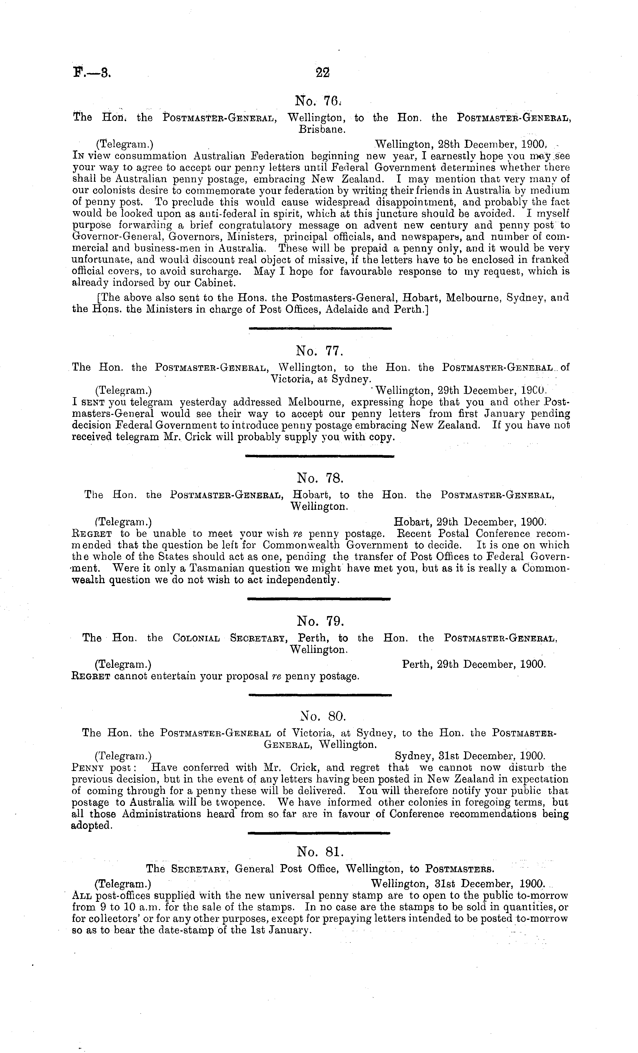No. 76. The Hob, the Postmastee-Geneeal, Wellington, to the Hon. the Postmaster-Genebal, Brisbane. (Telegram.) . Wellington, 28th December, 1900 ; ■ In view consummation Australian Federation beginning new year, I earnestly hope you nray.see your way to agree to accept our penny letters until Federal Government determines whether there shall be Australian penny postage, embracing New Zealand. I may mention that very many of our colonists desire to commemorate your federation by writing their friends in Australia by medium of penny post. To preclude this would cause widespread disappointment, and probably the fact would be looked upon as anti-federal in spirit, which at this juncture should be avoided. I myself purpose forwarding a brief congratulatory message on advent new century and penny post to Governor-General, Governors, Ministers, principal officials, and newspapers, and number of commercial and business-men in Australia. These will be prepaid a penny only, and it would be very unfortunate, and would discount real object of missive, if the letters have to be enclosed in franked official covers, to avoid surcharge. May I hope for favourable response to my request, which is already indorsed by our Cabinet. [The above also sent to the Hons. the Postmasters-General, Hobart, Melbourne, Sydney, and the Hons. the Ministers in charge of Post Offices, Adelaide and Perth.]