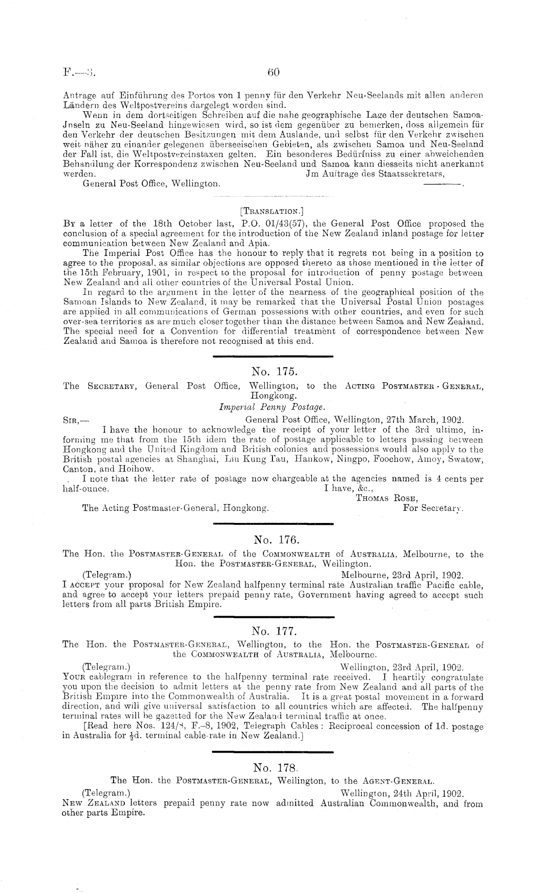 No. 178. The Hon. the Postmaster-General, Wellington, to the Agent-General. (Telegram.) Wellington, 24th April, 1902. New Zealand letters prepaid penny rate now admitted Australian Commonwealth, and from other parts Empire.