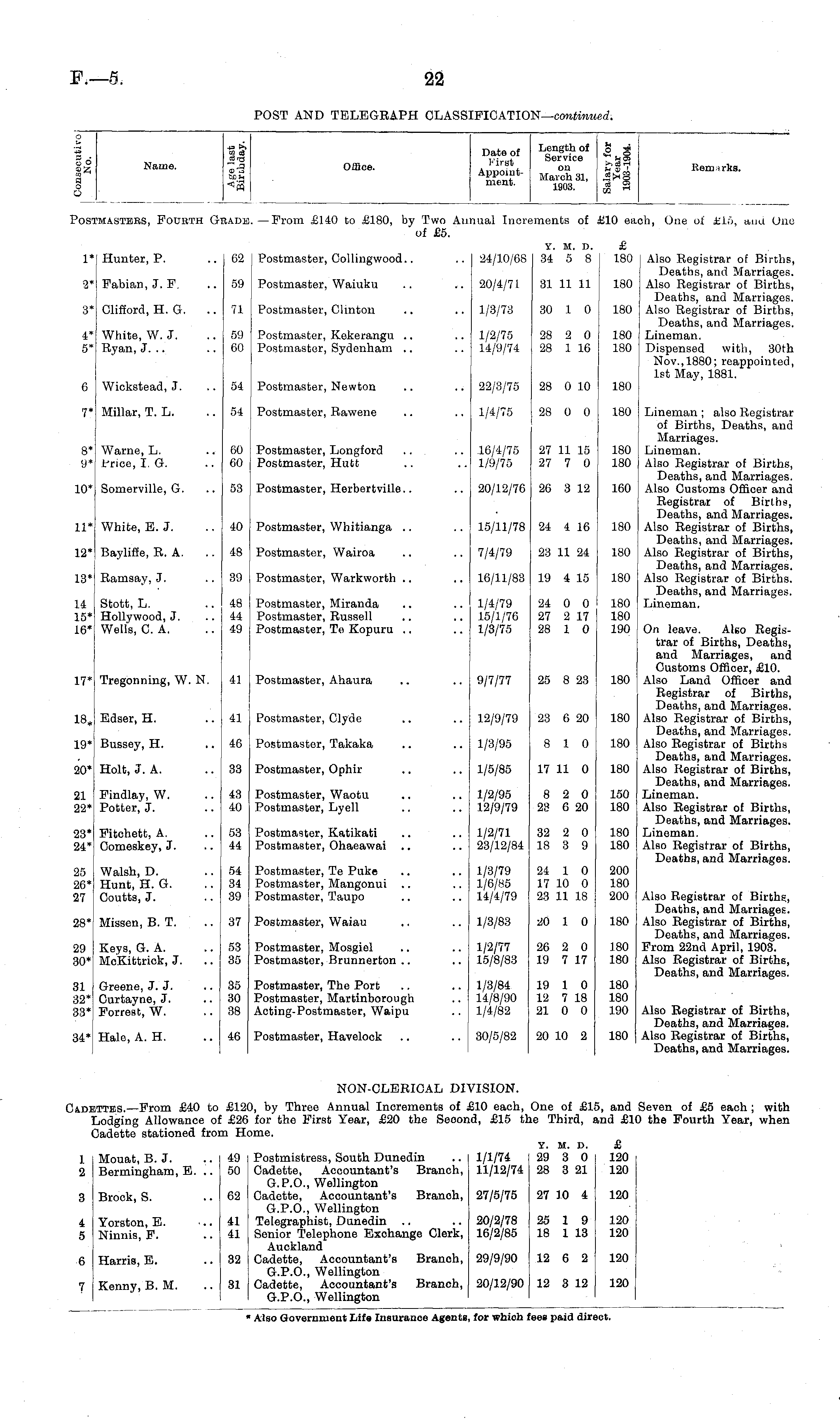 o a o Q Name. 4= t» co c3 c3t3 Office. Date of First Appointment. Length of o g Service T^ 01 on C| i March 31, .Stxg 1903. £ S Remarks. Pels': toasters, Fourth Grade .—From £140 to £180, by Two Alii of £5. nual Increments of B10 eai 3h, One of £16, and One 1ADE | Hunter, P. .. 62 Postmaster, Collingwood.. Y. M. D. 24/10/68 34 5 8 £ 180 ! Also Registrar of Births, Deaths, and Marriages. Also Registrar of Births, Deaths, and Marriages. Also Registrar of Births, Deaths, and Marriages. Lineman. Dispensed with, 30th Nov., 1880; reappointed, 1st May, 1881. 1* 62 2* ' Fabian, J. F. .. 59 59 Postmaster, Waiuku 20/4/71 31 11 11 180 3* [ Clifford, H. G. .. 71 71 Postmaster, Clinton 1/3/73 30 1 0 180 4* 5* White, W. J. .. 59 Ryan, J. .. .. 60 59 60 Postmaster, Kekerangu Postmaster, Sydenham 1/2/75 28 2 0 14/9/74 28 1 16 180 180 6 Wiokstead, J. .. 54 54 Postmaster, Newton 22/8/75 28 0 10 180 8* 9* 10* 7* Millar, T. L. .. 54 Warne, L. 60 Price, I. G. .. 60 Somerville, G. 53 54 60 60 58 Postmaster, Rawene Postmaster, Longford Postmaster, Hutt Postmaster, Herbertville 1/4/75 28 0 0 .16/4/75 27 11 15 1/9/75 27 7 0 20/12/76 26 3 12 180 180 180 160 Lineman ; also Registrar of Births, Deaths, and Marriages. Lineman. Also Registrar of Births, Deaths, and Marriages. Also Customs Officer and Registrar of Births, Deaths, and Marriages. Also Registrar of Births, Deaths, and Marriages. Also Registrar of Births, Deaths, and Marriages. Also Registrar of Births. Deaths, and Marriages. Lineman. 11* White, E. J. .. 40 10 Postmaster, Whitianga 15/11/78 24 4 16 180 12* Baylifie, R. A. .. 48 48 Postmaster, Wairoa 7/4/79 23 11 24 180 13* Ramsay, J. 39 39 Postmaster, Warkworth 16/11/83 19 4 15 180 14 15* 16* Stott, L. .. 48 Hollywood, J. .. 44 Wells, C. A. .. 49 48 44 49 Postmaster, Miranda Postmaster, Russell Postmaster, Te Kopuru 1/4/79 24 0 0 15/1/76 27 2 17 1/3/75 28 1 0 180 180 190 17* 18* 19*| Tregonning, W. N. 41 Edser, H. ..41 I i Bussey, H. .. 46 41 46 41 Postmaster, Ahaura Postmaster, Clyde Postmaster, Takaka 9/7/77 25 8 23 12/9/79 23 6 20 1/3/95 8 10 180 180 180 On leave. Also Registrar of Births, Deaths, and Marriages, and Customs Officer, £10. Also Land Officer and Registrar of Births, Deaths, and Marriages. Also Registrar of Births, Deaths, and Marriages. Also Registrar of Births Deaths, and Marriages. Also Registrar of Births, Deaths, and Marriages. Lineman. Also Registrar of Births, Deaths, and Marriages. Lineman. Also Registrar of Births, Deaths, and Marriages. 20* Holt, J. A. .. 33 33 Postmaster, Ophir 1/5/85 17 11 0 180 21 22* Findlay, W. .. 43 Potter, J. .. 40 43 40 Postmaster, Waotu Postmaster, Lyell 1/2/95 8 2 0 12/9/79 23 6 20 150 180 23* 24* Fitchett, A. .. 53 Comeskey, J. .. 44 53 44 Postmaster, Katikati Postmaster, Ohaeawai 1/2/71 32 2 0 23/12/84 18 3 9 180 180 25 26* 27 Walsh, D. .. 54 Hunt, H. G. .. 34 Coutts, J. .. 39 54 34 39 Postmaster, Te Puke Postmaster, Mangonui Postmaster, Taupo 1/3/79 24 1 0 1/6/85 17 10 0 14/4/79 23 11 18 200 180 200 Also Registrar of Births, Deaths, and Marriages. Also Registrar of Births, Deaths, and Marriages. From 22nd April, 1903. Also Registrar of Births, Deaths, and Marriages. 28* Missen, B. T. .. 37 37 Postmaster, Waiau 1/3/83 20 1 0 180 29 30* Keys, G. A. .. 53 McKittrick, J. .. 35 53 35 Postmaster, Mosgiel Postmaster, Brunnerton 1/2/77 26 2 0 15/8/83 19 7 17 180 180 31 32* 33* Greene, J. J. .. 35 Ourtayne, J. 30 Forrest, W. .. 38 35 30 38 Postmaster, The Port Postmaster, Martinborough Acting-Postmaster, Waipu 1/3/84 19 1 0 14/8/90 12 7 18 1/4/82 21 0 0 180 180 190 34* Hale, A. H. .. 46 46 Postmaster, Havelock 30/5/82 20 10 2 180 Also Registrar of Births, Deaths, and Marriages. Also Registrar of Births, Deaths, and Marriages. ittes.—From £40 to £121 Dodging Allowance of £26 Hadette stationed from Hi NON-CLERICAL DH VISION. Seven of £5 each ; with ) the Fourth Year, when ad: ), by Three Annual Increments of & for the First Year, £20 the Secon >me, £10 each, One of £1j id, £15 the Third, i >, and md £11 1 2 Mouat, B.J. .. 49 Bermingham, E. .. 50 Postmistress, South Dunedin Cadette, Accountant's Branch, G.P.O., Wellington Cadette, Accountant's Branch, G.P.O., Wellington Telegraphist, Dunedin Senior Telephone Exchange Clerk, Auckland Cadette, Accountant's Branch, G.P.O., Wellington Cadette, Accountant's Branch, G.P.O., Wellington Y. M. D. 1/1/74 29 3 0 11/12/74 28 3 21 £ 120 120 3 Brock, S. .. 62 27/5/75 27 10 4 120 4 5 Yorston, E. ... 41 Ninnis, F. .. 41 20/2/78 25 1 9 16/2/85 18 1 13 120 120 6 Harris, E. .. 32 29/9/90 12 6 2 120 7 Kenny, B. M. .. 31 20/12/90 12 3 12 120 * Also Government Life Insurance Agents, for which fees paid direct.