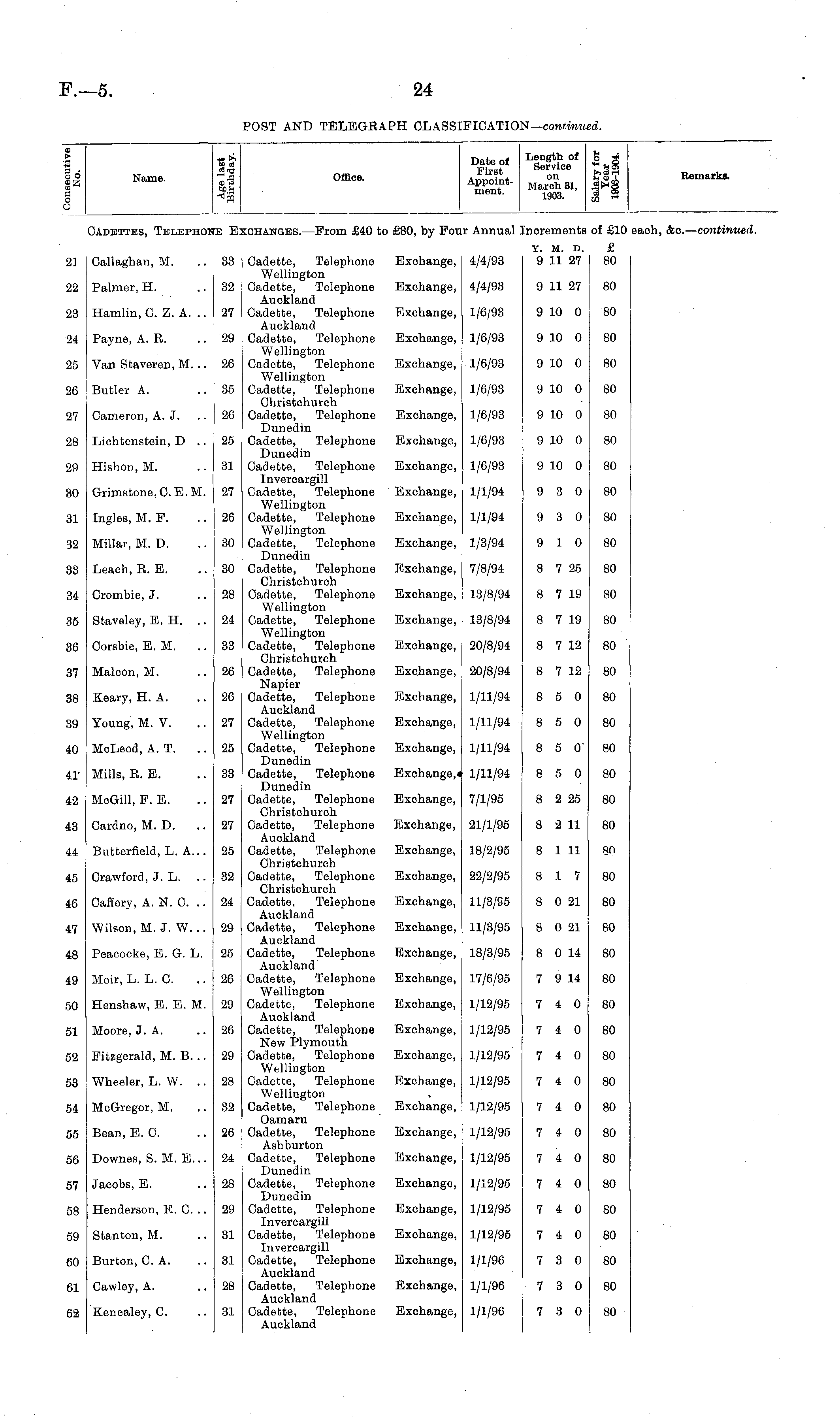 > gc CDZ cO^ a o o Name. ca d cau "a CD *o Office. Date of t>%"8to °* | S First Ser ™ e "§S A STnt nt " March 31, ling ment - 1903. J a Remarks. Cadettes, Telepho! 3 E: xhanges.—From £40 to £80, by Foi ir Annual increments of £10 each, &c — continued. Oallaghan, M. 33 Cadette, Telephone Exchange, Wellington Cadette, Telephone Exchange, Auckland Cadette, Telephone Exchange, Auckland Cadette, Telephone Exchange, Wellington Cadette, Telephone Exchange, Wellington Cadette, Telephone Exchange, Christchurch Cadette, Telephone Exchange, Dunedin Cadette, Telephone Exchange, Dunedin Cadette, Telephone Exchange, Invercargill Cadette, Telephone Exchange, Wellington Cadette, Telephone Exchange, Wellington Cadette, Telephone Exchange, Dunedin Cadette, Telephone Exchange, Christchurch Cadette, Telephone Exchange, Wellington Cadette, Telephone Exchange, Wellington Cadette, Telephone Exchange, Christchurch Cadette, Telephone Exchange, Napier Cadette, Telephone Exchange, Auckland Cadette, Telephone Exchange, Wellington Cadette, Telephone Exchange, Dunedin Cadette, Telephone Exchange,, Dunedin Cadette, Telephone Exchange, Christchurch Cadette, Telephone Exchange, Auckland Cadette, Telephone Exchange, Christchurch Cadette, Telephone Exchange, Christchurch Cadette, Telephone Exchange, Auckland Cadette, Telephone Exchange, Auckland Cadette, Telephone Exchange, Auckland Cadette, Telephone Exchange, Wellington Cadette, Telephone Exchange, Auckland Cadette, Telephone Exchange, New Plymouth Cadette, Telephone Exchange, Wellington Cadette, Telephone Exchange, Wellington Cadette, Telephone Exchange, Oamaru Cadette, Telephone Exchange, Ashburton Cadette, Telephone Exchange, Dunedin Cadette, Telephone Exchange, Dunedin Cadette, Telephone Exchange, Invercargill Cadette, Telephone Exchange, Invercargill Cadette, Telephone Exchange, Auckland Cadette, Telephone Exchange, Auckland Cadette, Telephone Exchange, Auckland 4/4/93 Y. M. d. 9 11 27 £ 80 21 22 Palmer, H. 32 4/4/93 9 11 27 80 23 Hamlin, C Z. A. 27 1/6/93 9 10 0 80 24 Payne, A. R. 29 1/6/93 9 10 0 80 25 Van Staveren, M. .. 26 1/6/93 9 10 0 80 26 Butler A. 35 1/6/93 9 10 0 80 27 Cameron, A. J. 26 1/6/93 9 10 0 80 28 Lichtenstein, D .. 25 1/6/93 9 10 0 80 29 Hishon, M. 31 1/6/93 9 10 0 80 30 Grimstone,CE.M. 27 1/1/94 9 3 0 80 31 Ingles, M. F. 26 1/1/94 9 3 0 80 32 Millar, M. D. 30 1/3/94 9 10 80 33 Leach, R. E. 30 7/8/94 8 7 25 80 34 Crombie, J. 28 13/8/94 8 7 19 80 35 Staveley, E. H. 24 13/8/94 8 7 19 80 36 Corsbie, E. M. 33 20/8/94 8 7 12 80 37 Malcon, M. 26 20/8/94 8 7 12 80 38 Keary, H. A. 26 1/11/94 8 5 0 80 39 Young, M. V. 27 1/11/94 8 5 0 80 40 McLeod, A. T. 25 1/11/94 8 5 0' 80 41 Mills, R. E. 33 1/11/94 8 5 0 80 42 McGill, F. E. 27 7/1/95 8 2 25 80 43 Cardno, M. D. 27 21/1/95 8 2 11 80 44 Butterfield, L. A... 25 18/2/95 8 1 11 80 45 Crawford, J. L. 32 22/2/95 8 17 80 46 Caffery, A. N. C 24 11/3/95 8 0 21 80 47 Wilson, M. J. W. .. 29 11/3/95 8 0 21 80 48 Peacocke, E. G. L. 25 18/3/95 8 0 14 80 49 Moir, L. L. C 26 17/6/95 7 9 14 80 50 Henshaw, E. E. M. 29 1/12/95 7 4 0 80 51 Moore, J. A. 26 1/12/95 7 4 0 80 52 Fitzgerald, M. B. .. 29 1/12/95 7 4 0 80 53 Wheeler, L. W. .. 28 1/12/95 7 4 0 80 54 McGregor, M. 32 1/12/95 7 4 0 80 55 Bean, E. C 26 1/12/95 7 4 0 80 56 Downes, S. M. E... 24 1/12/95 7 4 0 80 57 Jacobs, E. 28 1/12/95 7 4 0 80 58 Henderson, E. C .. 29 1/12/95 7 4 0 80 59 Stanton, M. 31 1/12/95 7 4 0 80 60 Burton, CA, 31 1/1/96 7 3 0 80 61 Cawley, A. 28 1/1/96 7 3 0 80 62 Kenealey, C 31 1/1/96 7 3 0 80
