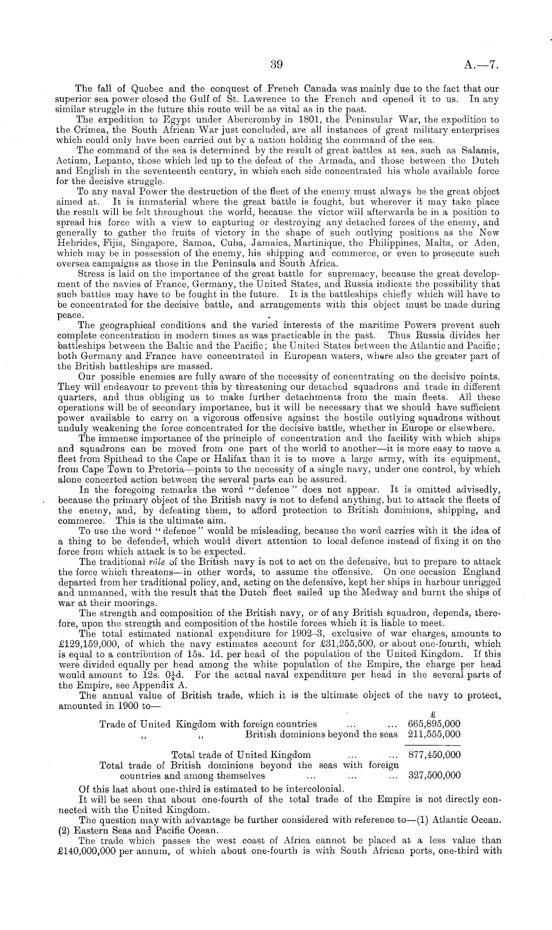The fall of Quebec and the conquest of French Canada was mainly due to the fact that our superior sea power closed the Gulf of St. Lawrence to the French and opened it to us. In any similar struggle in the future this route will be as vital as in the past. The expedition to Egypt under Abercromby in- 1801, the Peninsular War, the expedition to the Crimea, the South African War just concluded, are all instances of great military enterprises which could only have been carried out by a nation holding the command of the sea. The command of the sea is determined by the result of great battles at sea, such as Salamis, Actium, Lepanto, those which led up to the defeat of the Armada, and those between the Dutch and English in the seventeenth century, in which each side concentrated his whole available force for the decisive struggle. To any naval Power the destruction of the fleet of the enemy must always be the great object aimed at. It is immaterial where the great battle is fought, but wherever it may take place the result will be felt throughout the world, because the victor will afterwards be in a position to spread his force with a view to capturing or destroying any detached forces of the enemy, and generally to gather the fruits of victory in the shape of such outlying positions as the New Hebrides, Fijis, Singapore, Samoa, Cuba, Jamaica, Martinique, the Philippines, Malta, or Aden, which may be in possession of the enemy, his shipping and commerce, or even to prosecute such oversea campaigns as those in the Peninsula and South Africa. Stress is laid on the importance of the great battle for supremacy, because the great development of the navies of France, Germany, the United States, and Russia indicate the possibility that such battles may have to be fought in the future. It is the battleships chiefly which will have to be concentrated for the decisive battle, and arrangements with this object must be made during peace. The geographical conditions and the varied interests of the maritime Powers prevent such complete concentration in modern times as was practicable in the past. Thus Russia divides her battleships between the Baltic and the Pacific; the United States between the Atlantic and Pacific; both Germany and France have concentrated in European waters, where also the greater part of the British battleships are massed. Our possible enemies are fully aware of the necessity of concentrating on the decisive points. They will endeavour to prevent this by threatening our detached squadrons and trade in different quarters, and thus obliging us to make further detachments from the main fleets. All these operations will be of secondary importance, but it will be necessary that we should have sufficient power available to carry on a vigorous offensive against the hostile outlying squadrons without unduly weakening the force concentrated for the decisive battle, whether in Europe or elsewhere. The immense importance of the principle of concentration and the facility with which ships and squadrons can be moved from one part of the world to another—it is more easy to move a fleet from Spithead to the Cape or Halifax than it is to move a large army, with its equipment, from Cape Town to Pretoria —points to the necessity of a single navy, under one control, by which alone concerted action between the several parts can be assured. In the foregoing remarks the word " defence " does not appear. It is omitted advisedly, because the primary object of the British navy is not to defend anything, but to attack the fleets of the enemy, and, by defeating them, to afford protection to British dominions, shipping, and commerce. This is the ultimate aim. To use the word " defence " would be misleading, because the word carries with it the idea of a thing to be defended, which would divert attention to local defence instead of fixing it on the force from which attack is to be expected. The traditional role of the British navy is not to act on the defensive, but to prepare to attack the force which threatens —in other words, to assume the offensive. On one occasion England departed from her traditional policy, and, acting on the defensive, kept her ships in harbour unrigged and unmanned, with the result that the Dutch fleet sailed up the Medway and burnt the ships of war at their moorings. The strength and composition of the British navy, or of any British squadron, depends, therefore, upon the strength and composition of the hostile forces which it is liable to meet. The total estimated national expenditure for 1902-3, exclusive of war charges, amounts to £129,159,000, of which the navy estimates account for £31,255,500, or about one-fourth, which is equal to a contribution of 15s. Id. per head of the population of the United Kingdom. If this were divided equally per head among the white population of the Empire, the charge per head would amount to 12s. OJd. For tbe actual naval expenditure per head in the several parts of the Empire, see Appendix A. The annual value of British trade, which it is the ultimate object of the navy to protect, amounted in 1900 to — £ Trade of United Kingdom with foreign countries ... ... 665,895,000 ~ ~ British dominions beyond the seas 211,555,000 Total trade of United Kingdom ... ... 877,450,000 Total trade of British dominions beyond the seas with foreign countries and among themselves ... ... ... 327,500,000 Of this last about one-third is estimated to be intercolonial. It will be seen that about one-fourth of the total trade of the Empire is not directly connected with the United Kingdom. The question may with advantage be further considered with reference to—(1) Atlantic Ocean. (2) Eastern Seas and Pacific Ocean. The trade which passes the west coast of Africa cannot be placed at a less value than £140,000,000 per annum, of which about one-fourth is with South African ports, one-third with